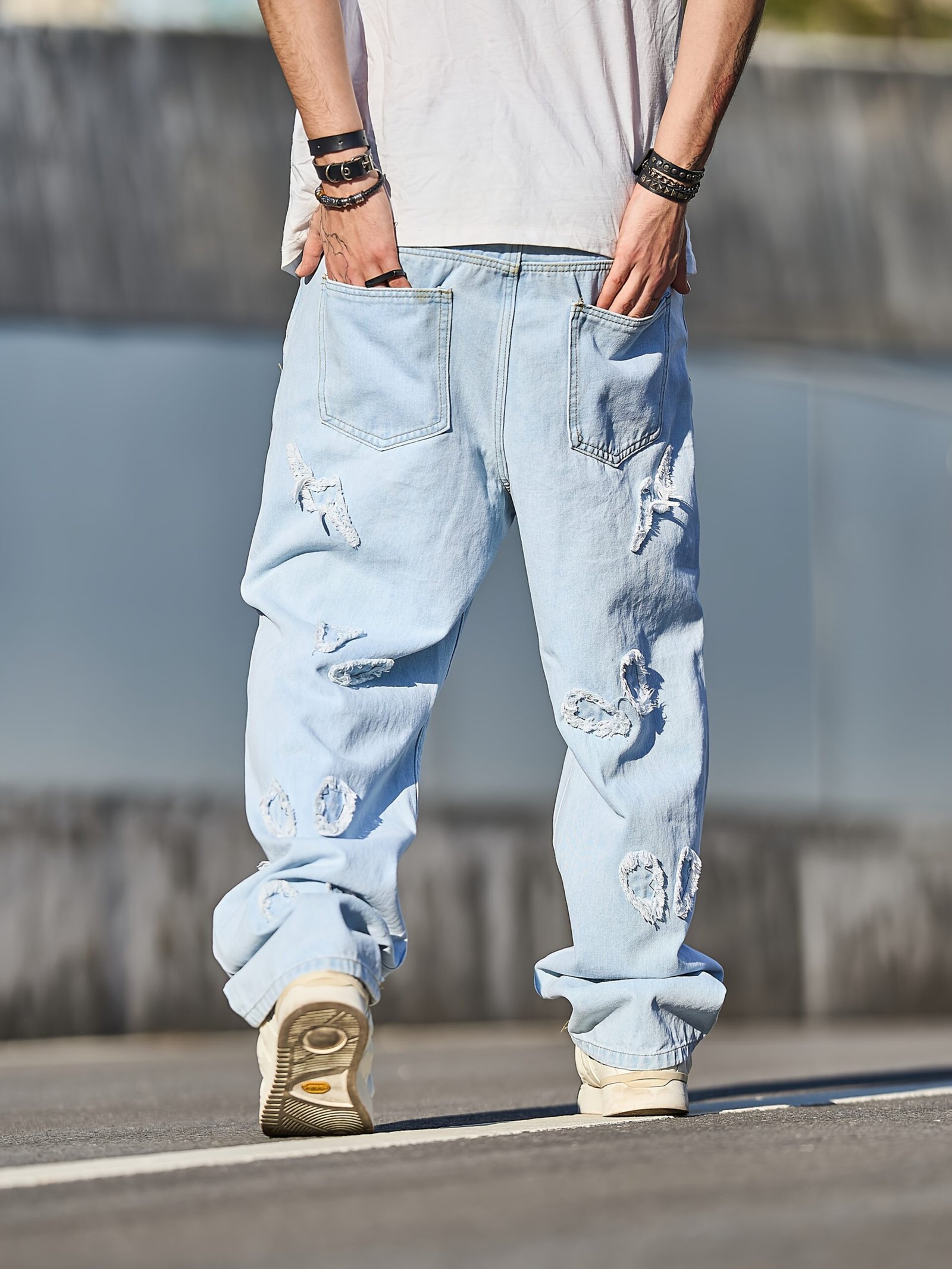 Men'S American Casual Loose-Fit Distressed Faux Denim Faux Denim with Patches – High Street Style, Non-Stretch Fabric, Raw Wash Detail, All-Season Comfort, Streetwear Fashion, Relaxed Fit Faux Denim | Distressed Faux Denim | Nonstretch Fabric, Trousers Fo