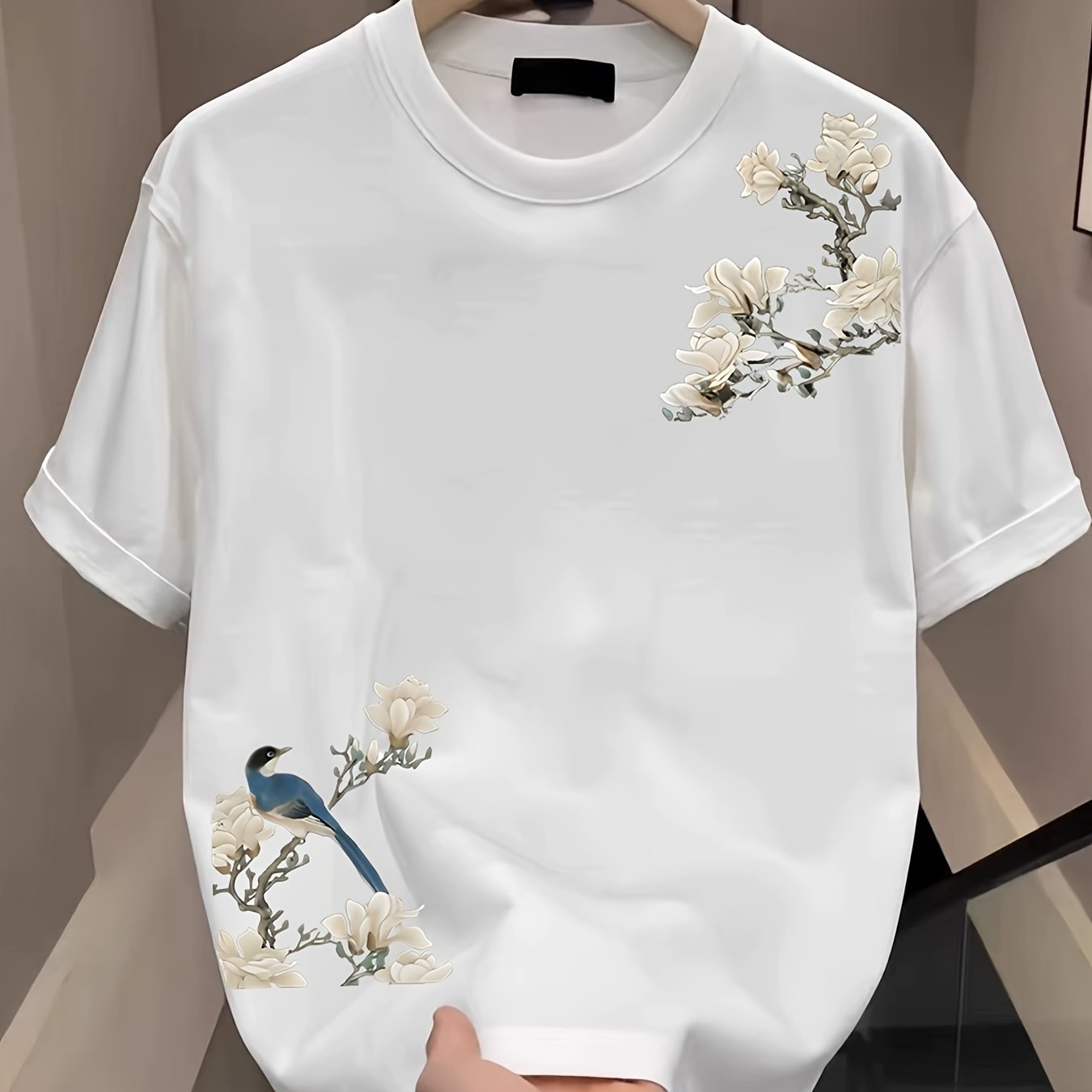 Men's White Floral & Bluebird Print T-Shirt – Lightweight Breathable 100% Cotton Round Neck Casual Everyday Shirt for Summer Outfits – Minimalist Floral Design Tee, Relaxed Style, Artistic Pattern, Comfortable Fit, Short Sleeve Top, Fashion Enthusiasts