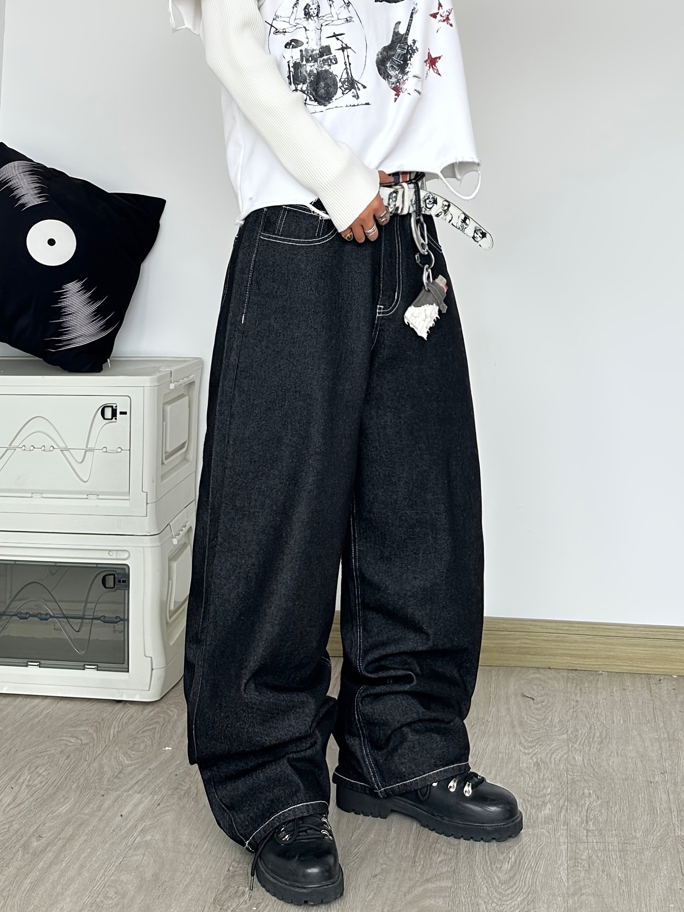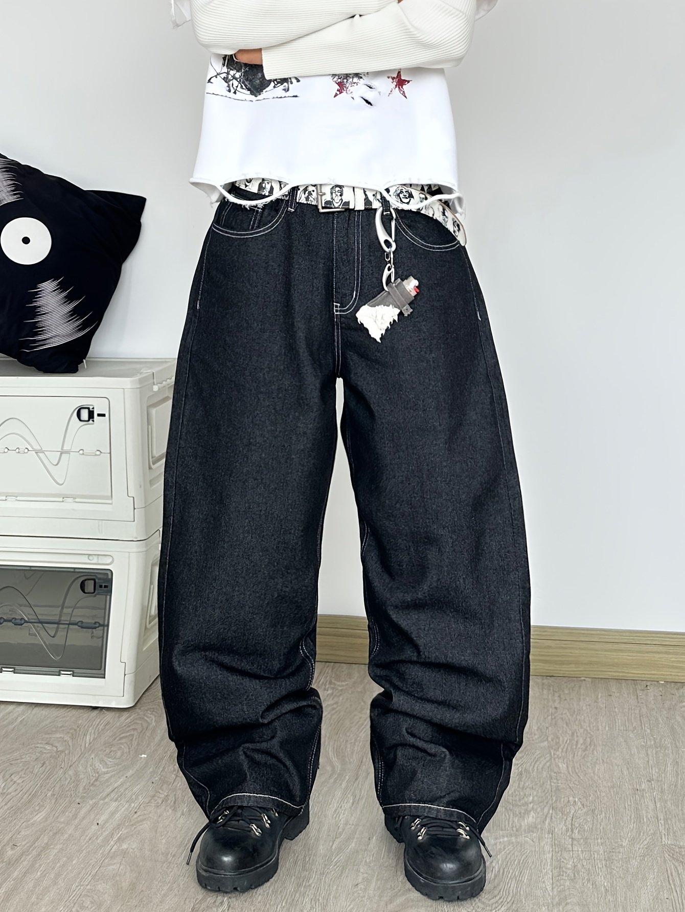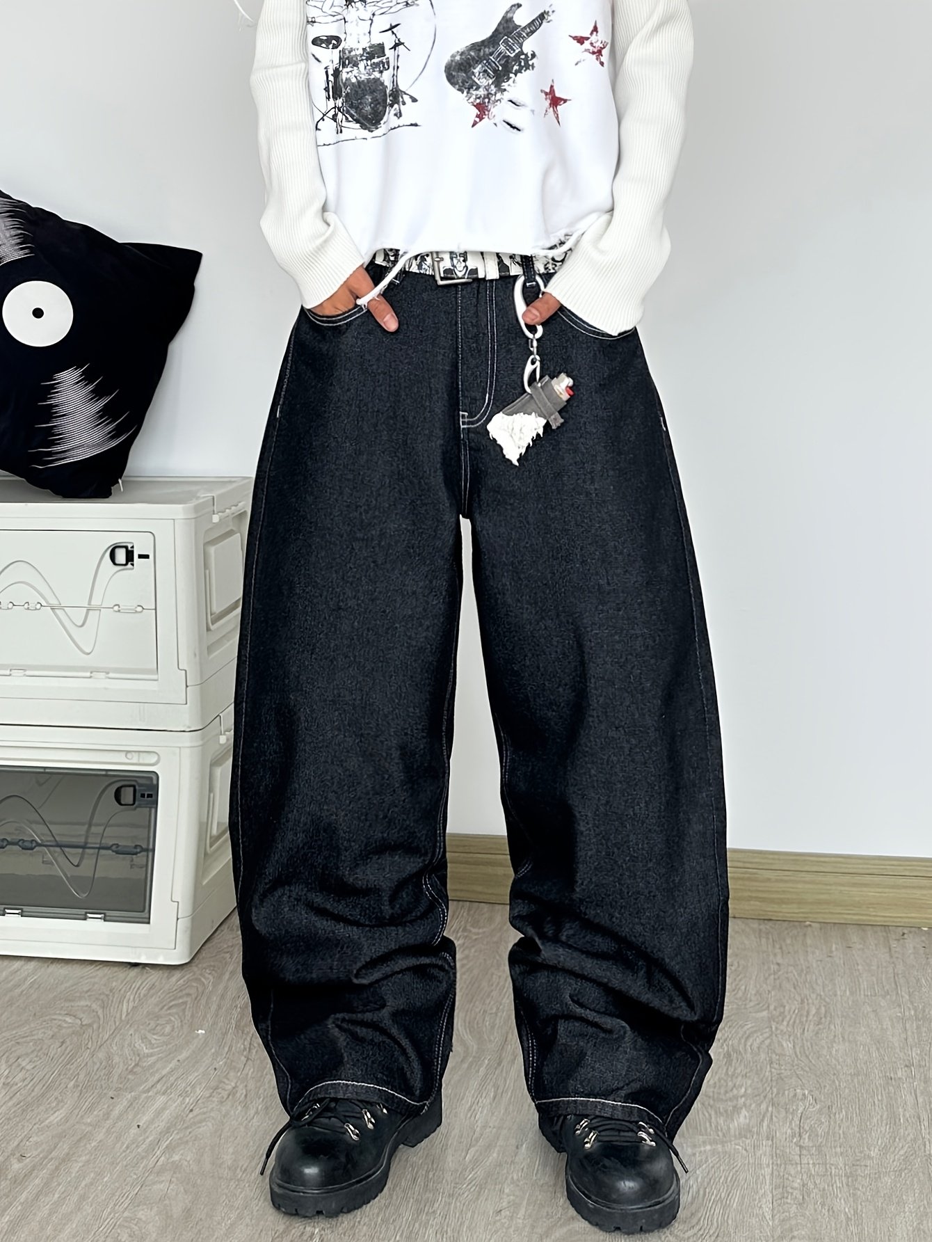 Men's & Women's Oversized Black Y2K Streetwear Jeans – Wide-Leg Loose-Fit Heavy- Pants, Beltless Casual Trousers No Belt/Accessories, Machine Washable All-Season Wear, Unisex Jeans for Men & Women