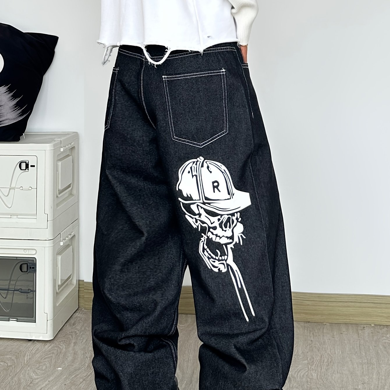 Men'S Gothic Streetwear Faux Denim – Loose Fit Pants with Large Side Pockets, Non-Stretchy Faux Denim for Halloween Costumes, Everyday & Themed Events – Y2K Retro Urban Fashion Trousers, Goth Faux Denim, Casual Wear, Unique Print Design, Durable Fabric, S