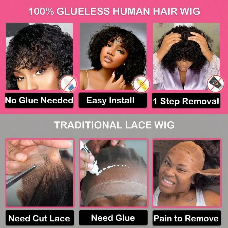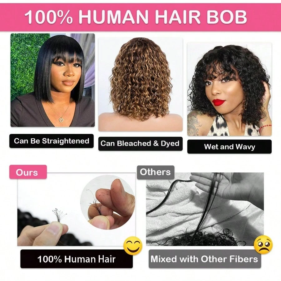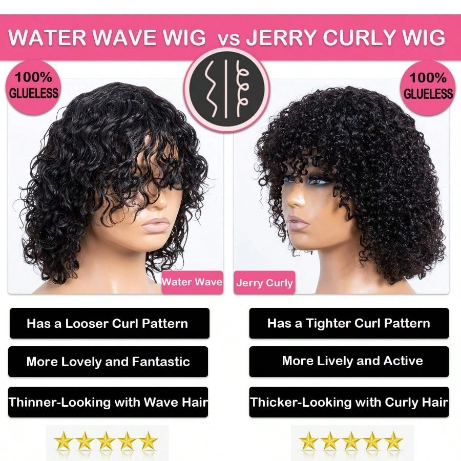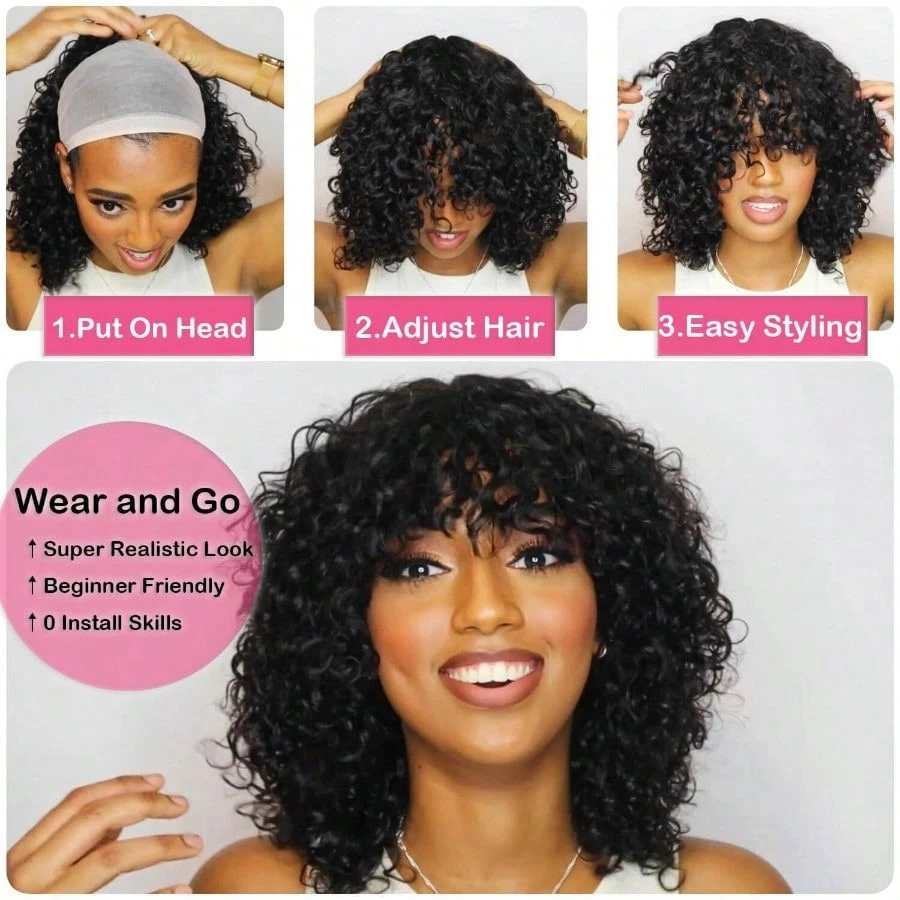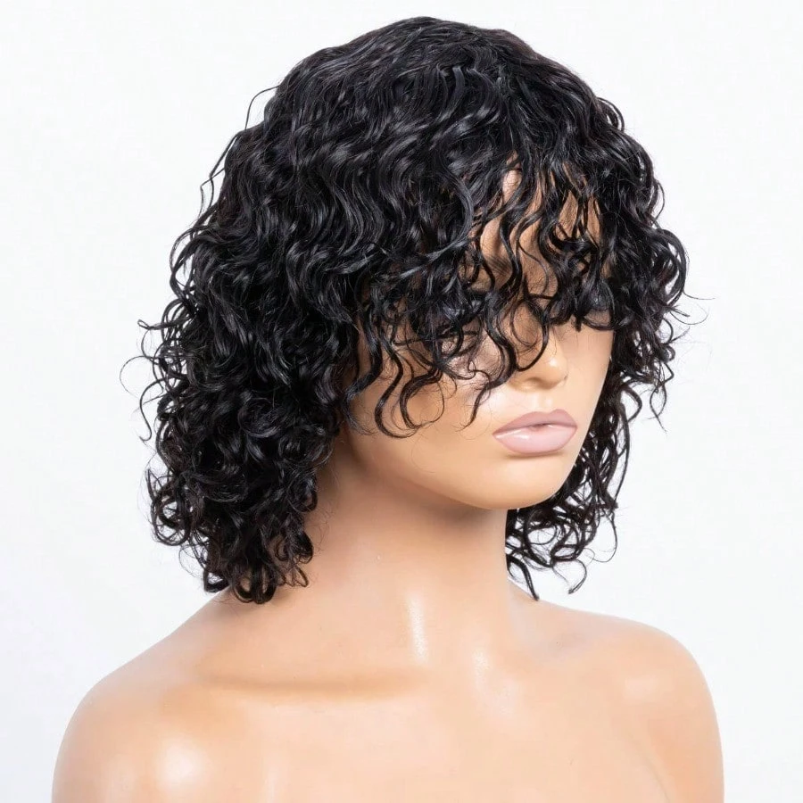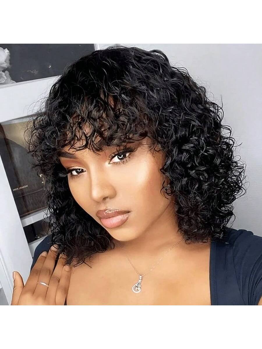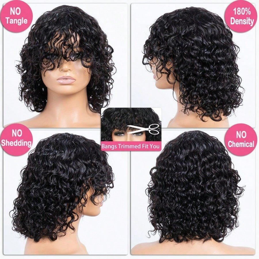MHuman Hair Wig With Bangs For Gluel Short Water Wave Curly Bob Wigs Human Hair With Bang 180% Density None Lace Wavy Bang Wig 100% Brazilian Virgin Hair Natural Black 12 Inch6001