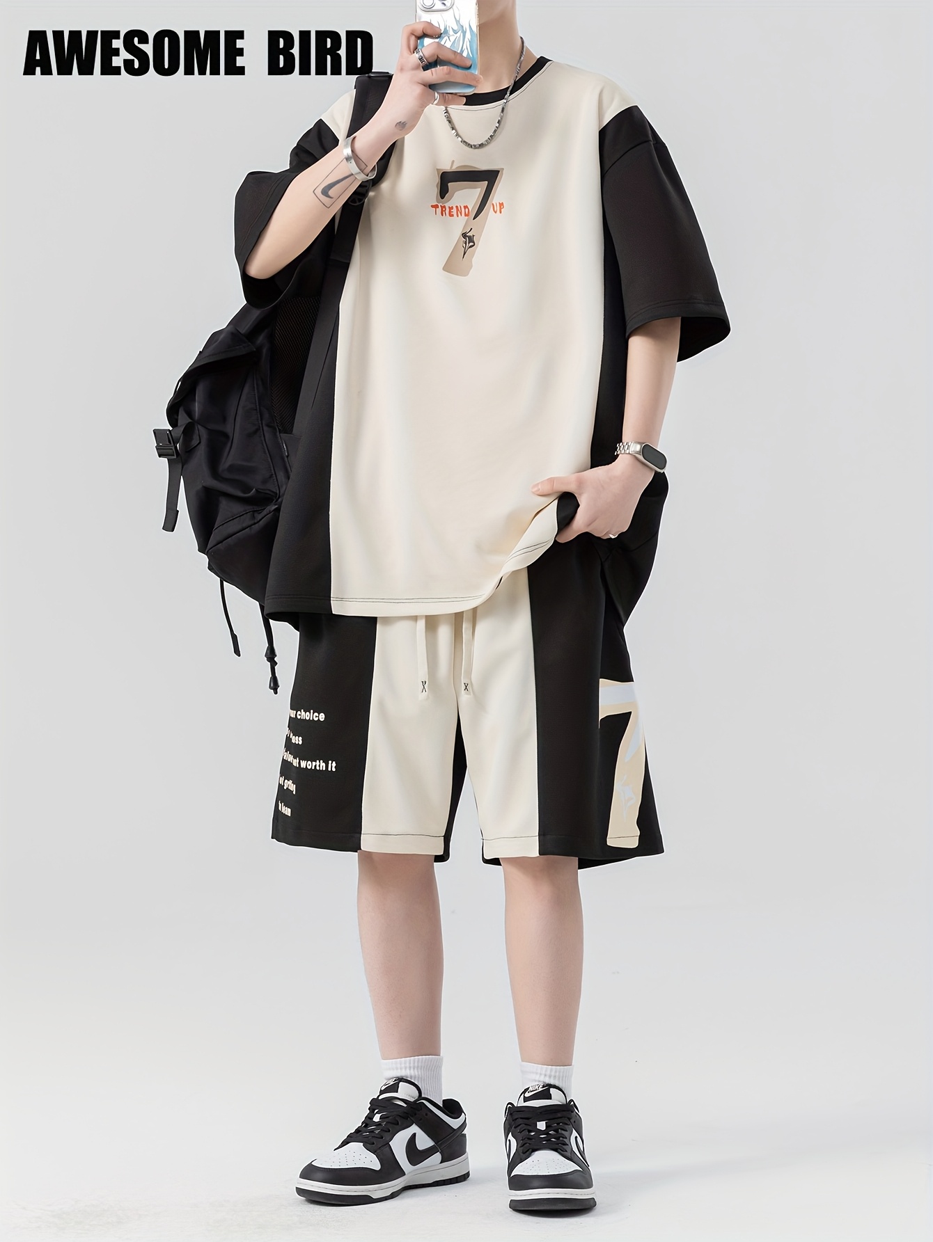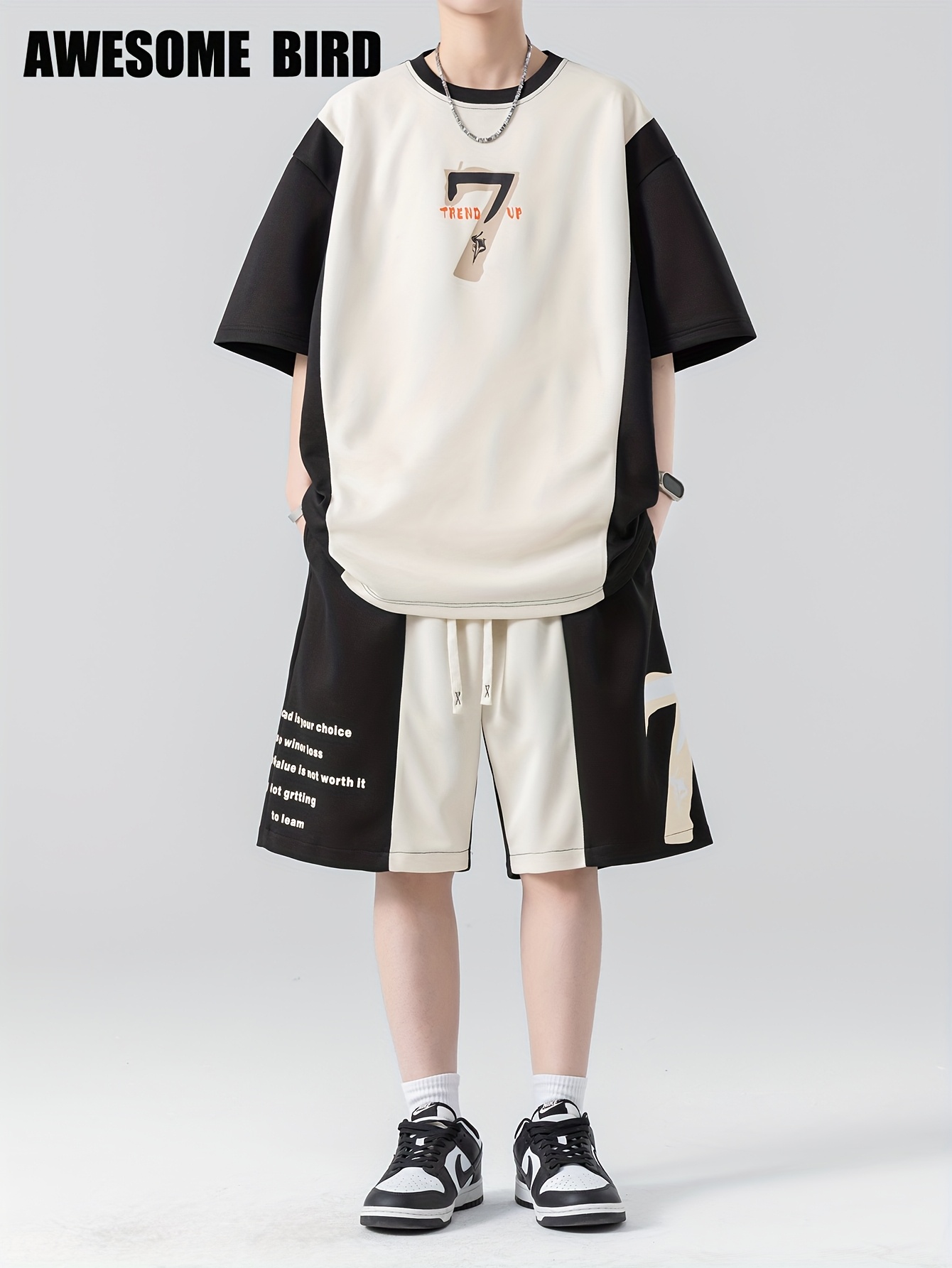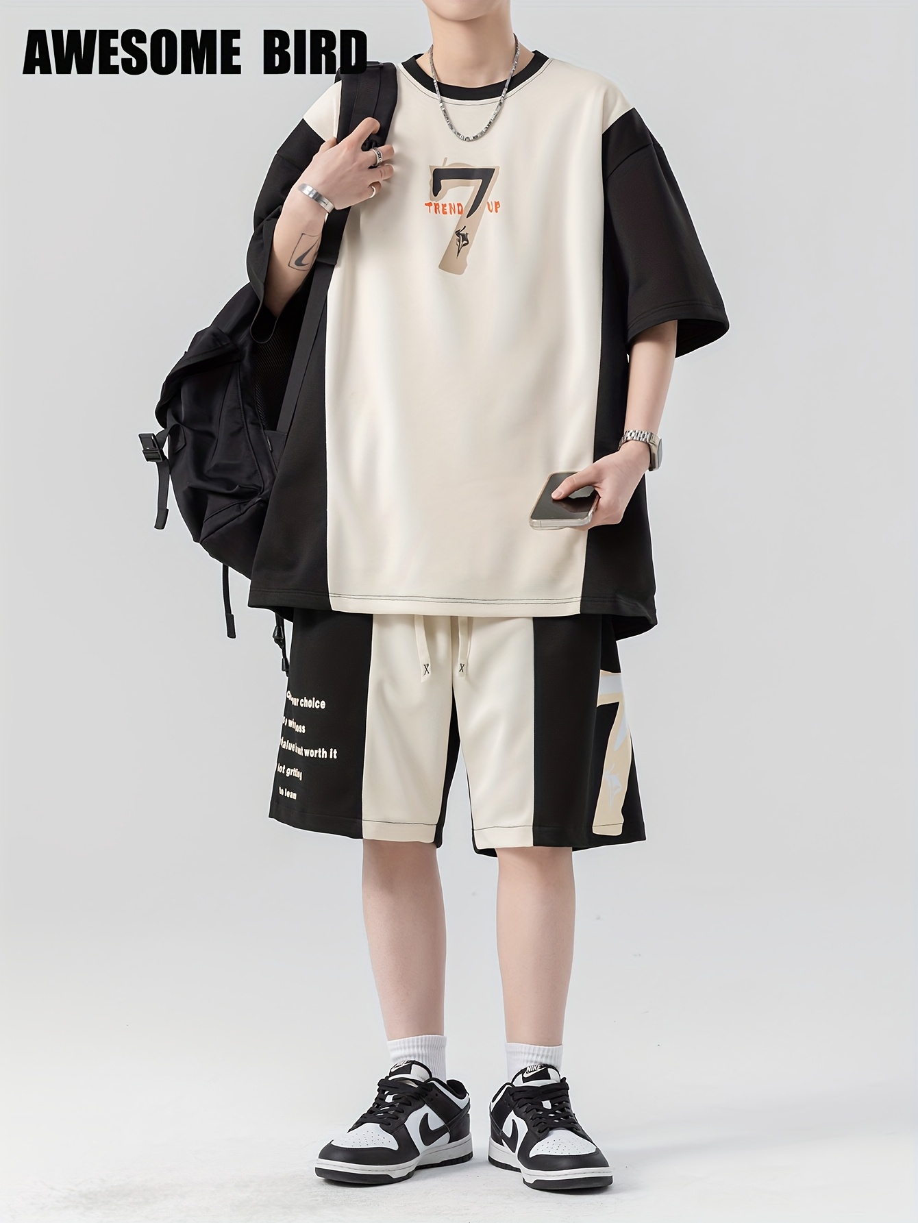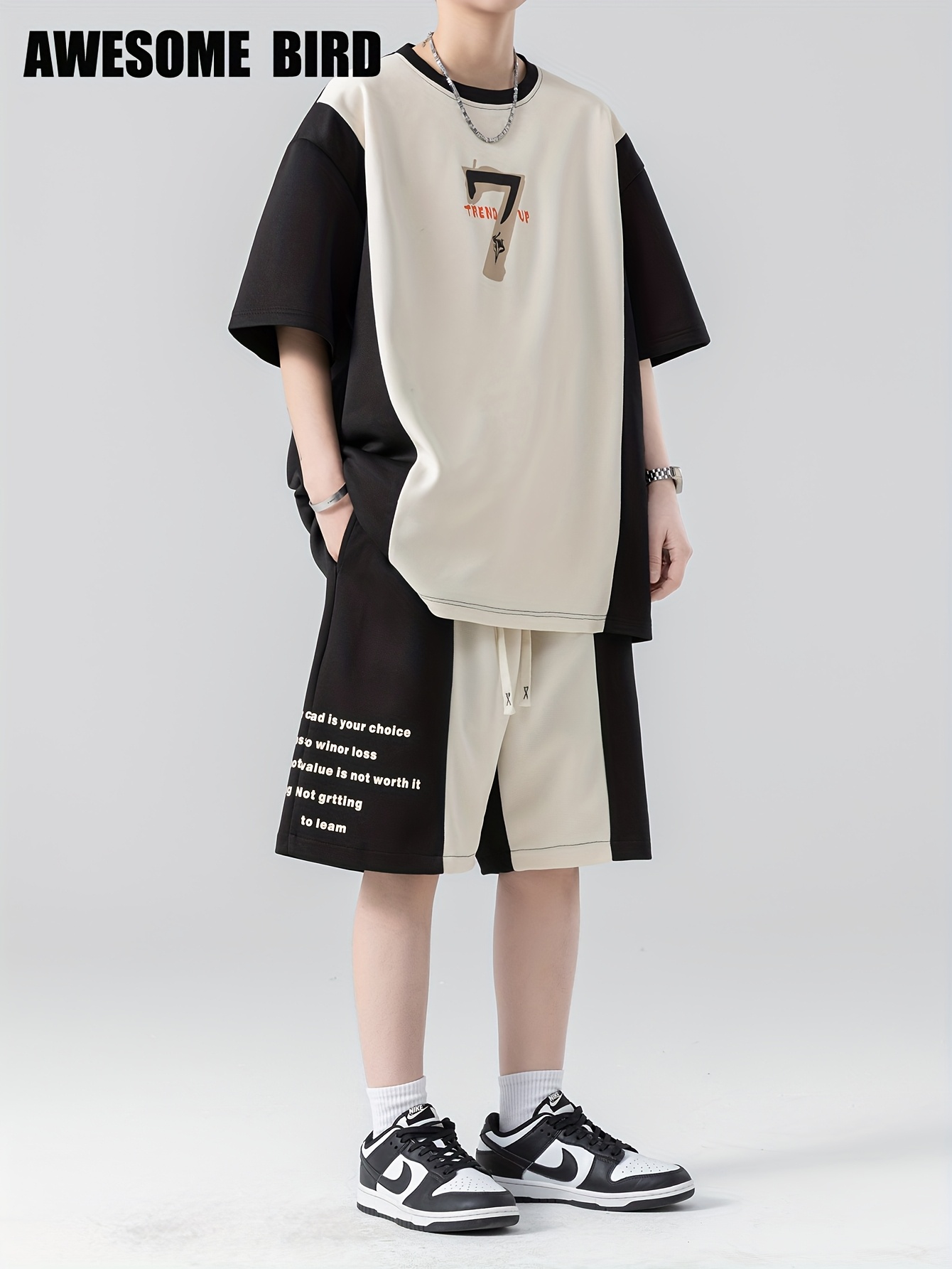 New Casual Sports Suit for Men, Summer Trendy Printed Patchwork Short Sleeve T-shirt, A Complete Set of Handsome Matching, AWESOME BIRD