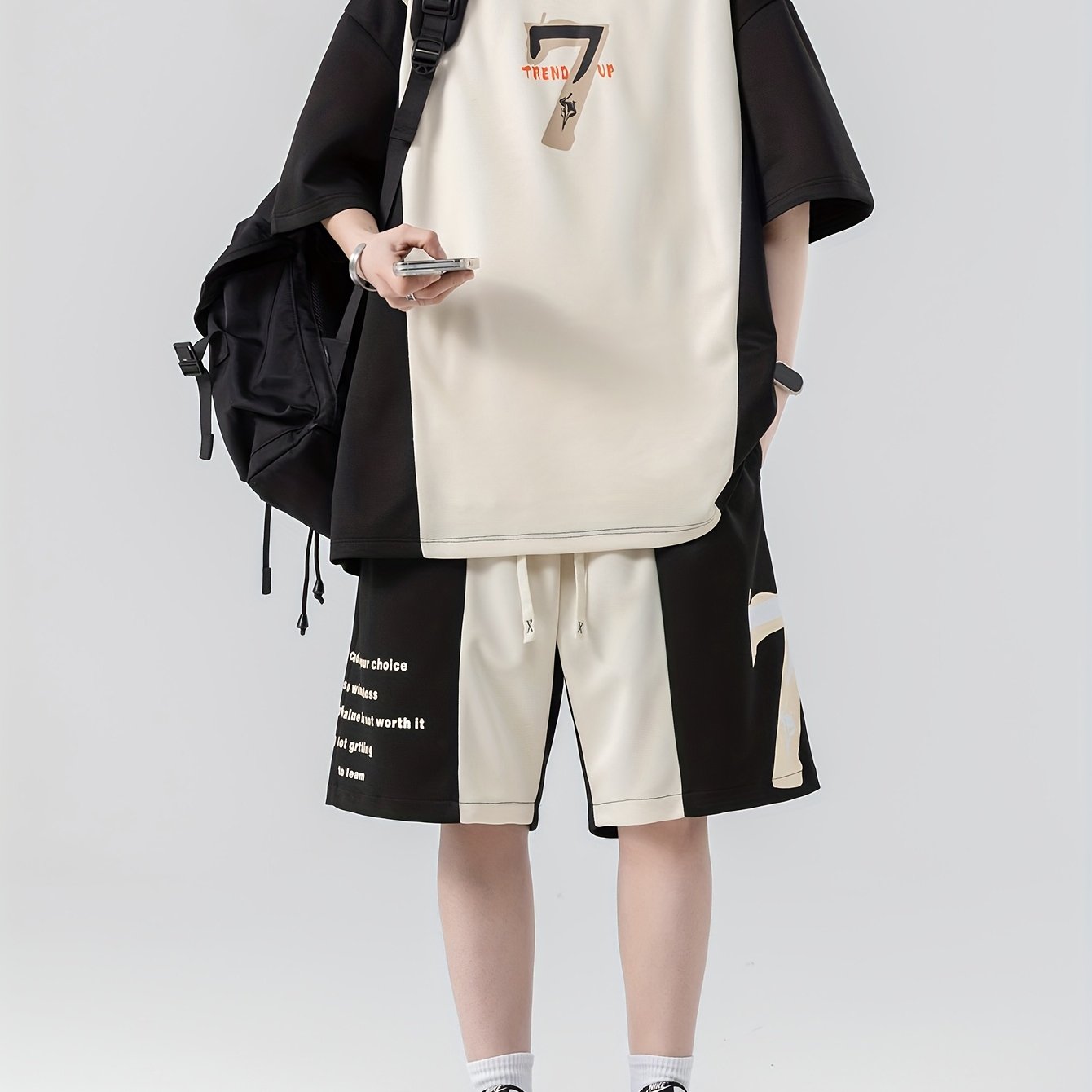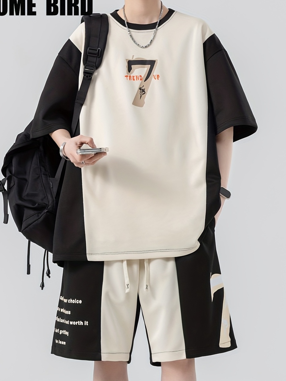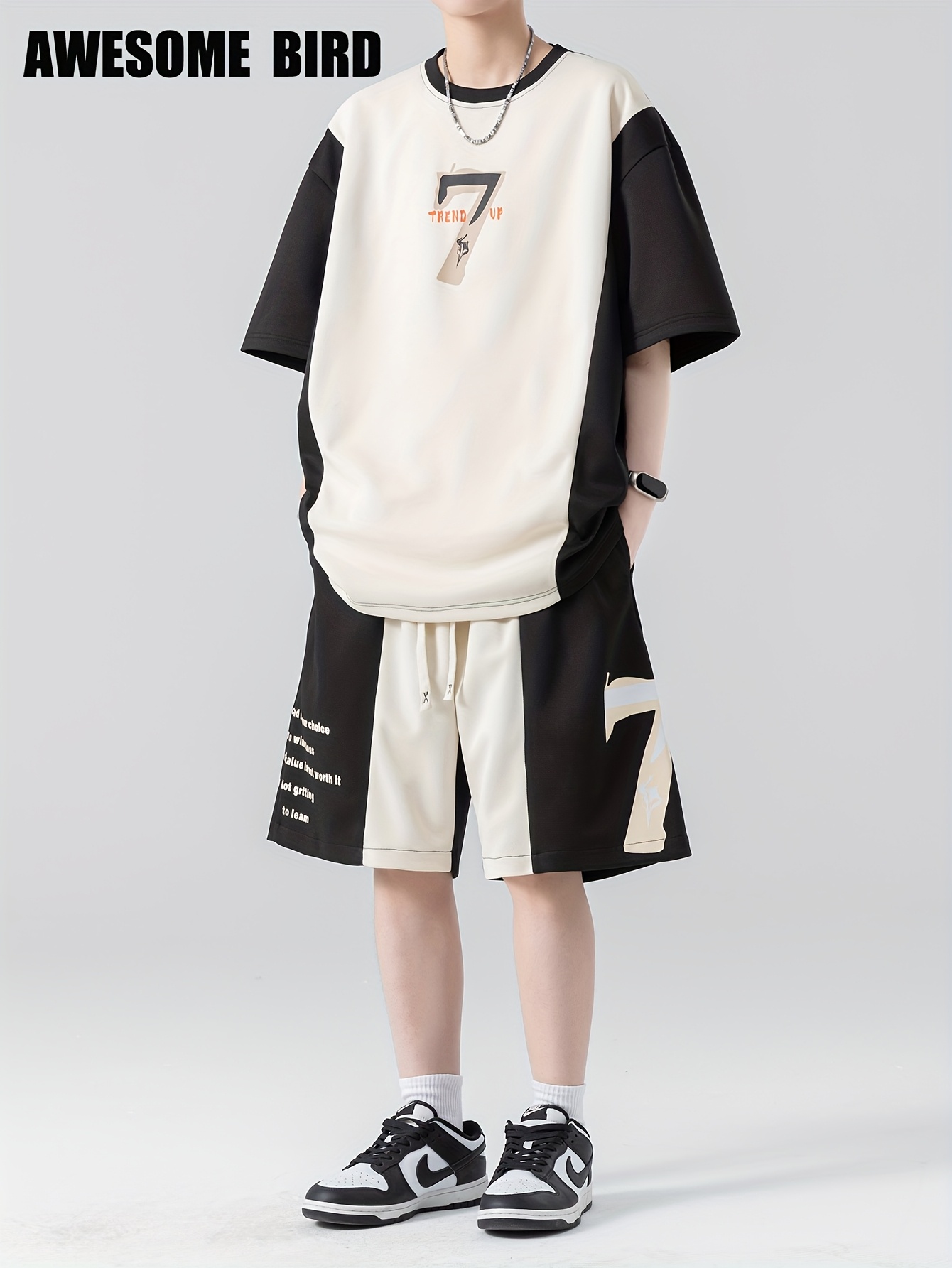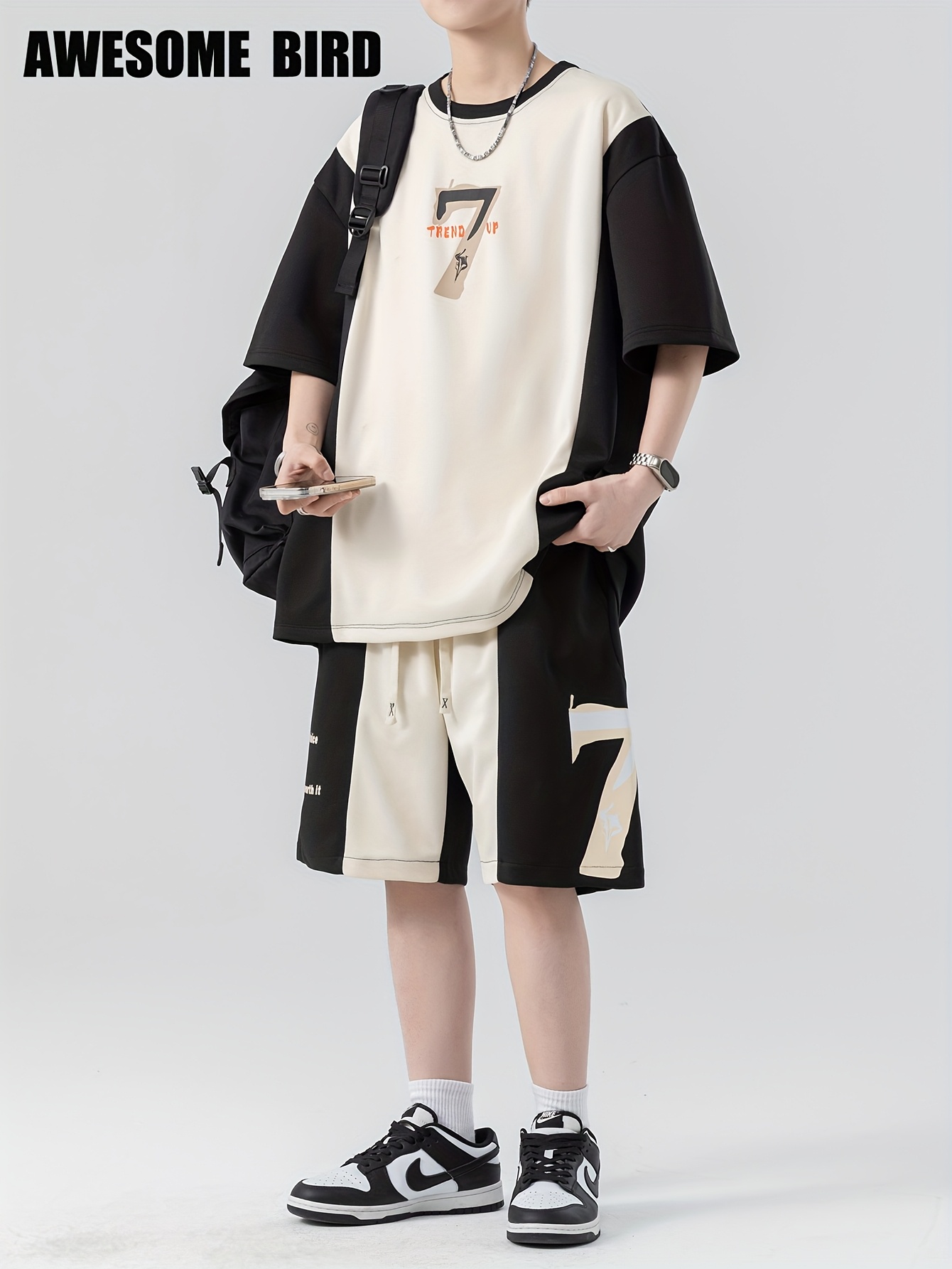 New Casual Sports Suit for Men, Summer Trendy Printed Patchwork Short Sleeve T-shirt, A Complete Set of Handsome Matching, AWESOME BIRD