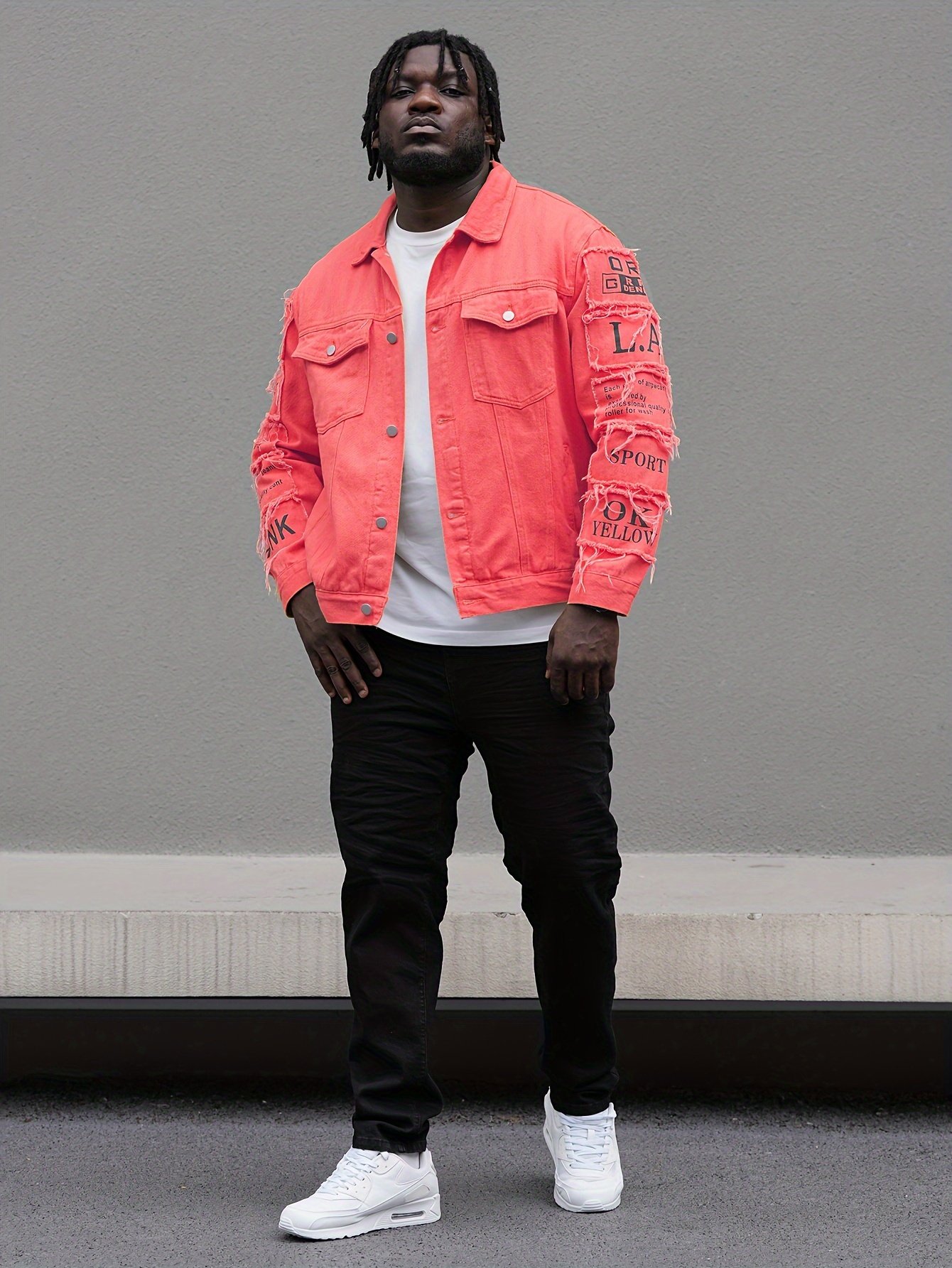 Plus Size Men's Patchwork Frayed Print Denim Jacket #TD3018, PLUS SIZE