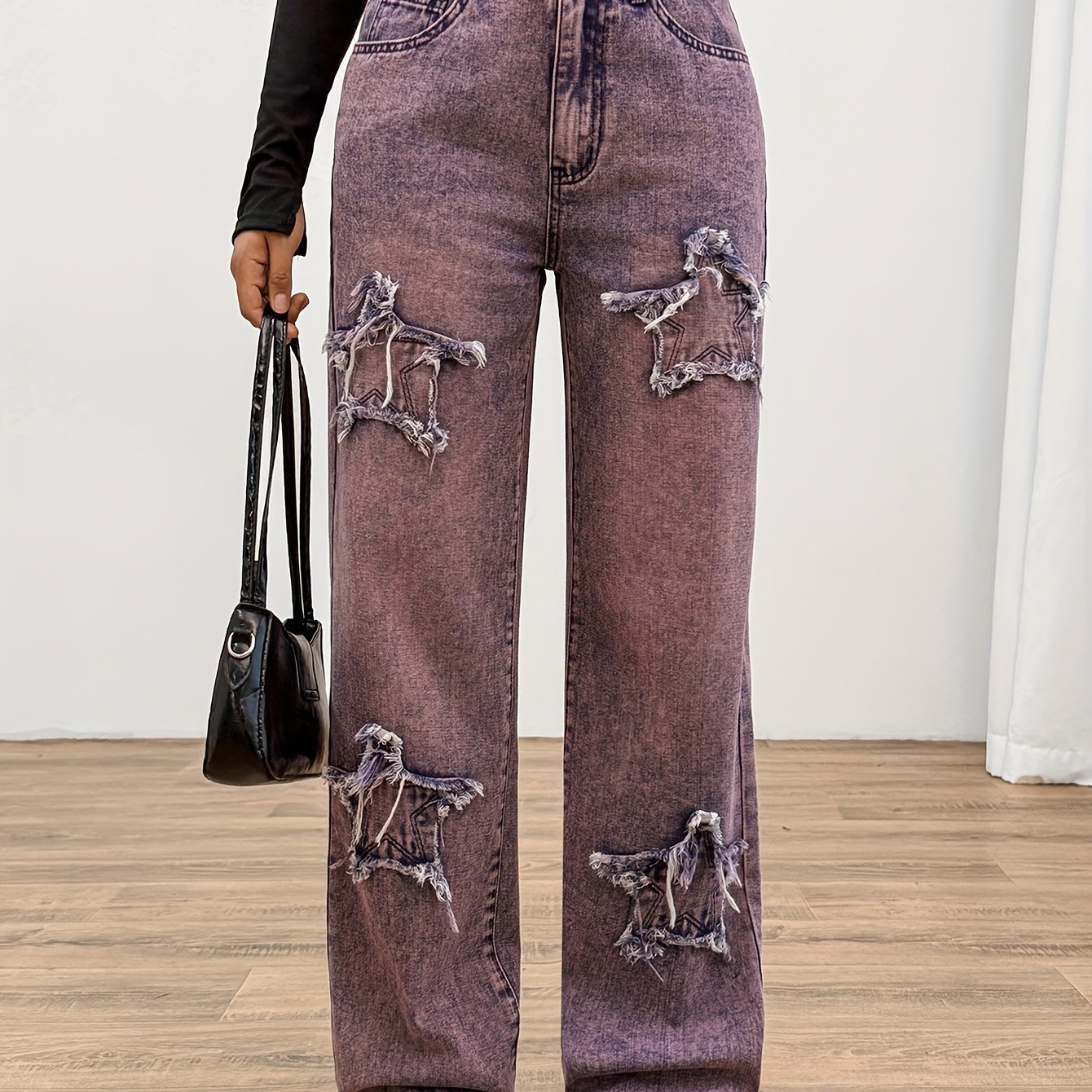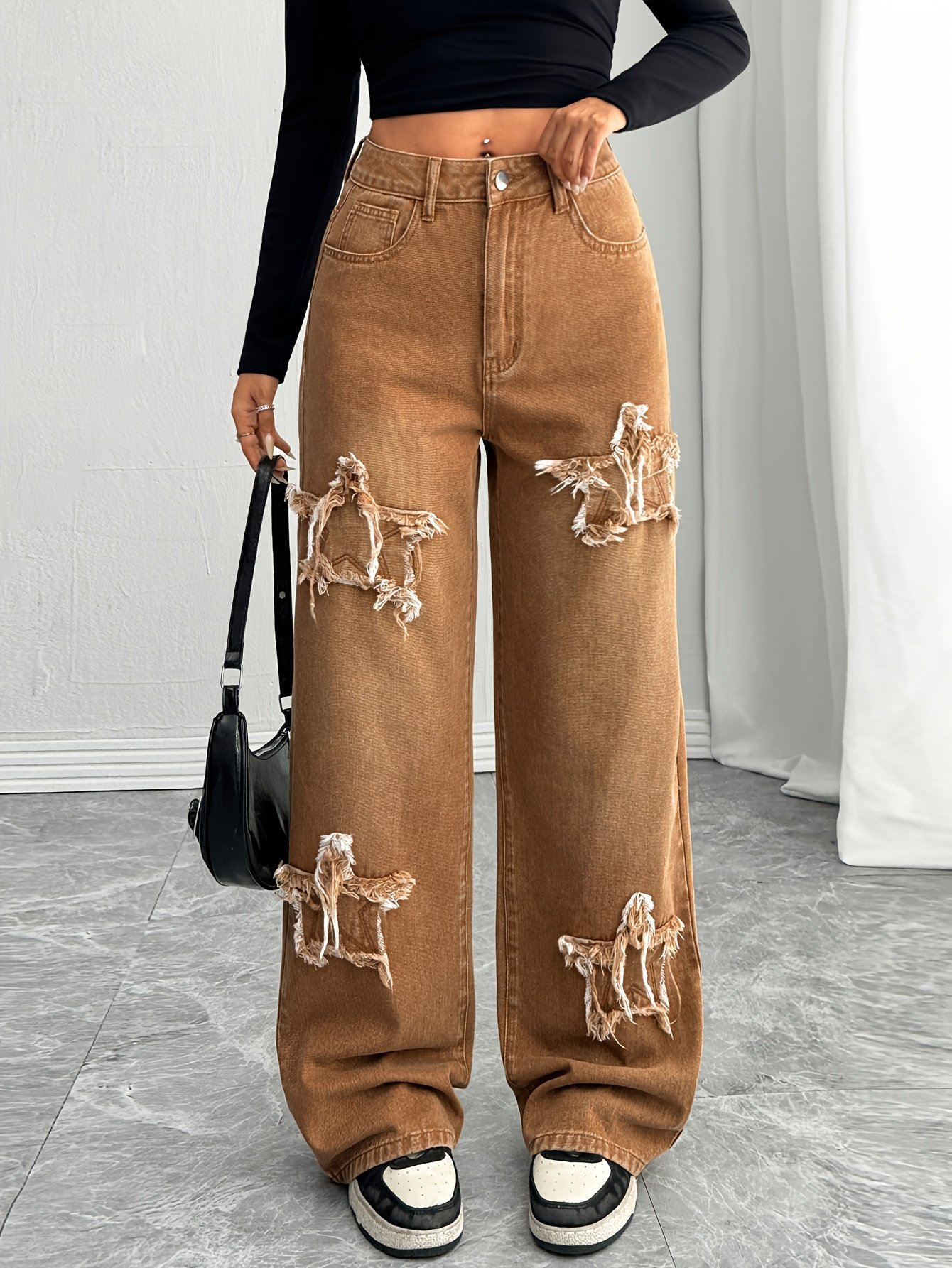 's Oversized Straight-Leg High-Waisted Jeans with Fringe-Like Star Patchwork – Brown & White Button-Fly Wide-Leg Pants, Machine Washable All-Season Casual Streetwear No Belt Loops