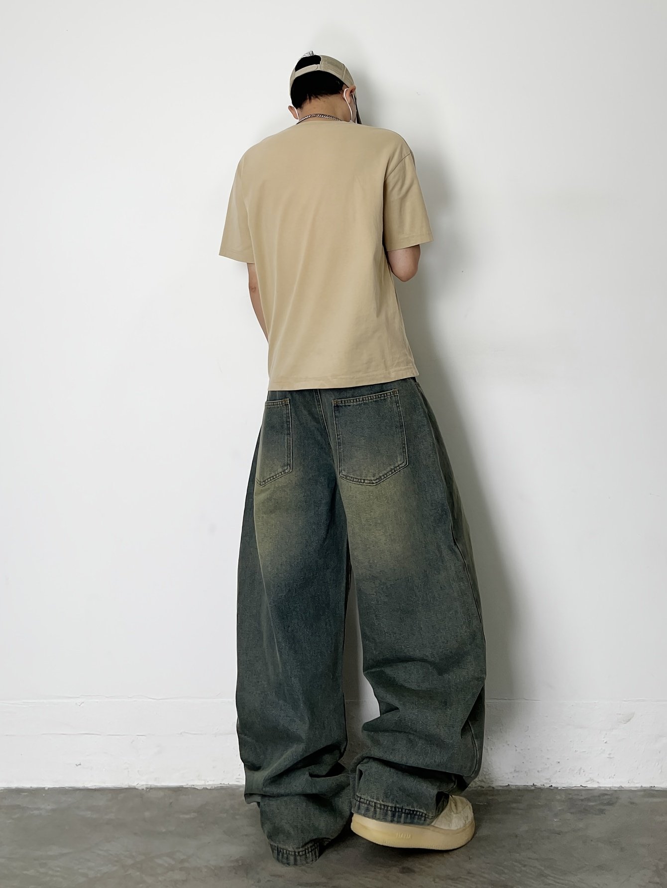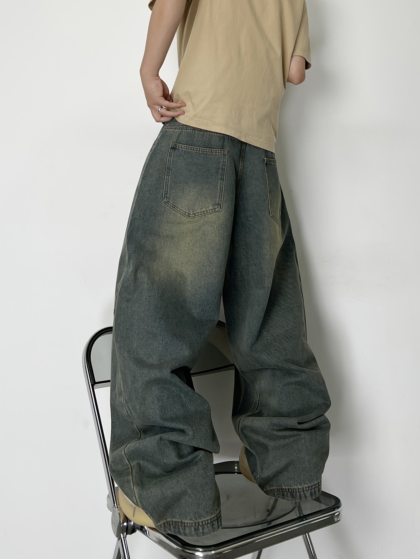 Japanese Retro Distressed Blue Loose Men's Jeans in Oversized Dad Style with Flared Legs