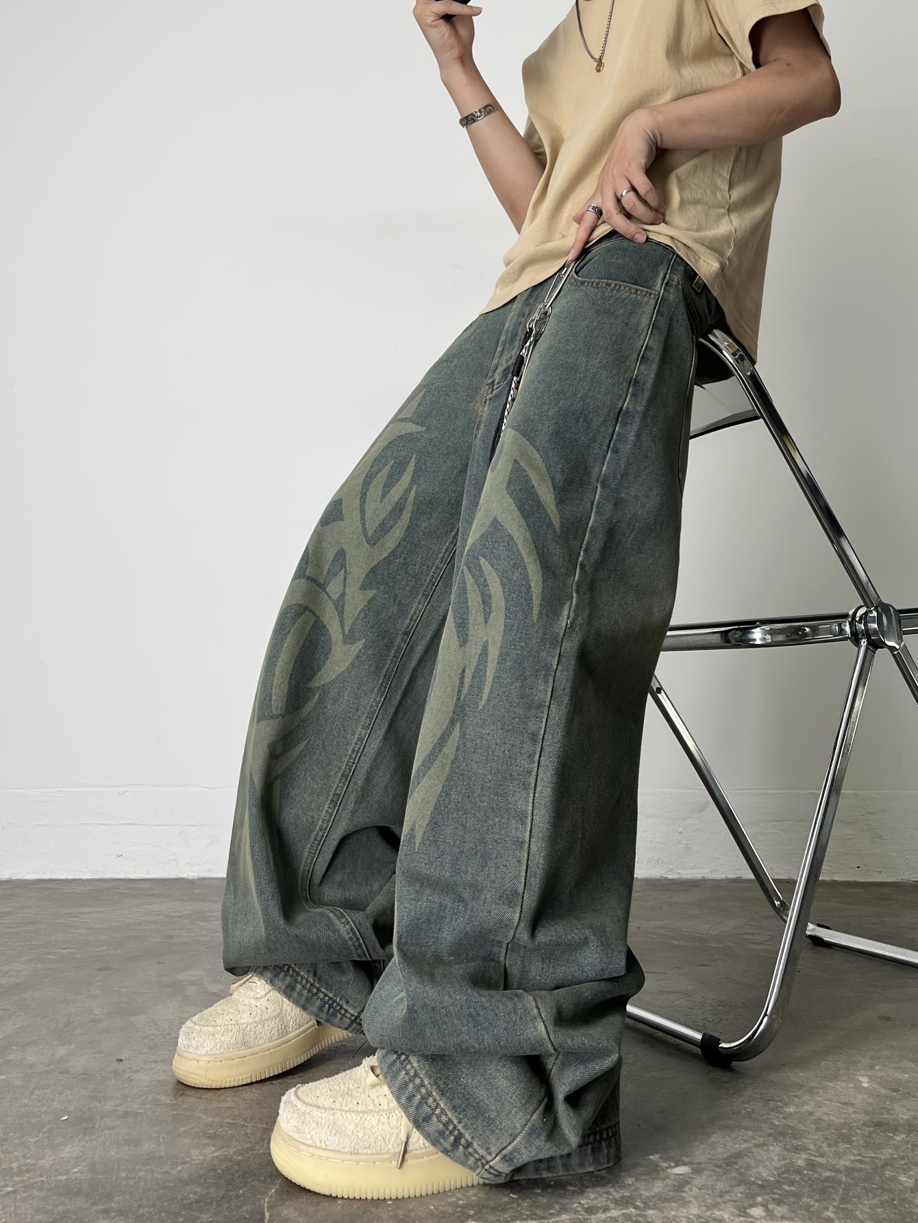 Men's Laser Thorn Print Wide-Leg Jeans – Oversized Streetwear Pants with Beltless Design, Heavy-Wash Look & Thigh/Ankle Laser Pattern – Machine-Washable Loose Fit Trousers No Belt Included for Urban Fashion