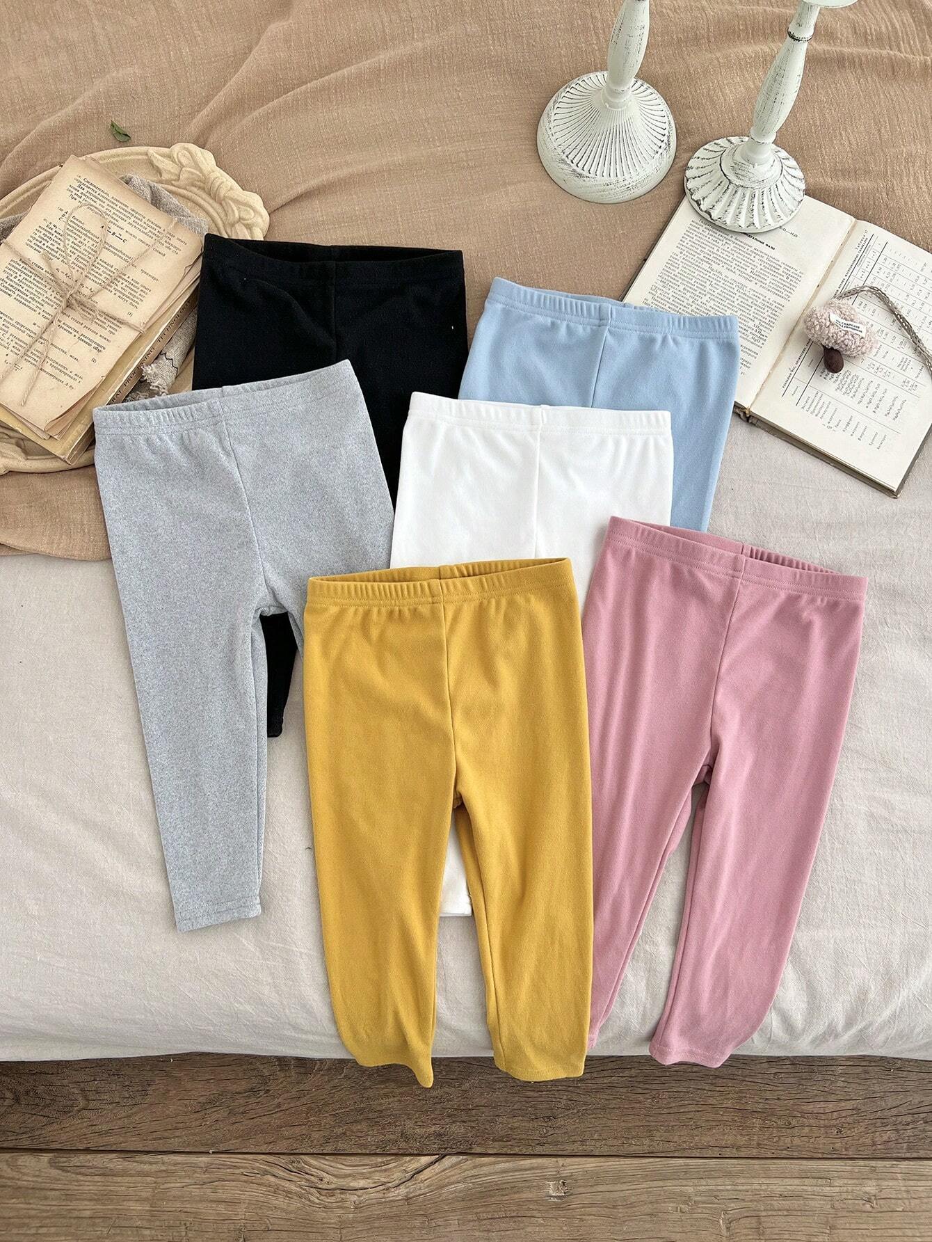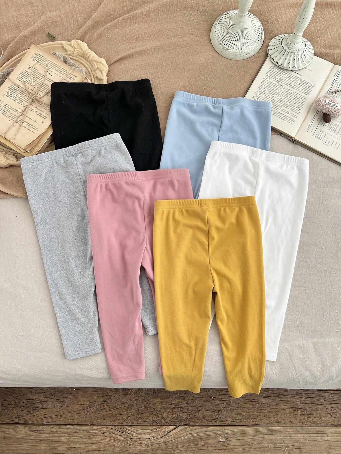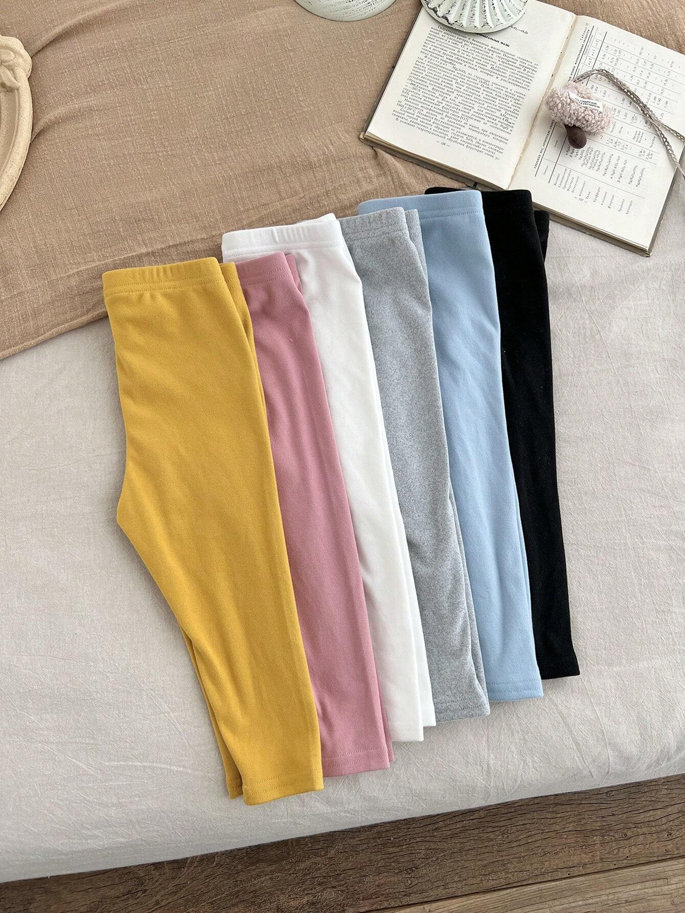 SHEIN 6pcs Young Girls Cute Knitted Elastic Waistband Solid Color Pants, Suitable For Spring, Autumn And Winter,Tops And Pants Sold Separately.