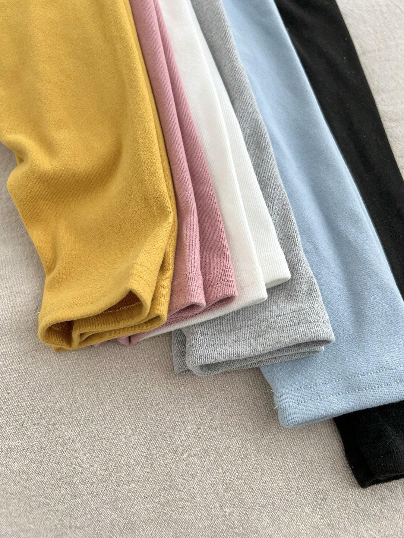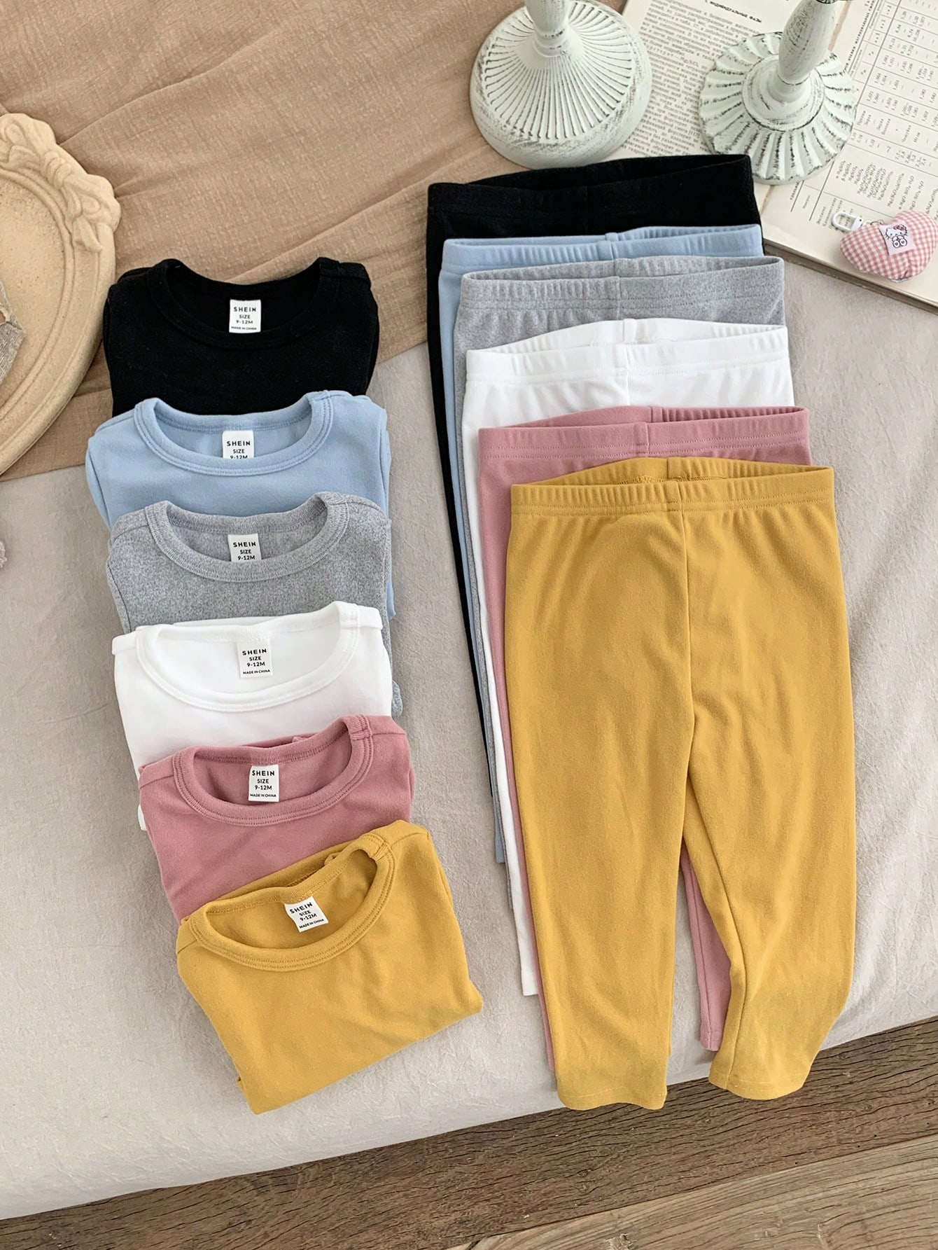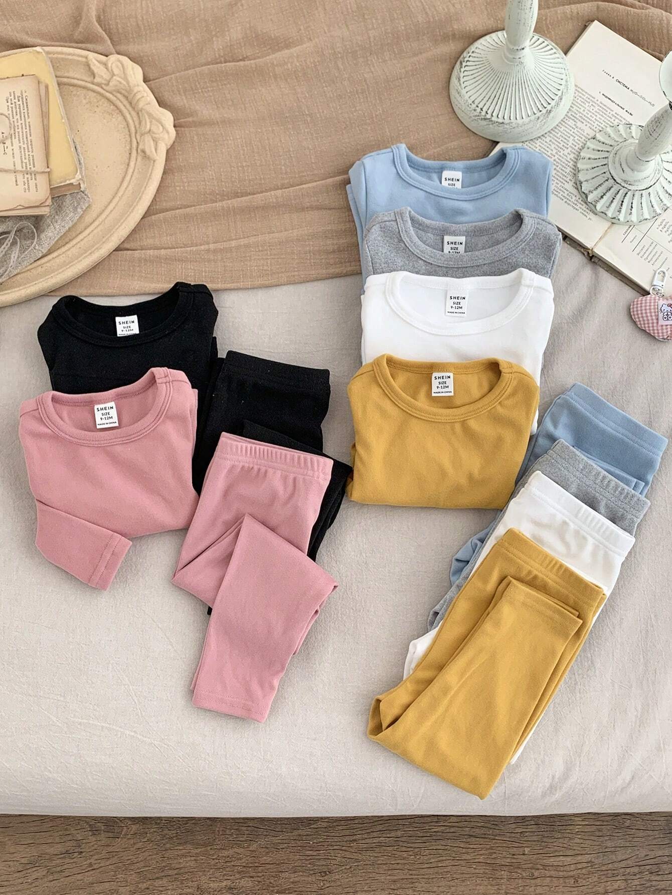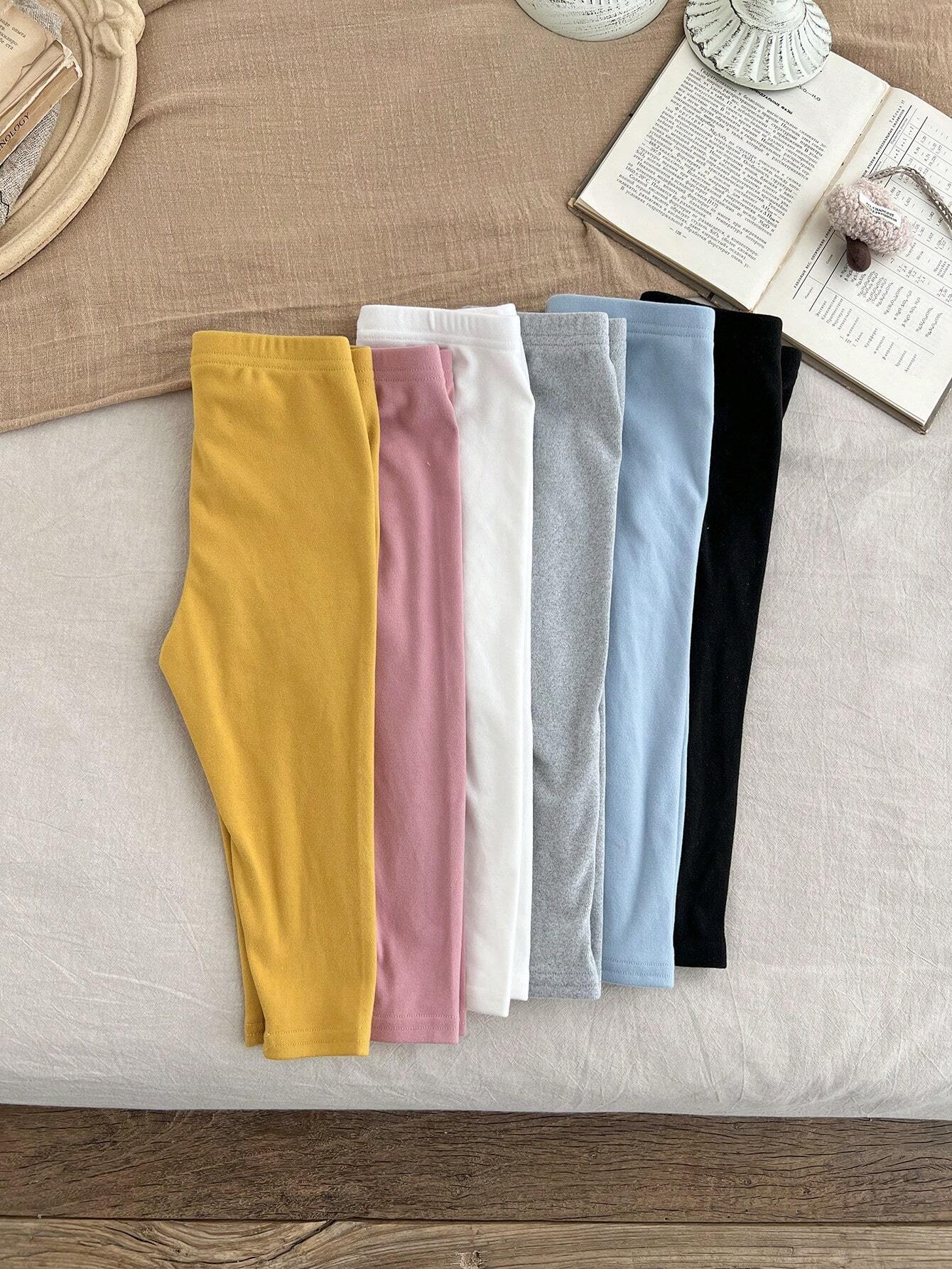 SHEIN 6pcs Young Girls Cute Knitted Elastic Waistband Solid Color Pants, Suitable For Spring, Autumn And Winter,Tops And Pants Sold Separately.