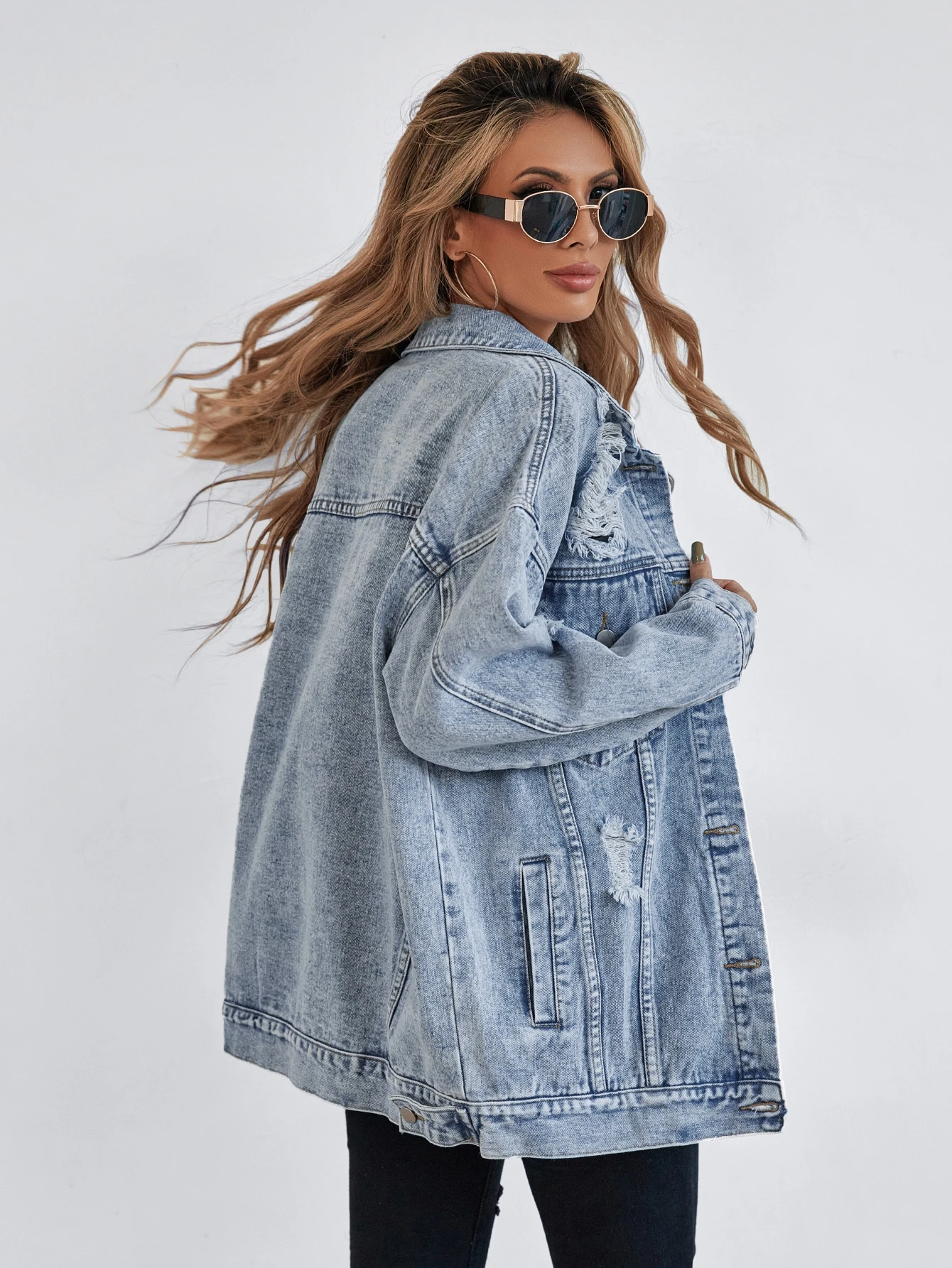 SHEIN Frenchy Knoop Blauw Voorkant Klepzak Oversized Spijkerjas