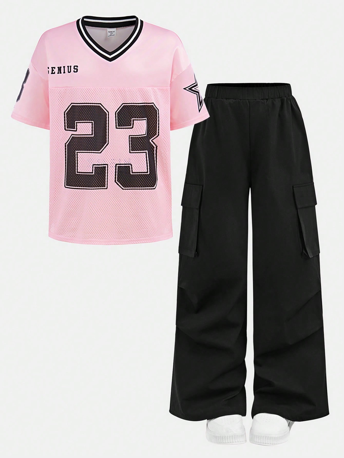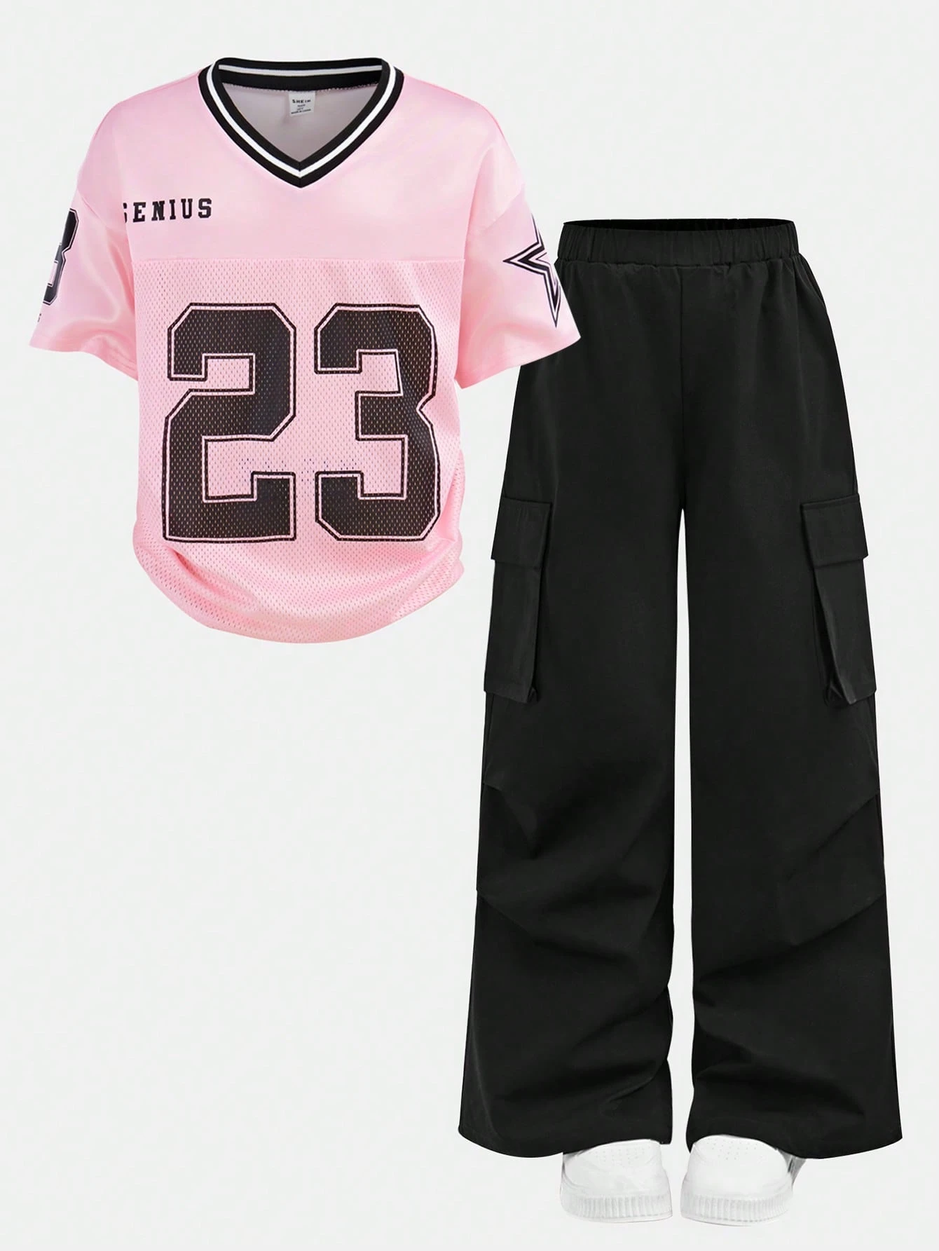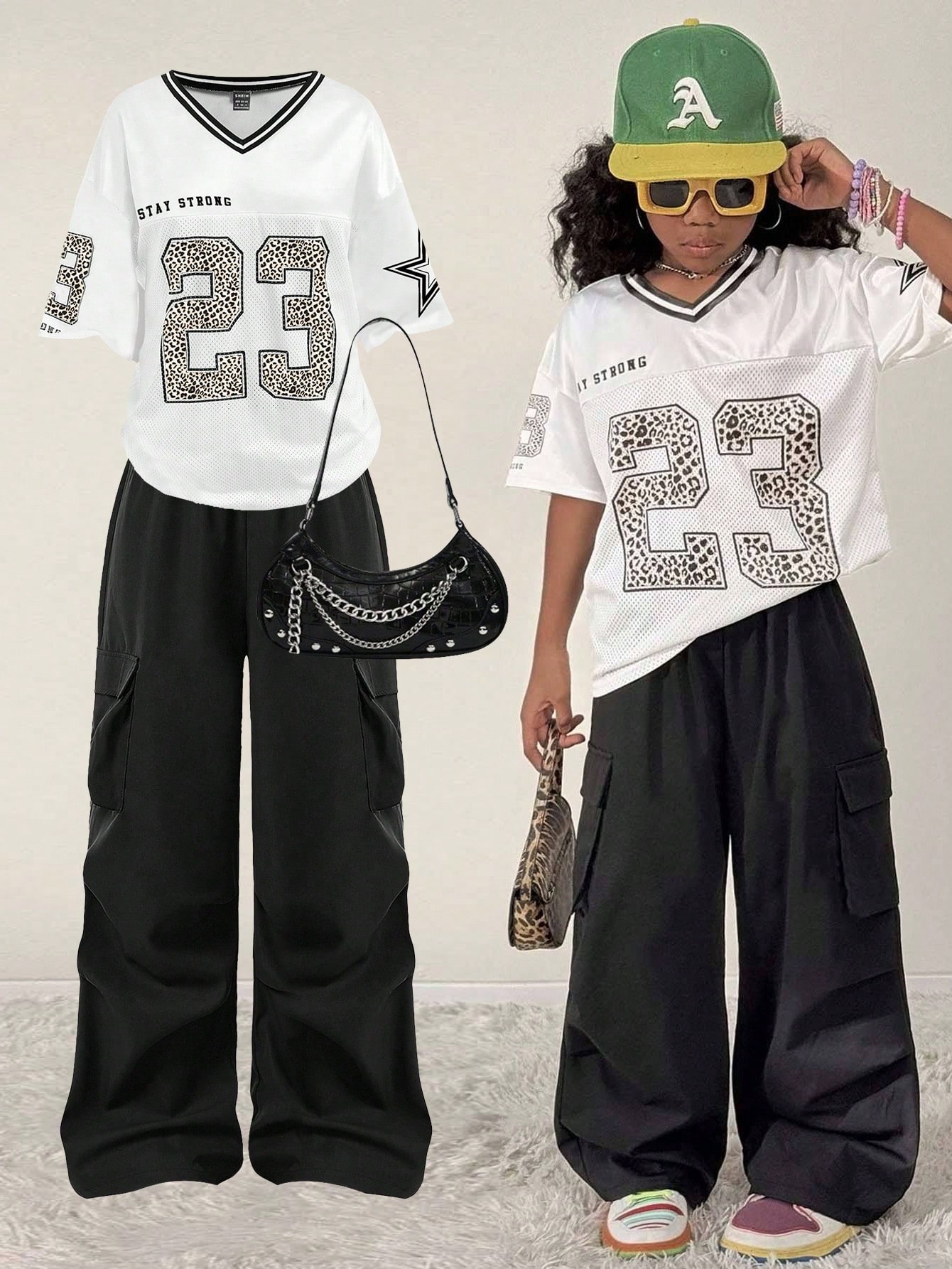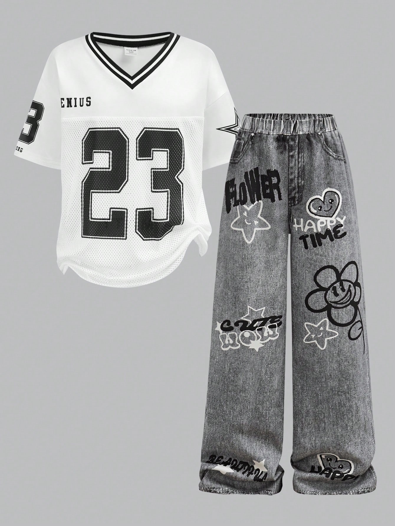 SHEIN Girlism Tween Girl Casual Streetwear Loose Jersey Print Top And Wide Leg Pants 2-Piece Set