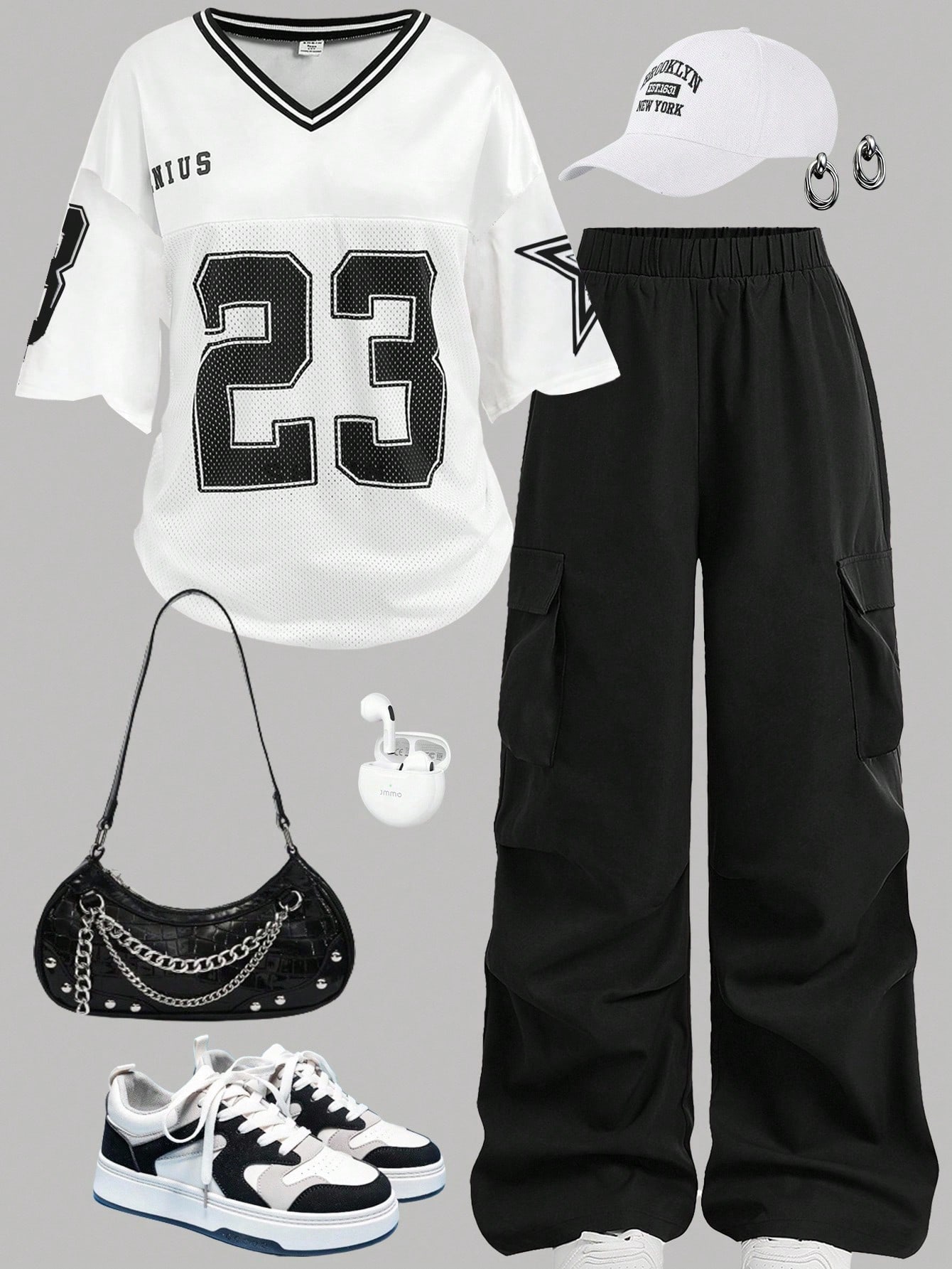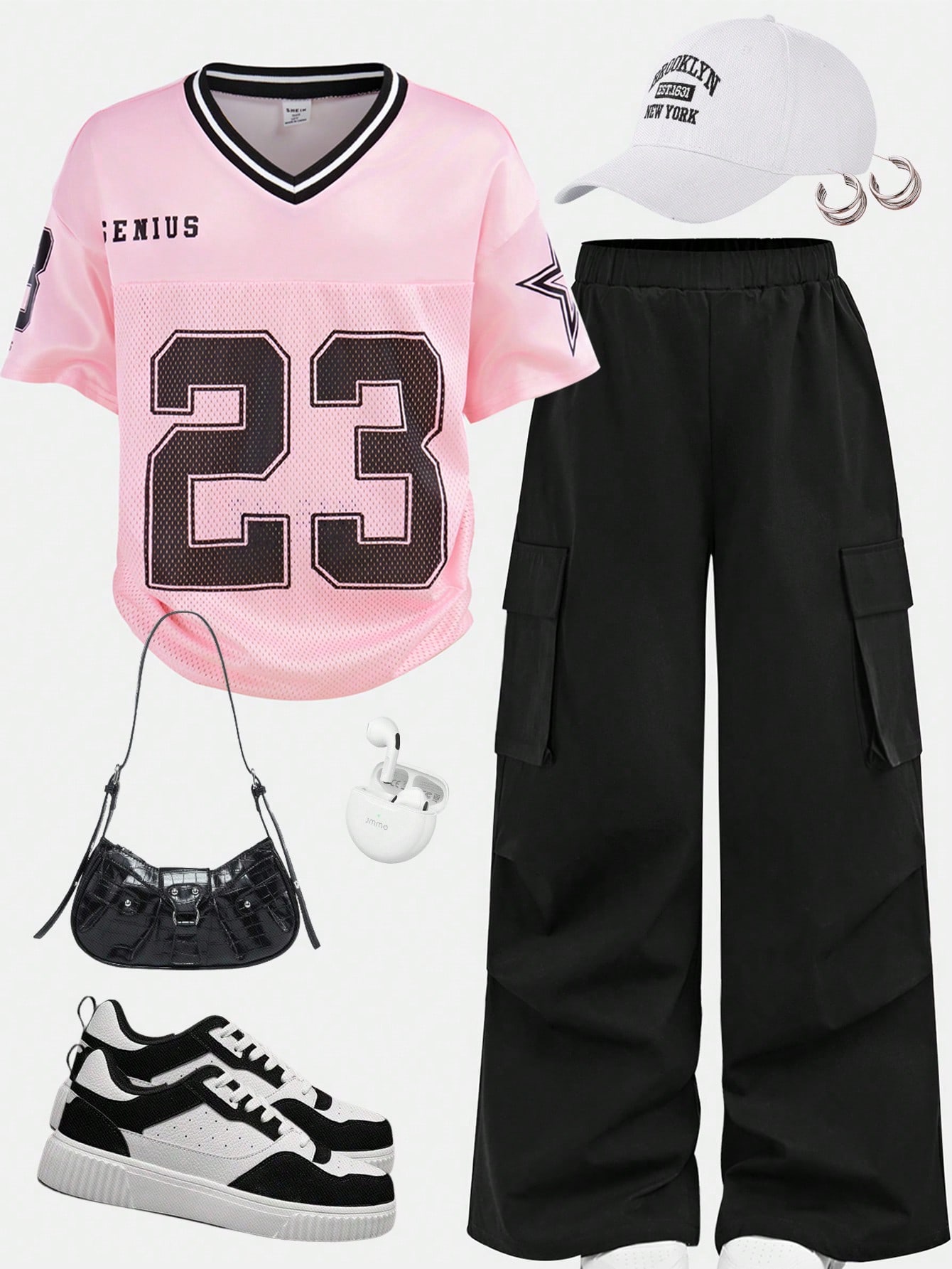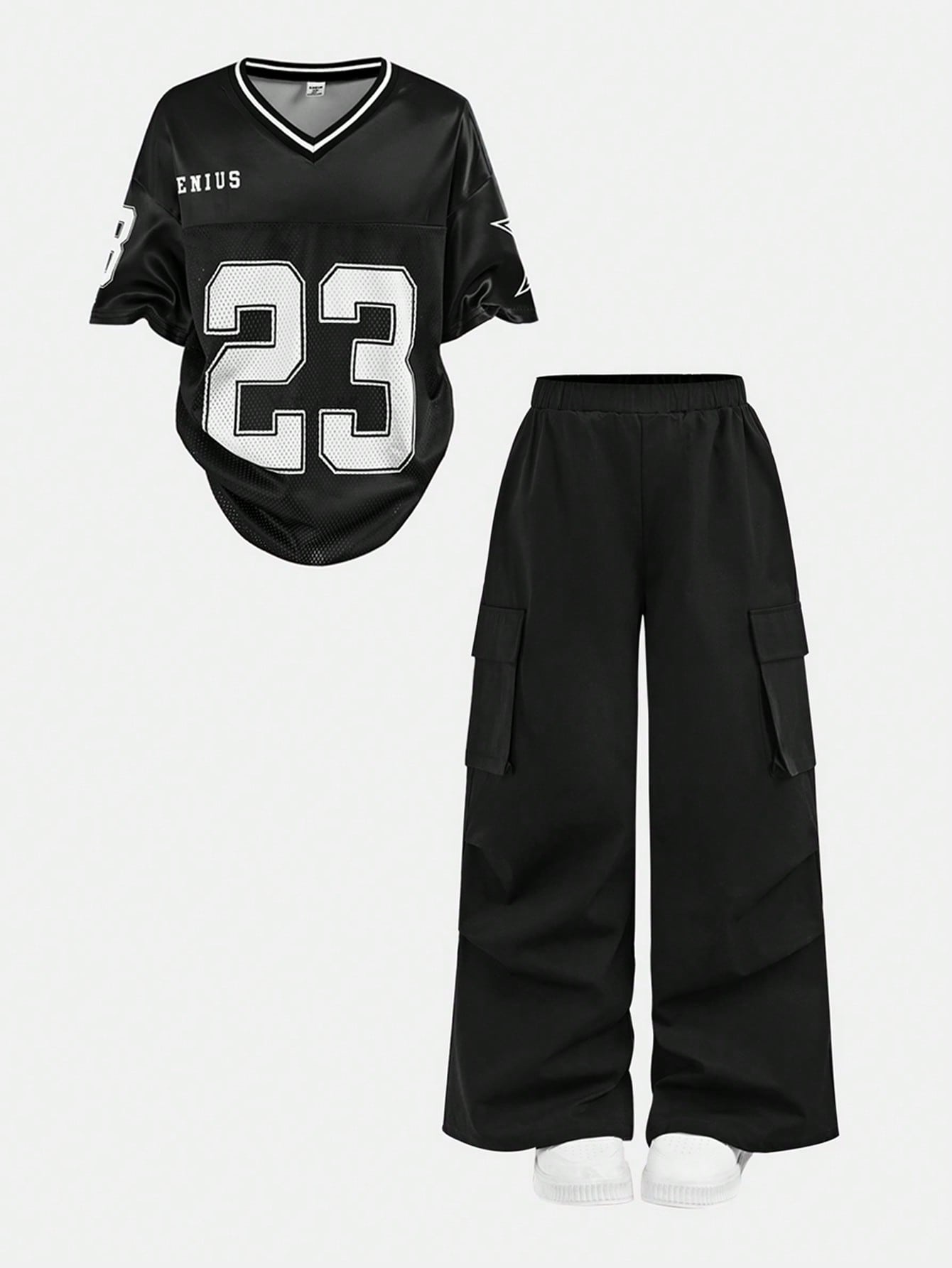 SHEIN Girlism Tween Girl Casual Streetwear Loose Jersey Print Top And Wide Leg Pants 2-Piece Set