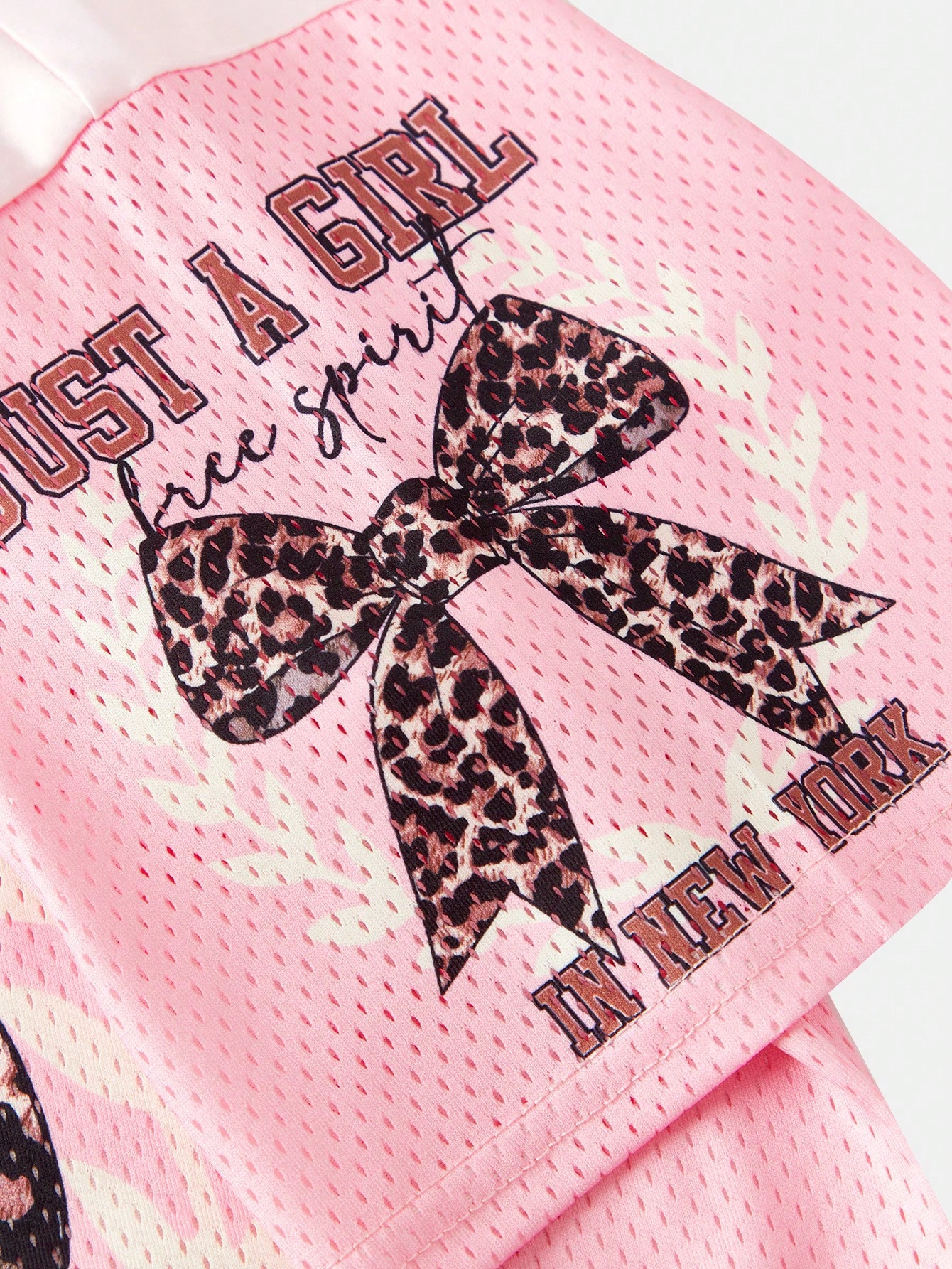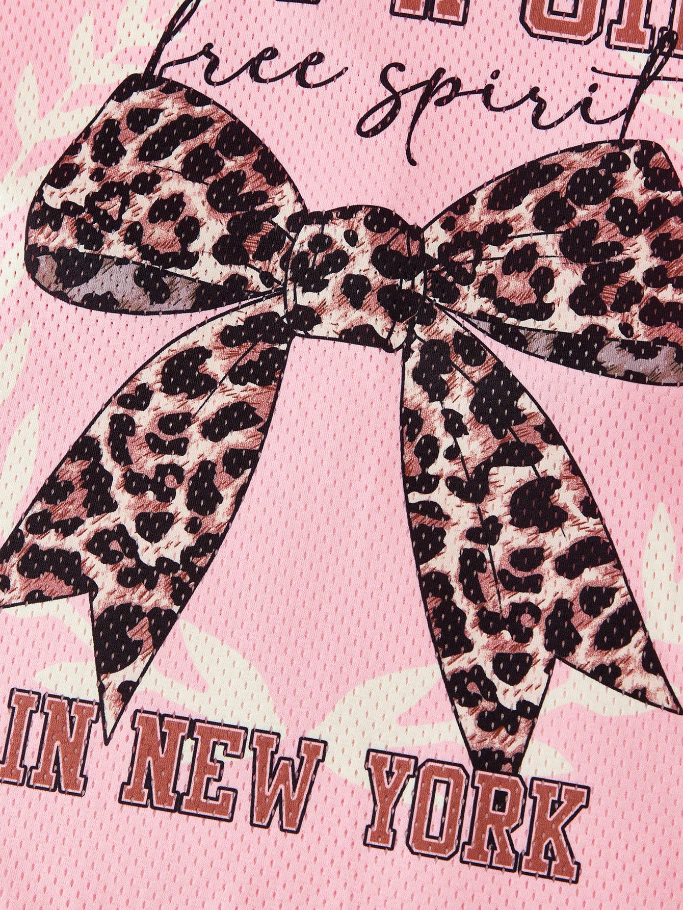 SHEIN Girlism Tween Girls Y2K Casual Streetwear Leopard Bow Slogan Graphic Print Mesh Splice V-Neck Boxy Short Sleeve Knit T-Shirt, Pink