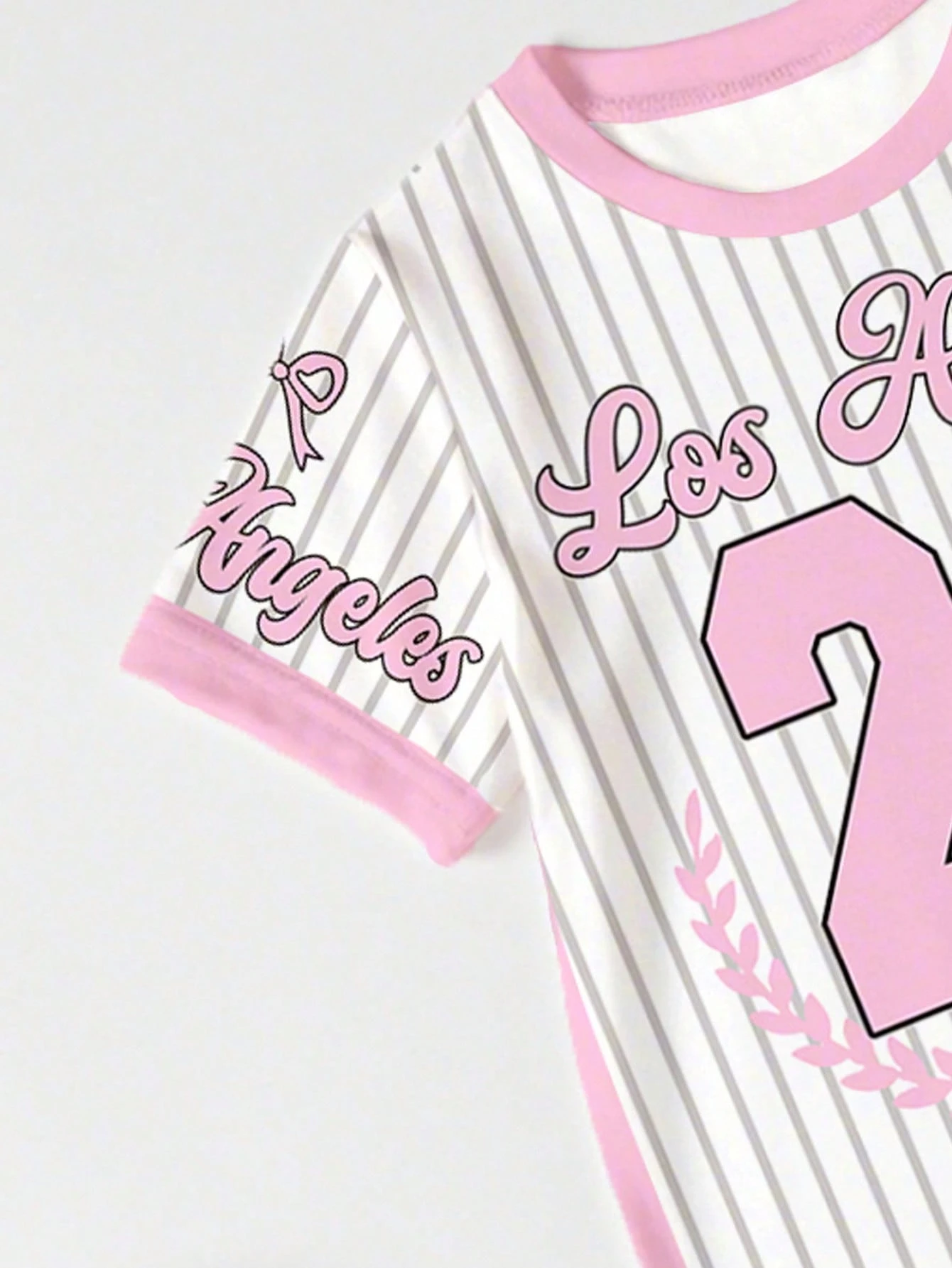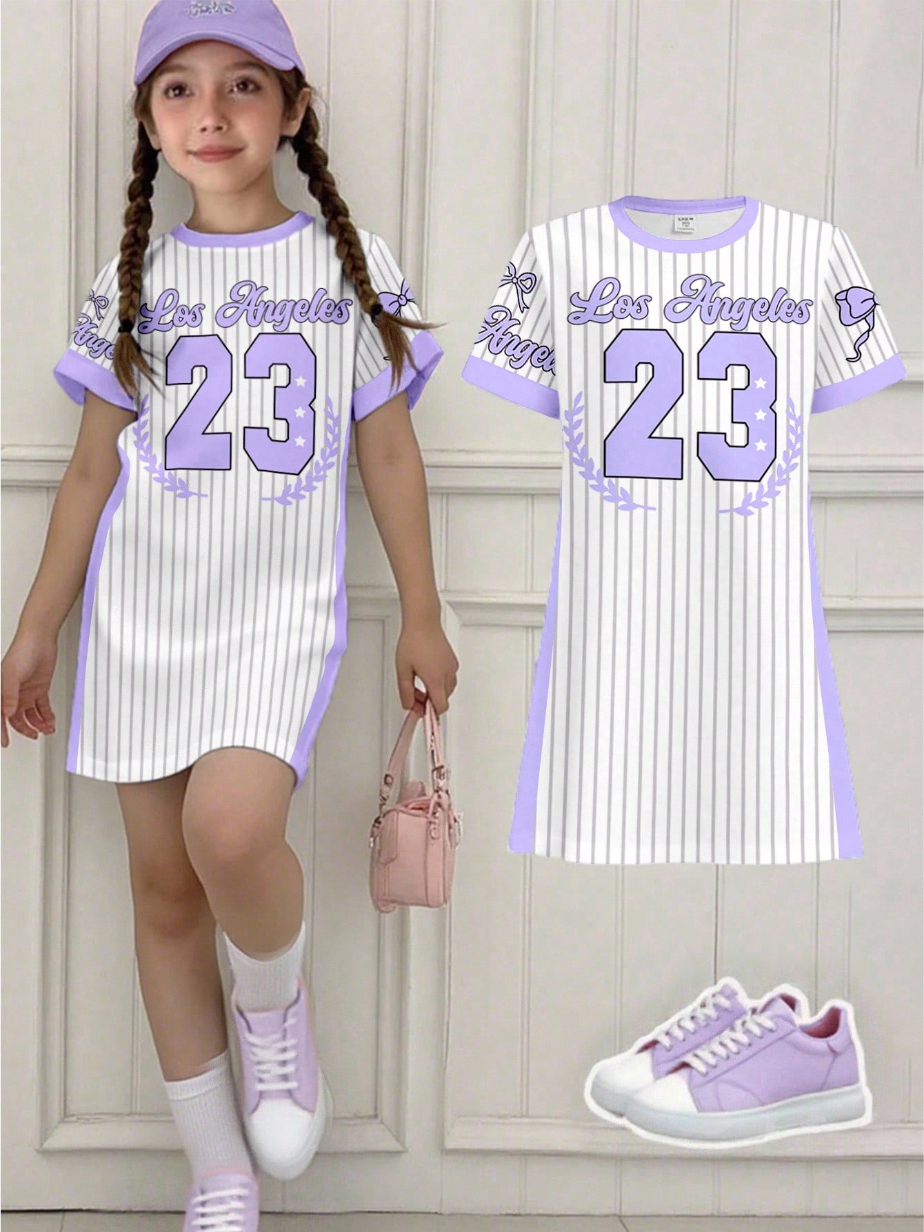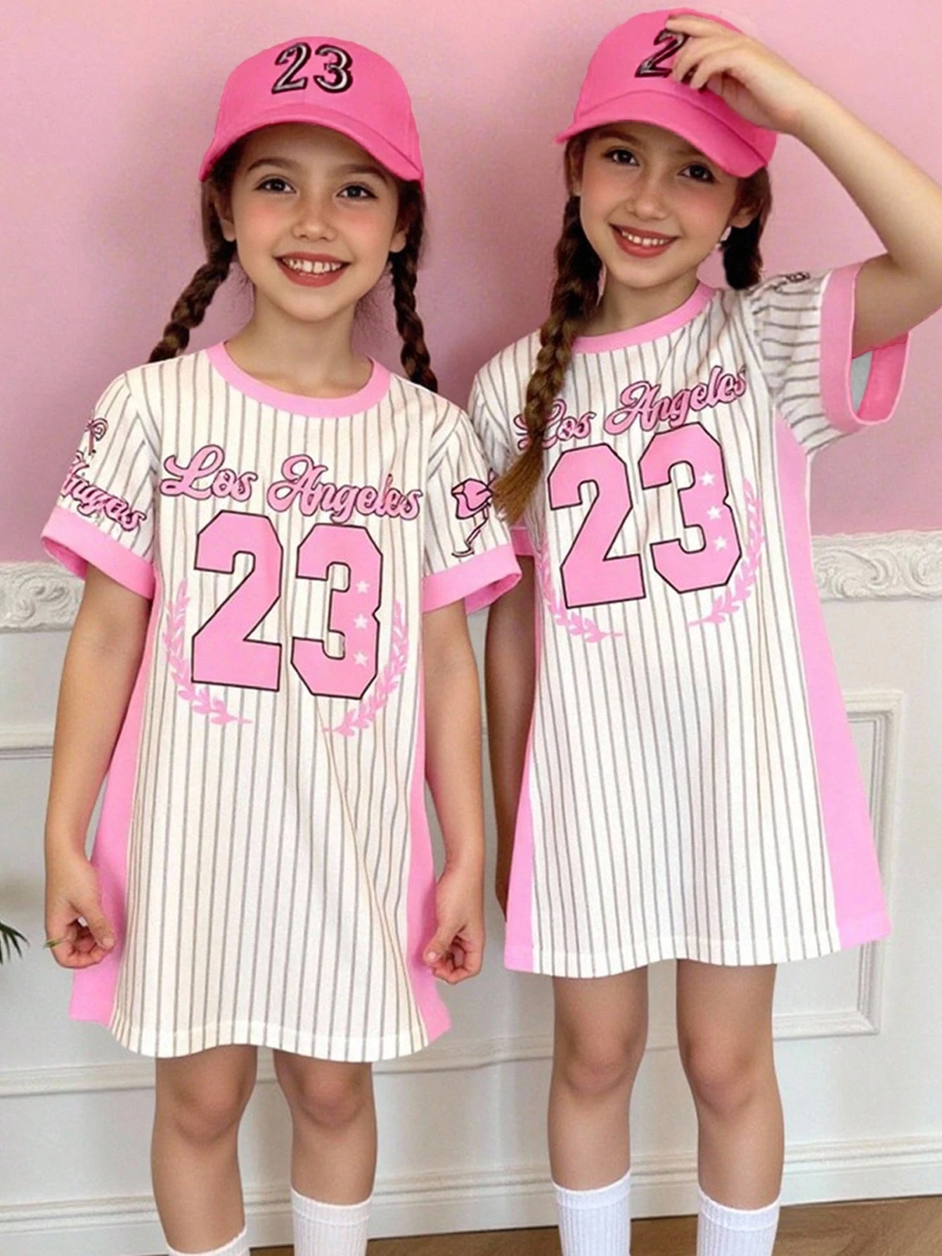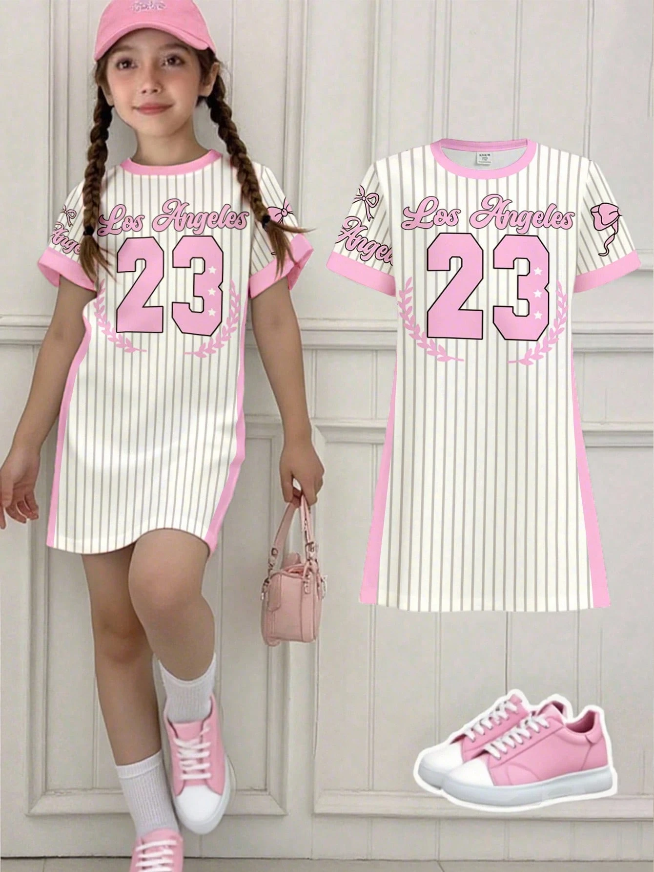 SHEIN Girls Casual & Fashionable LA 23 Stripes Slogan & Letter Print Short Sleeve T-Shirt Dress, Sibling Outfits Matching Set 2pcs Sold Separately Girls Sport Dress Baseball Dress Kids Clothes Girls Girls Pink Dress Girls Jersey Dress