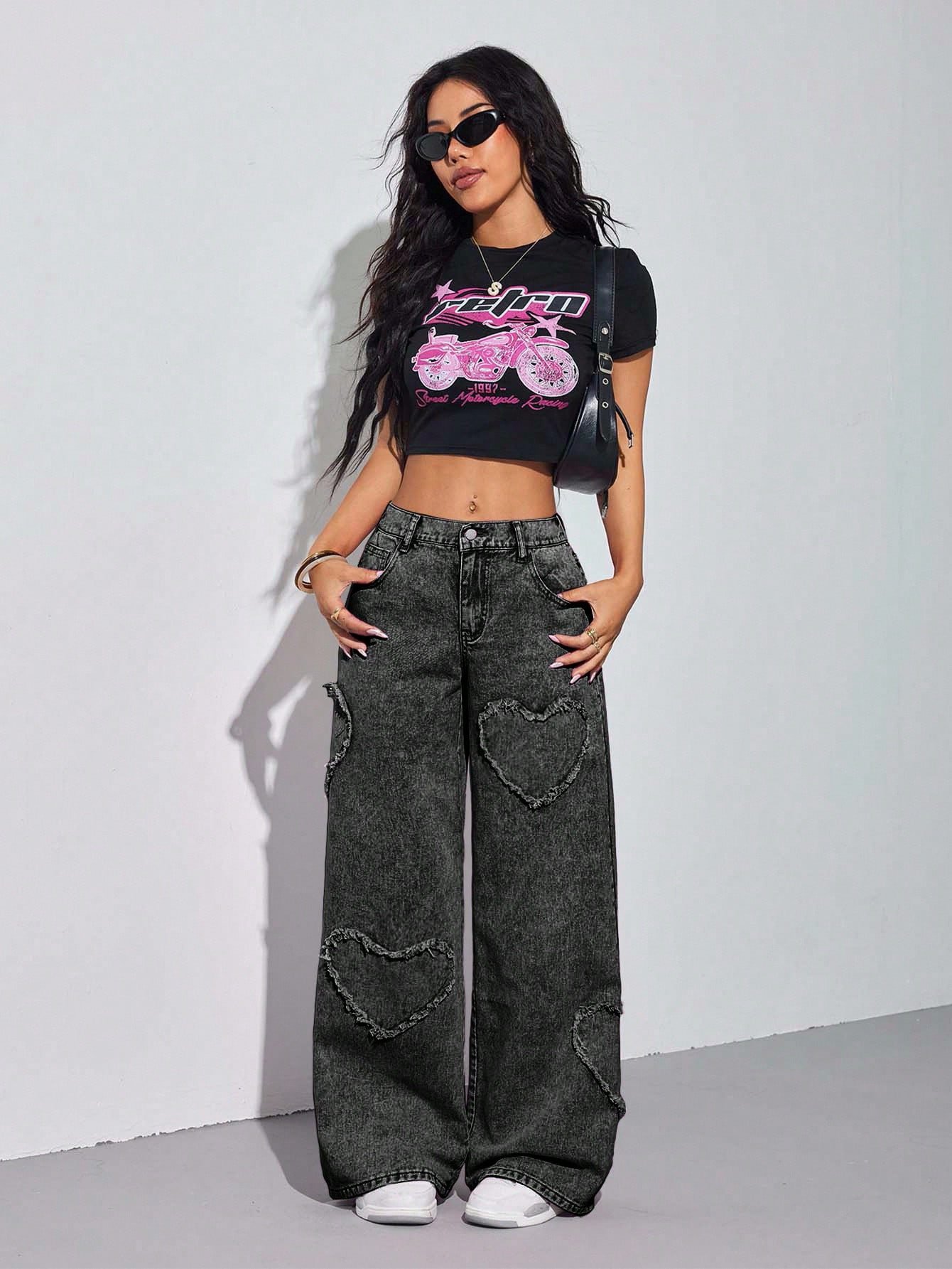 [Floral Wide-Leg Jeans] Women's High-Waisted Floral Print Wide-Leg Jeans – Casual Denim Pants with Zipper Detail, Light Floral Design, Comfortable All-Season Wear, High Waisted Jeans