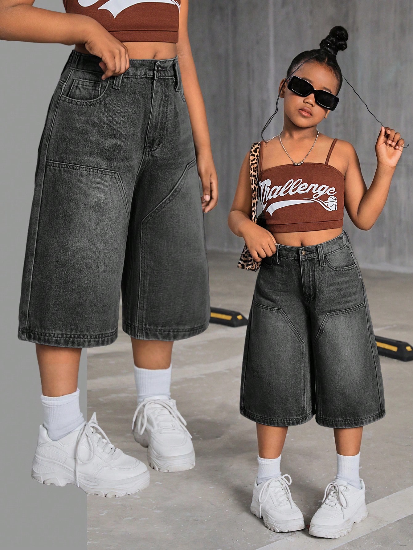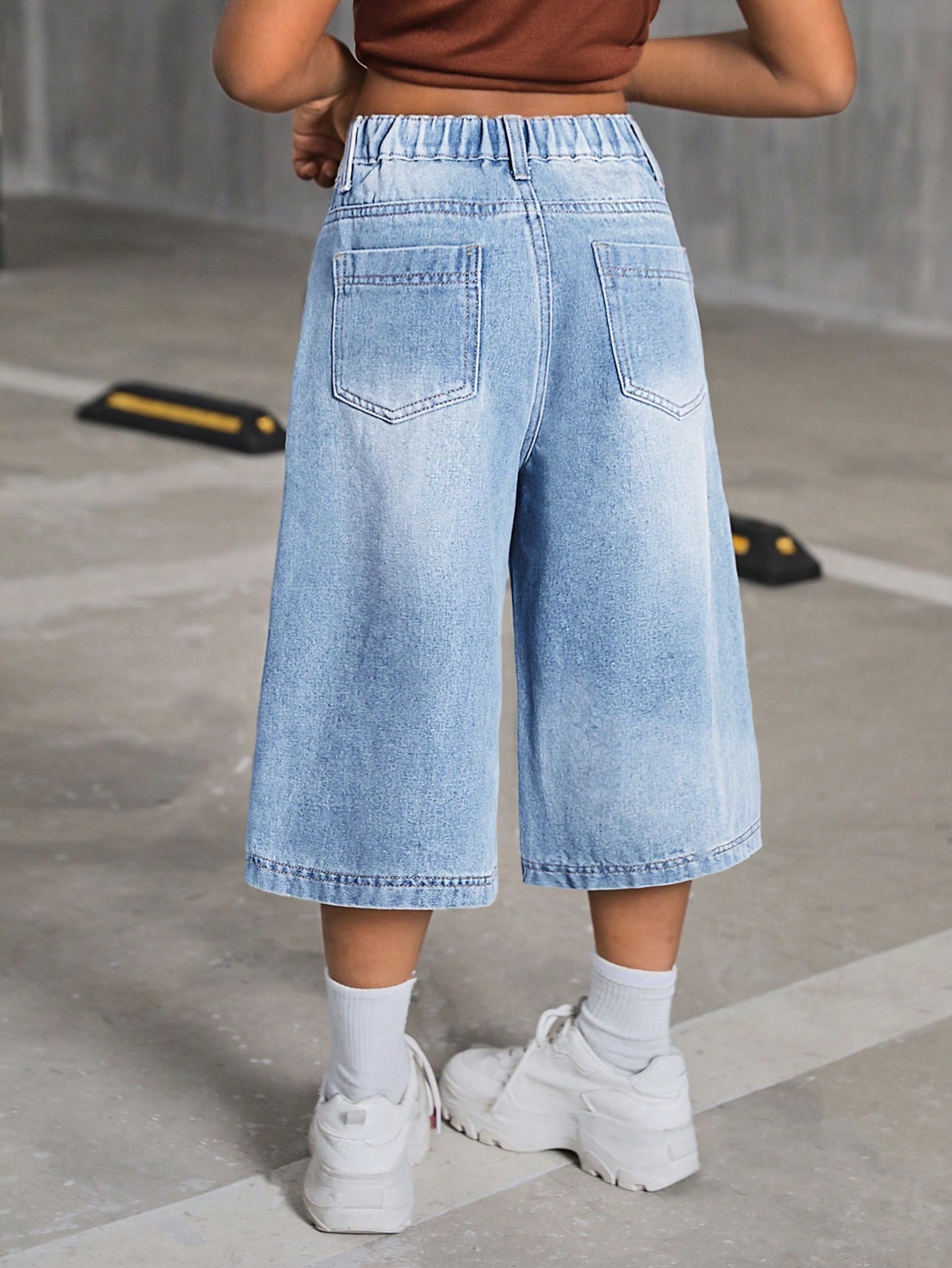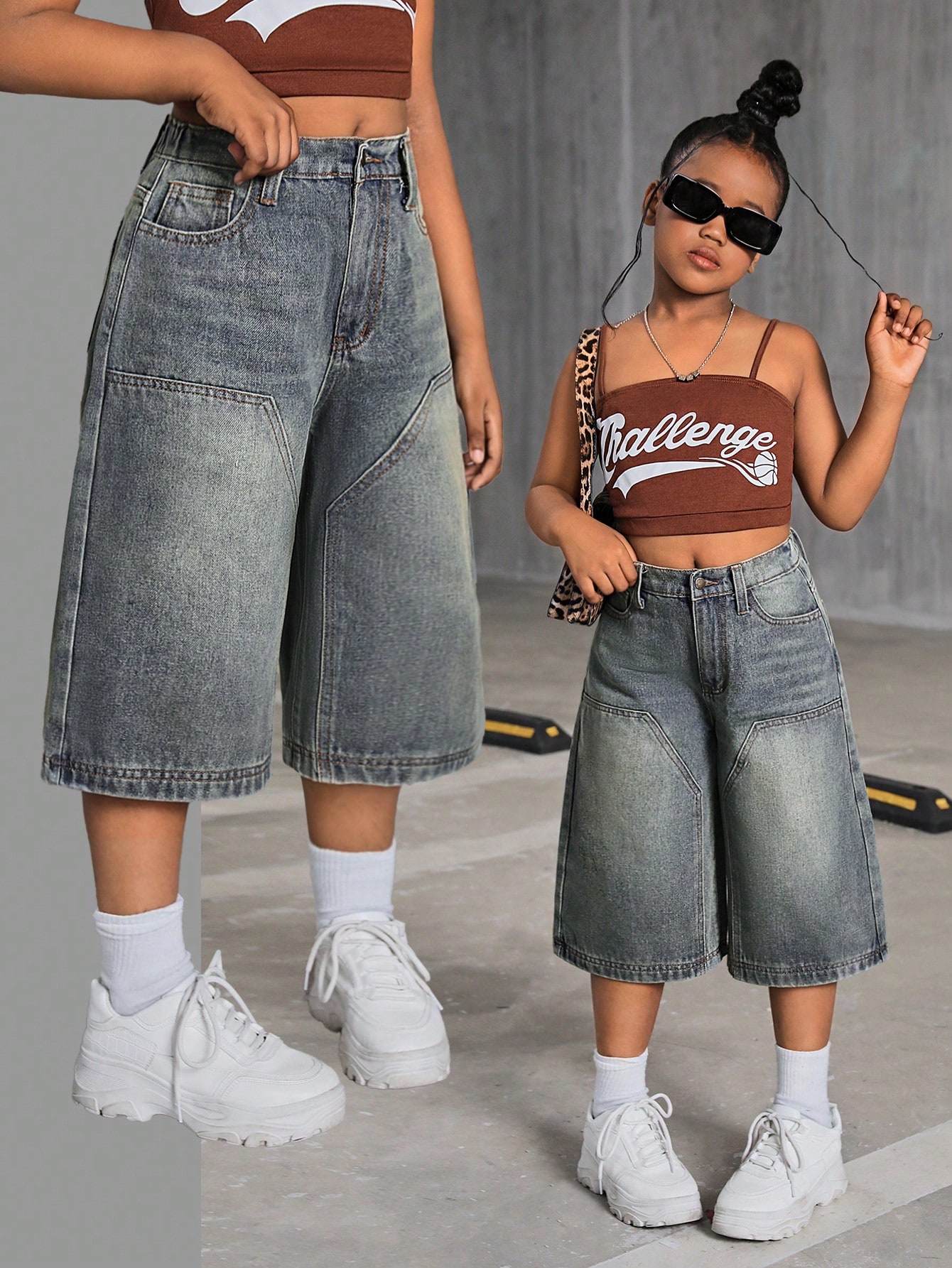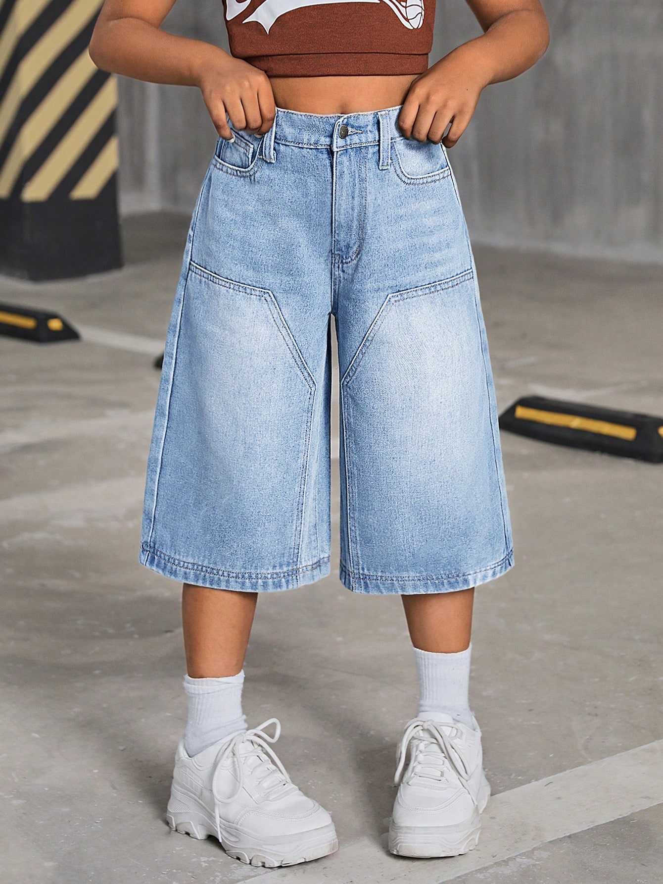 SHEIN Tween Girl Y2K 2000s Retro Washed Baggy Casual Denim Wide Leg Knee Length Jeans Shorts, Spring Summer Boho Concert Rave Festival Clothes Back To School Streetwear