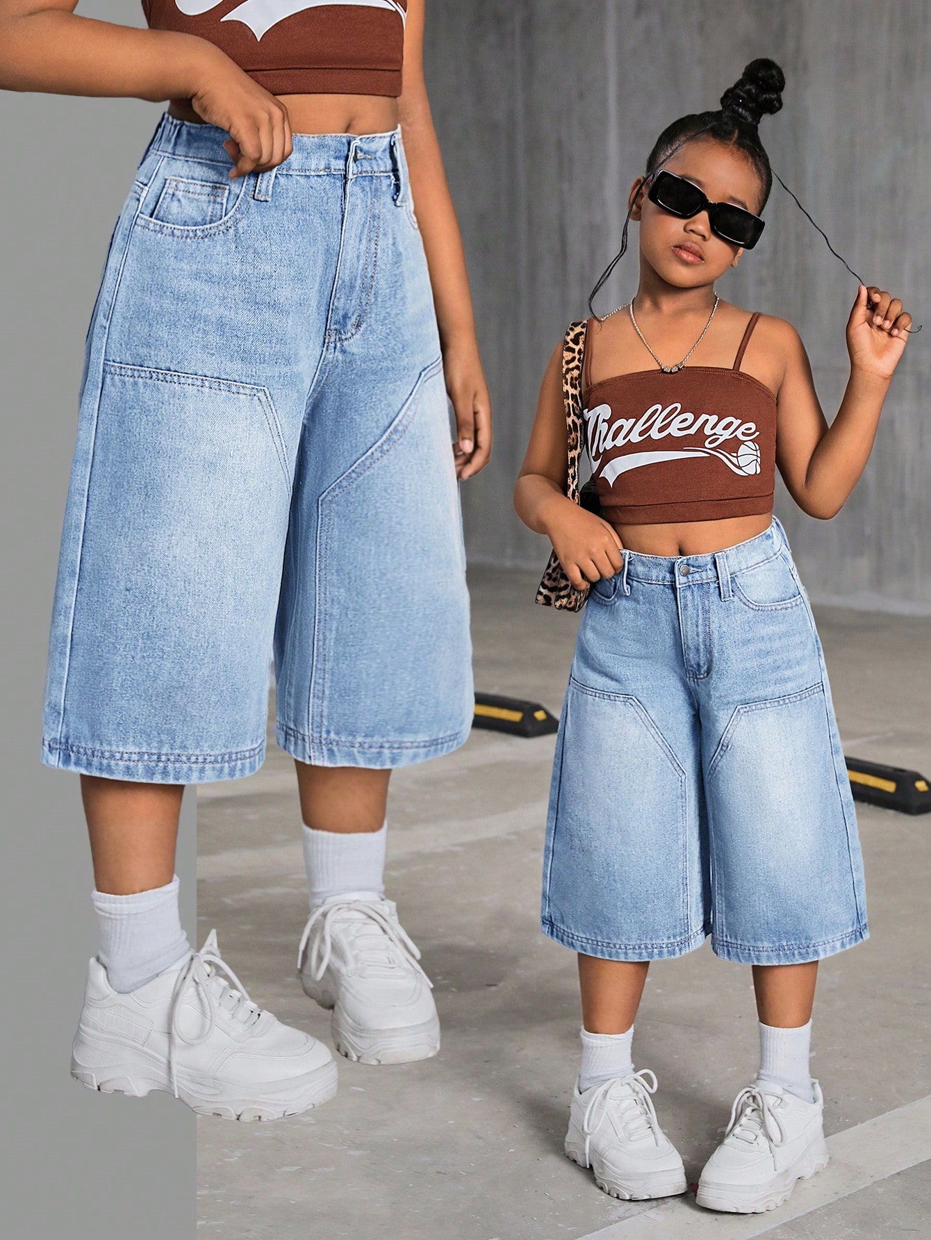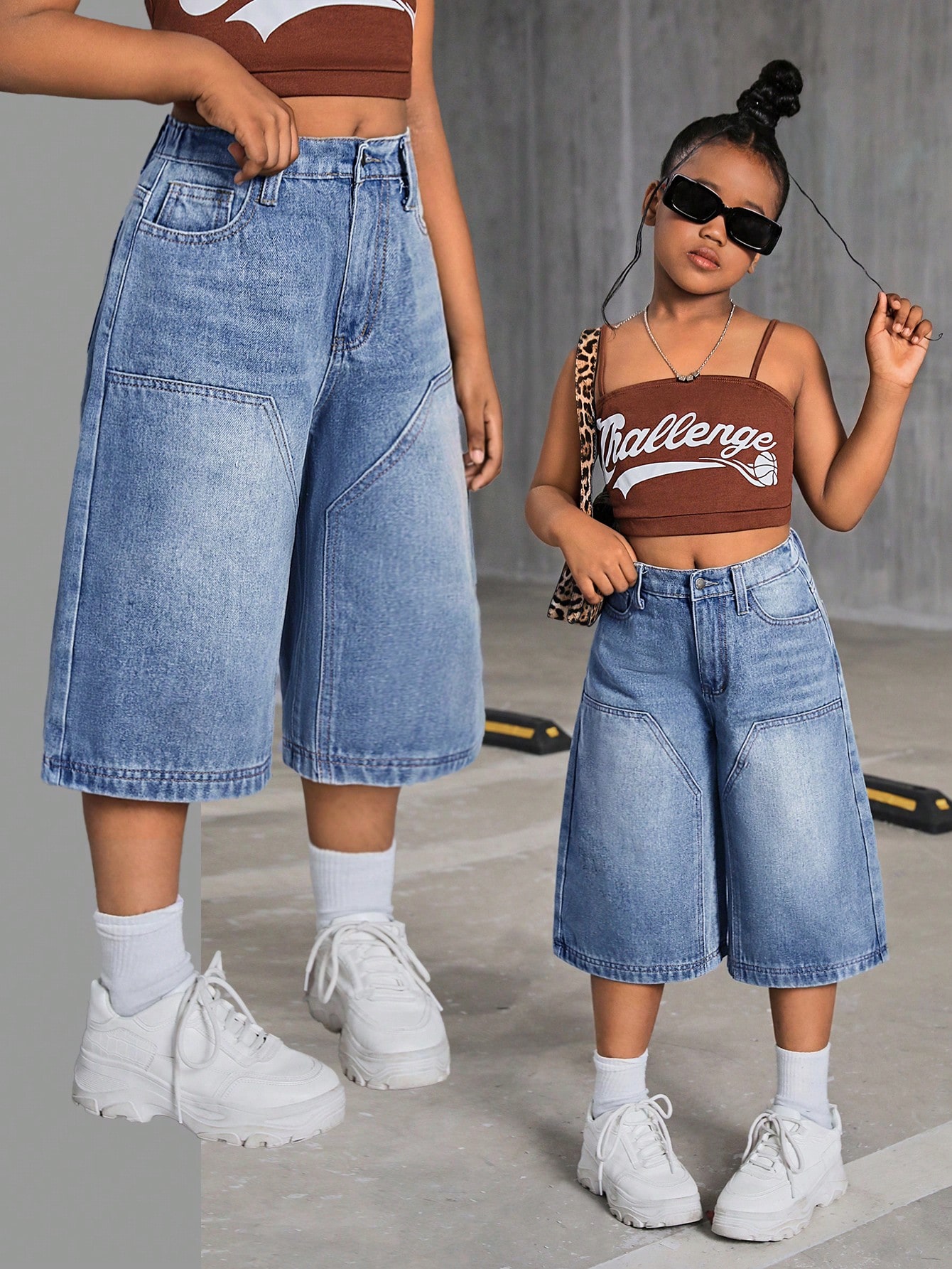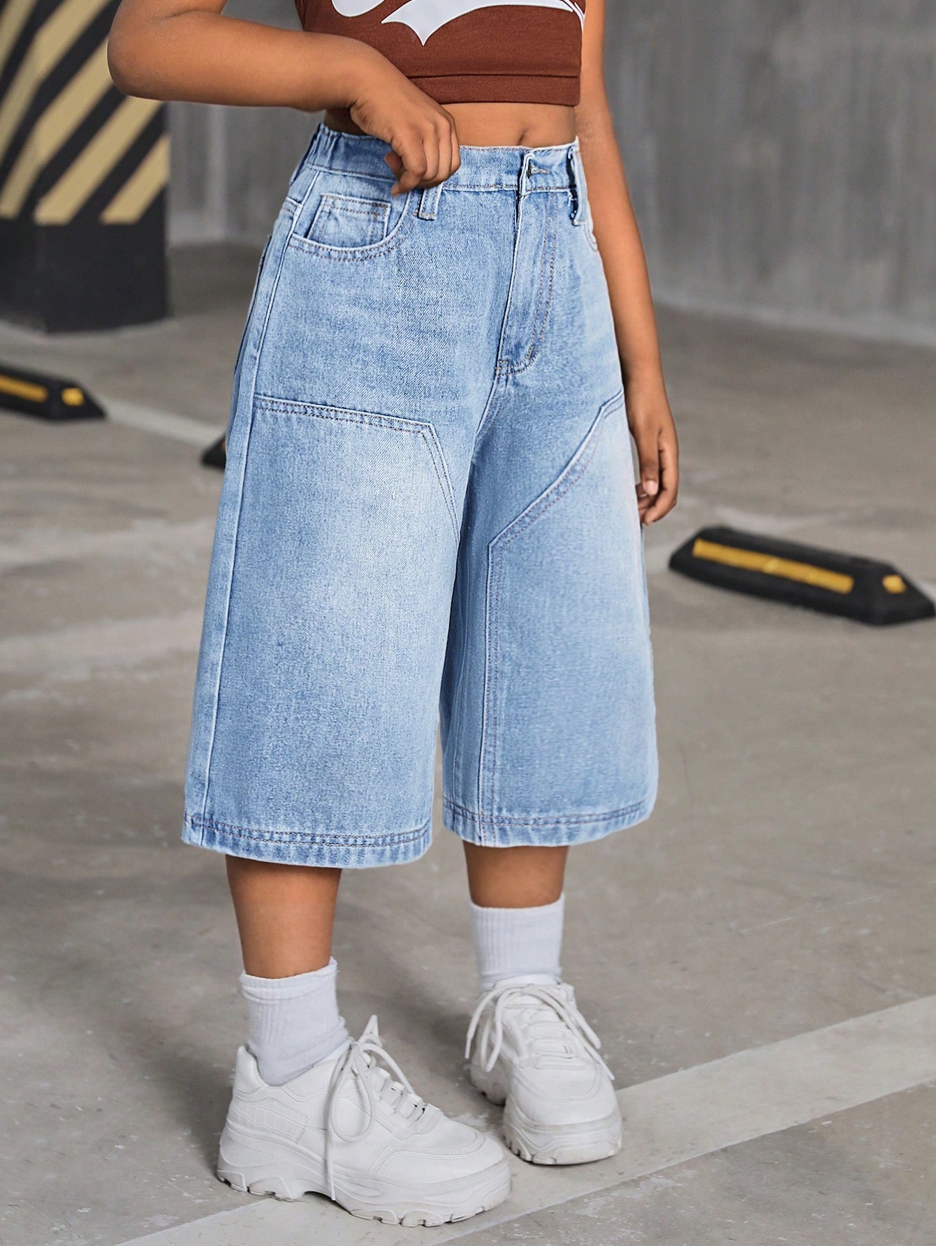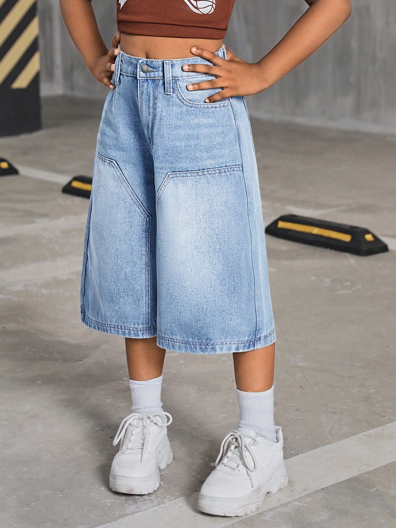 SHEIN Tween Girl Y2K 2000s Retro Washed Baggy Casual Denim Wide Leg Knee Length Jeans Shorts, Spring Summer Boho Concert Rave Festival Clothes Back To School Streetwear