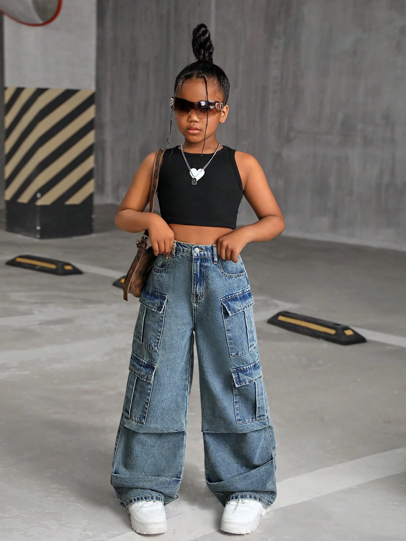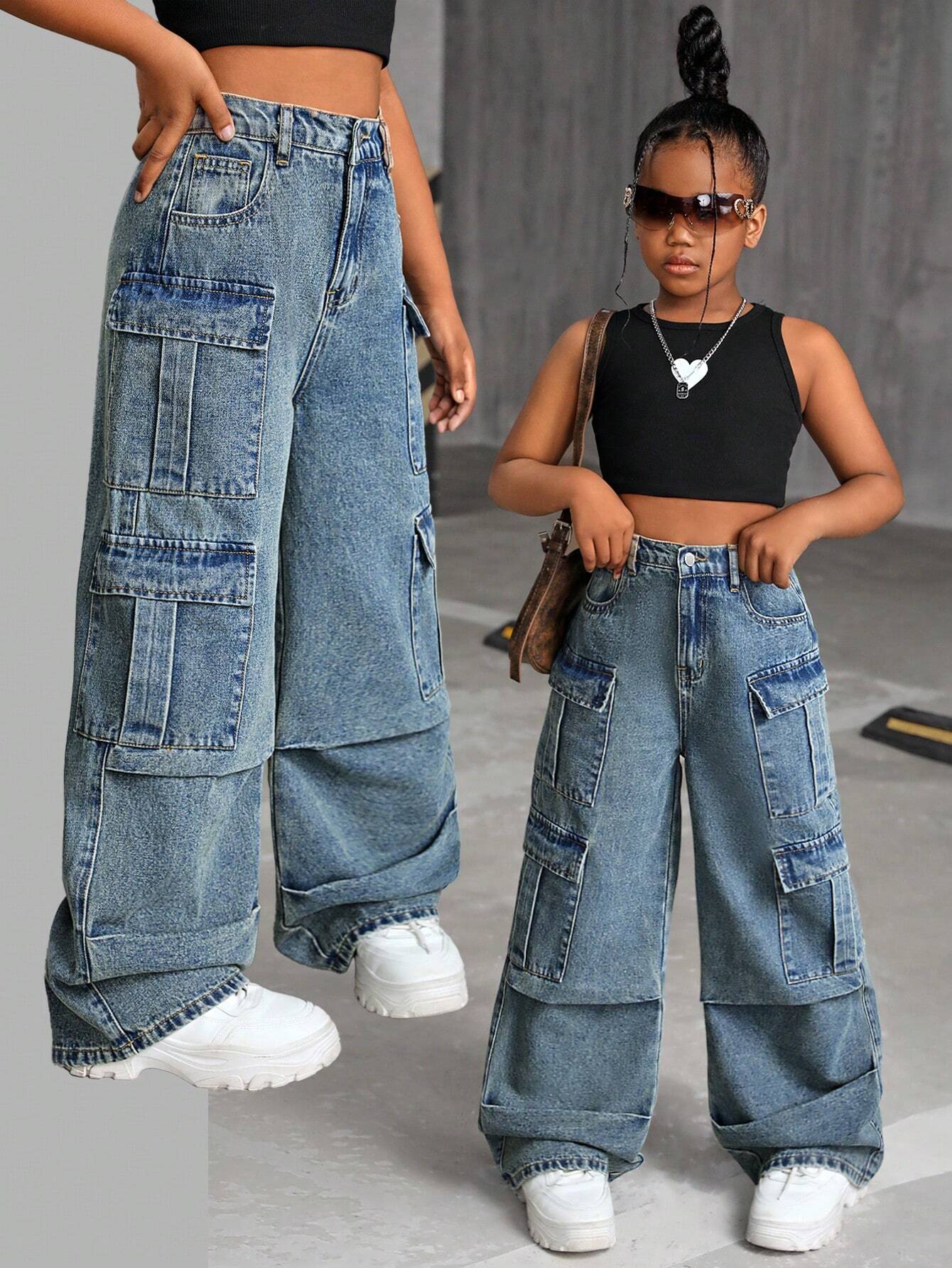 SHEIN Tween Girl Y2K Fashion Vintage Washed Multi-Pocket Distressed Cargo Jeans Baggy Wide Leg Pants, Tween Girl Fall Clothes Back To School Streetwear Outfits