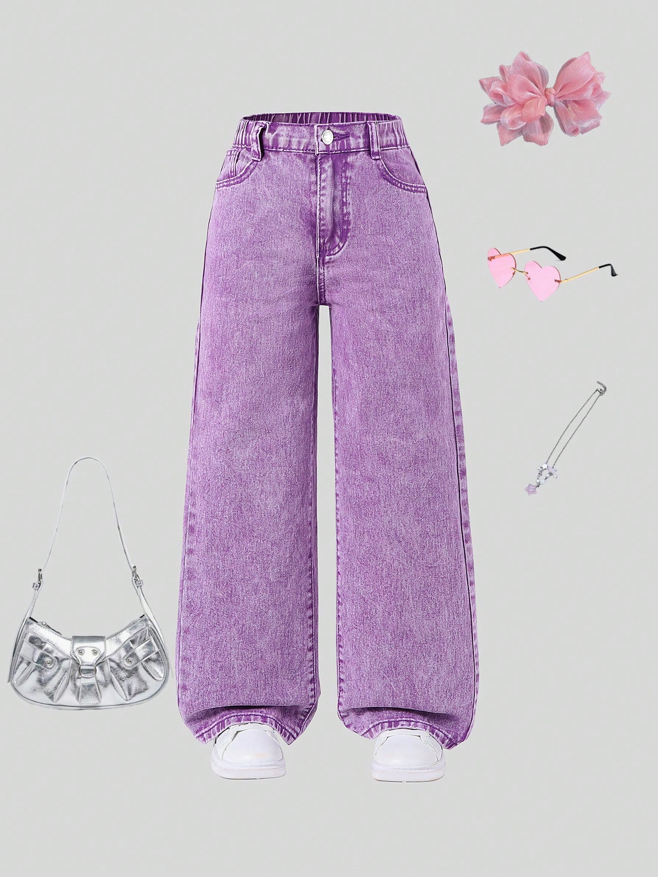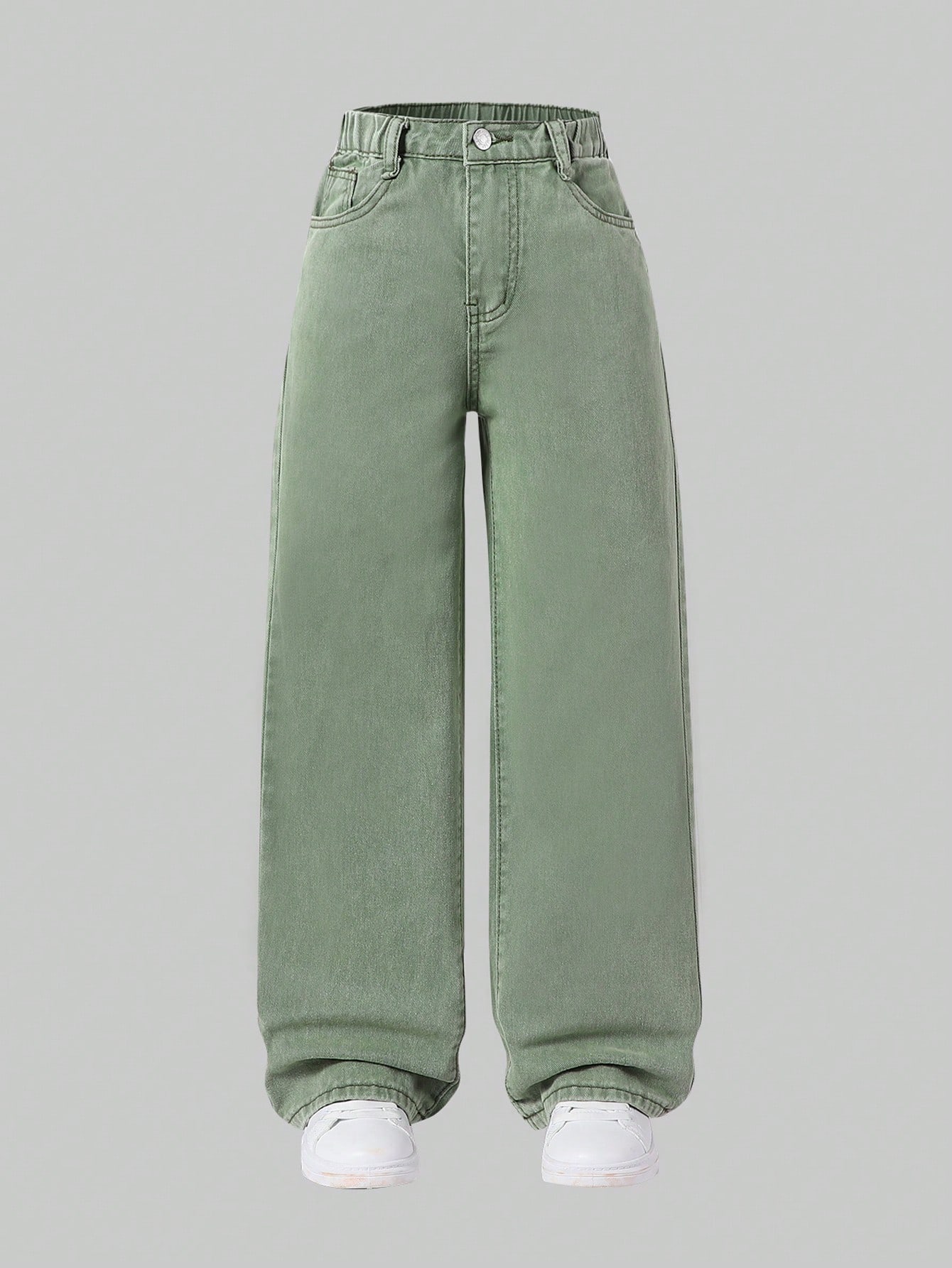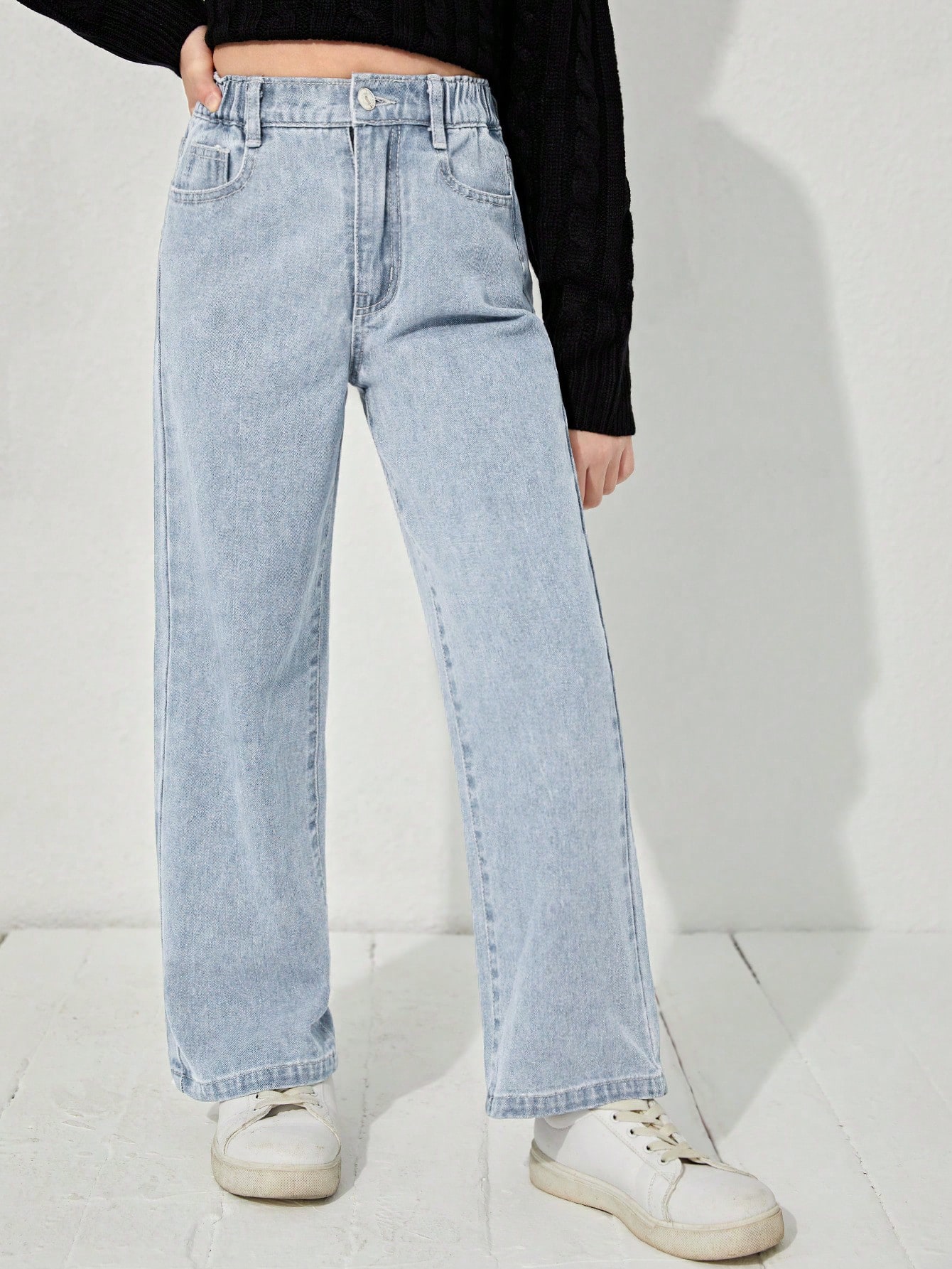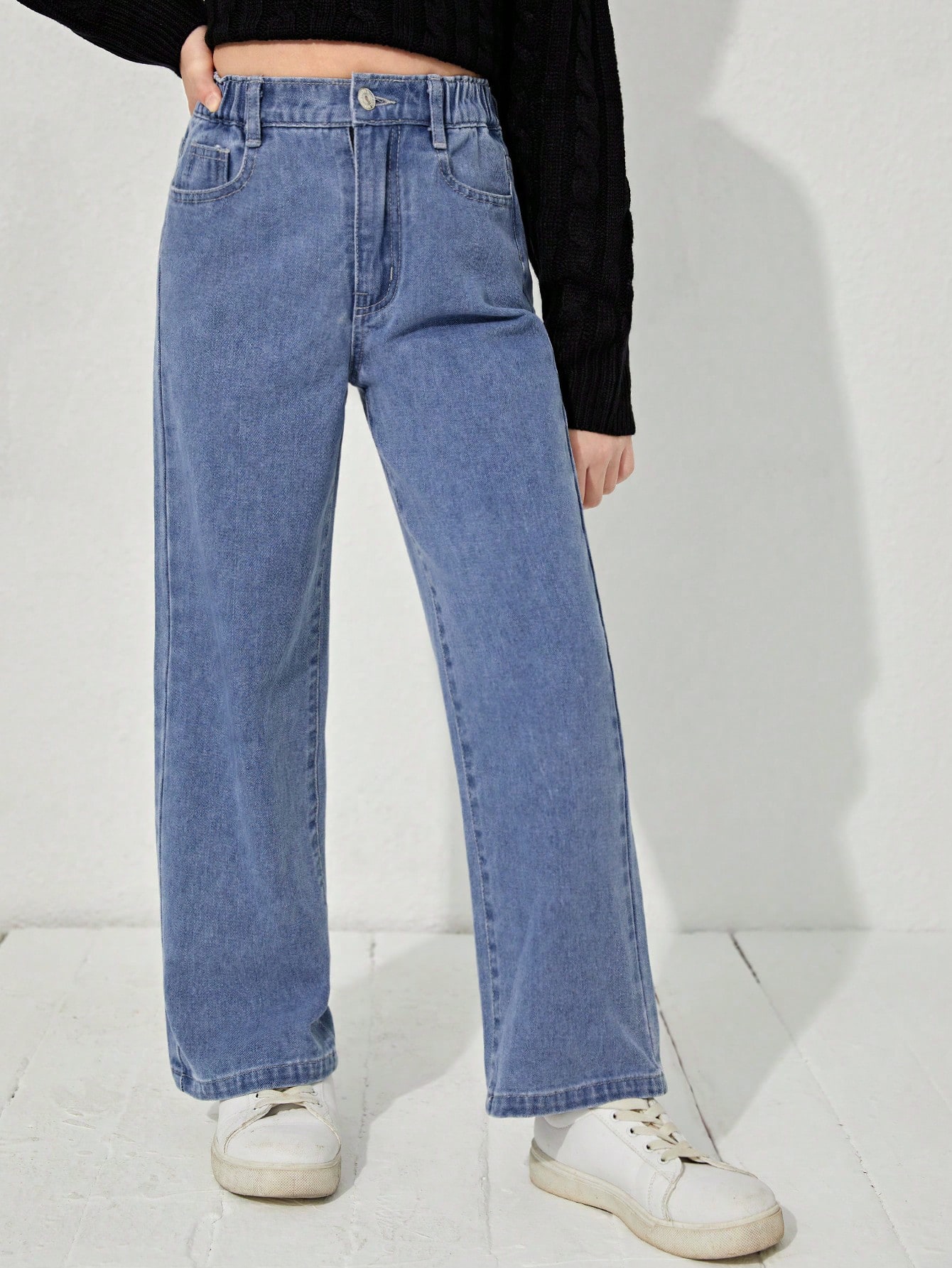 SHEIN Tween Girl Y2K Street Daily Elastic Waist Straight Jeans With Flat Pockets, Girls Daily OOTD Outfits, School, Campus, College