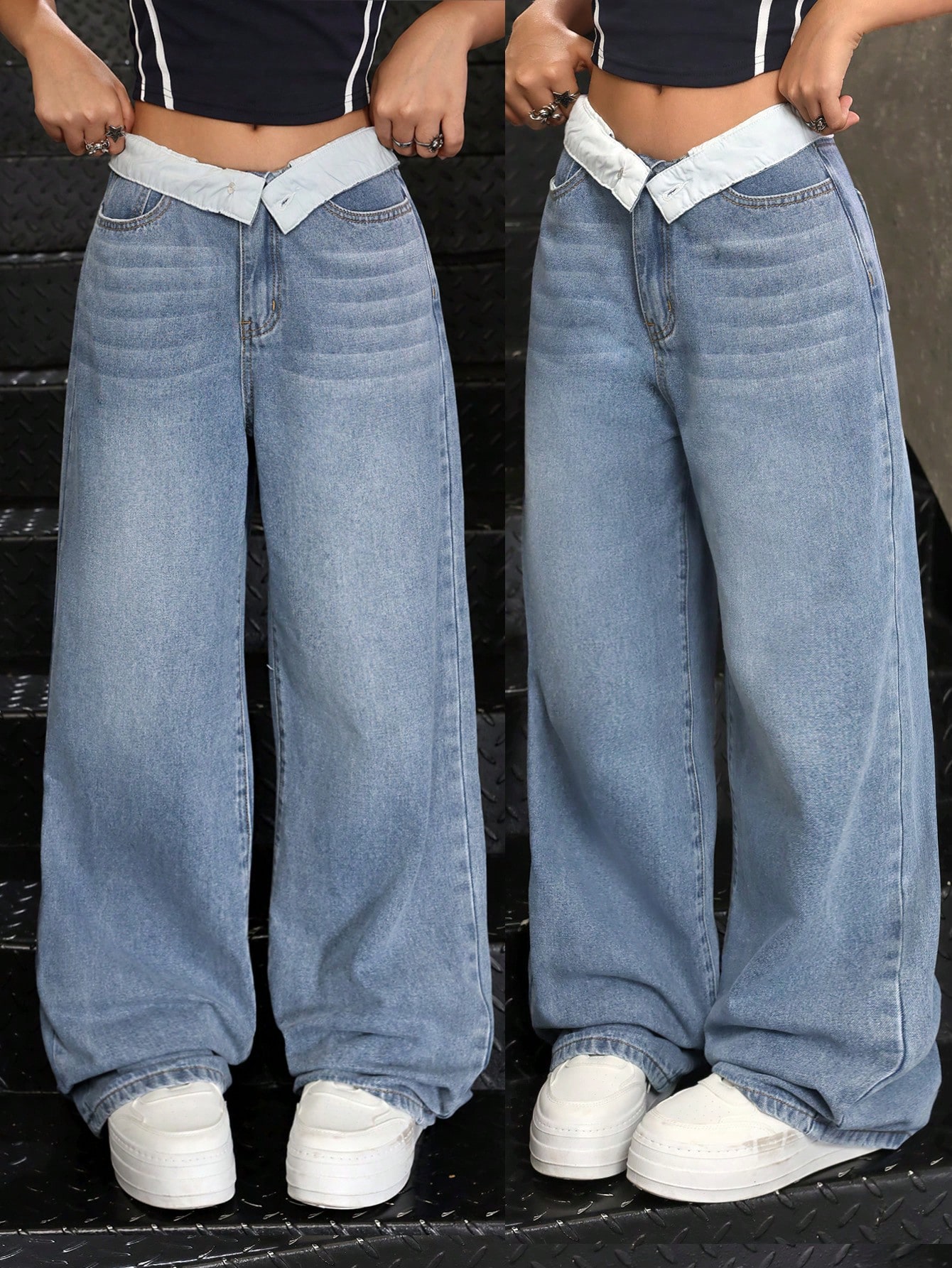 SHEIN Tween Girls' Casual Distressed Two-Tone Waistband Denim Jeans