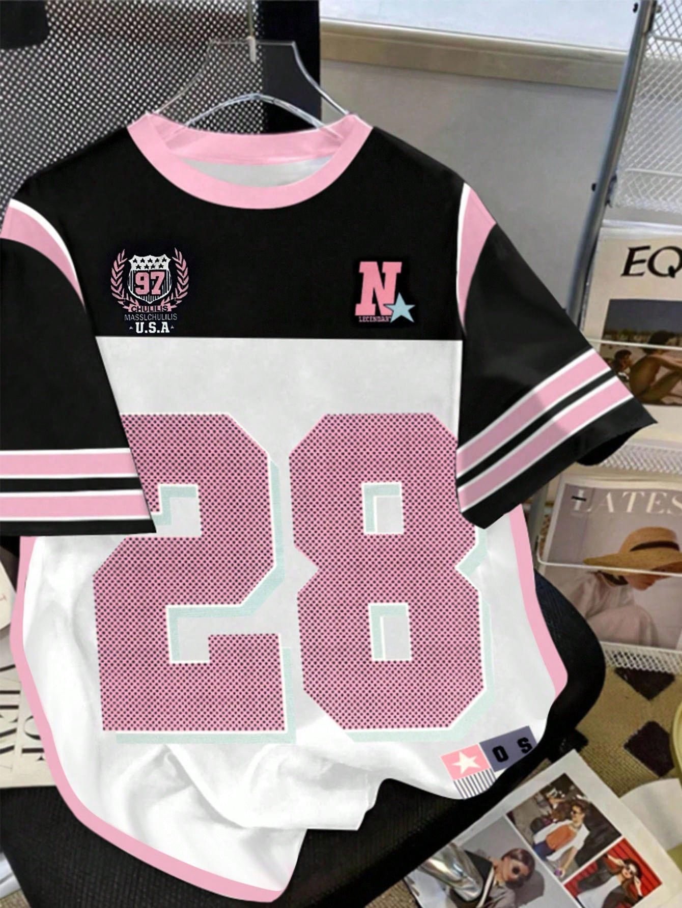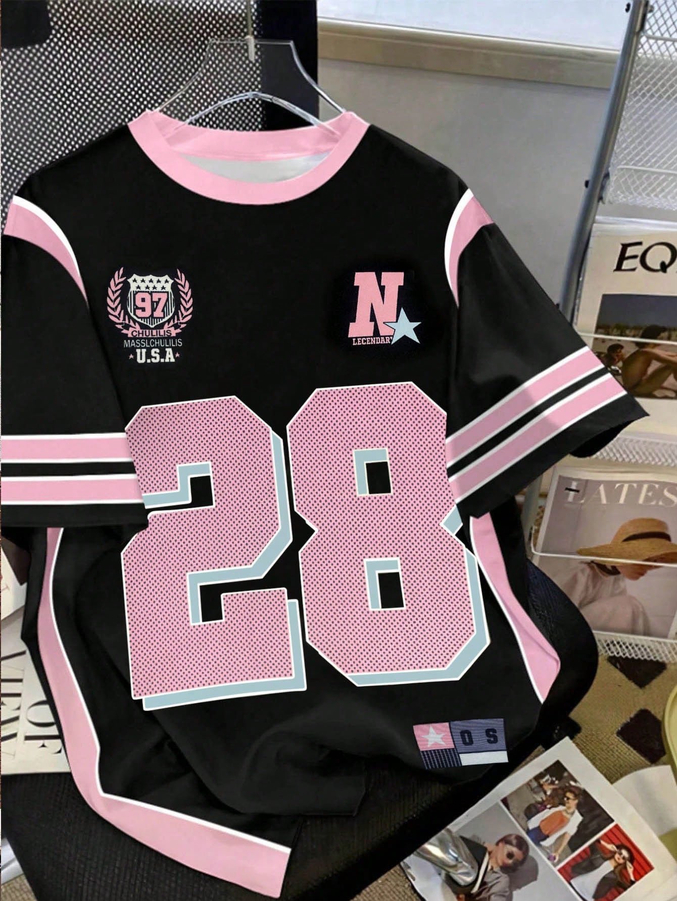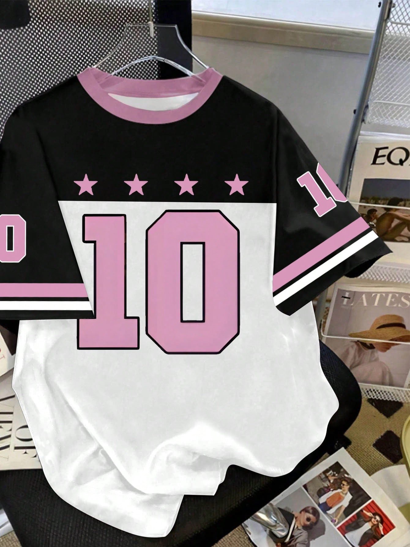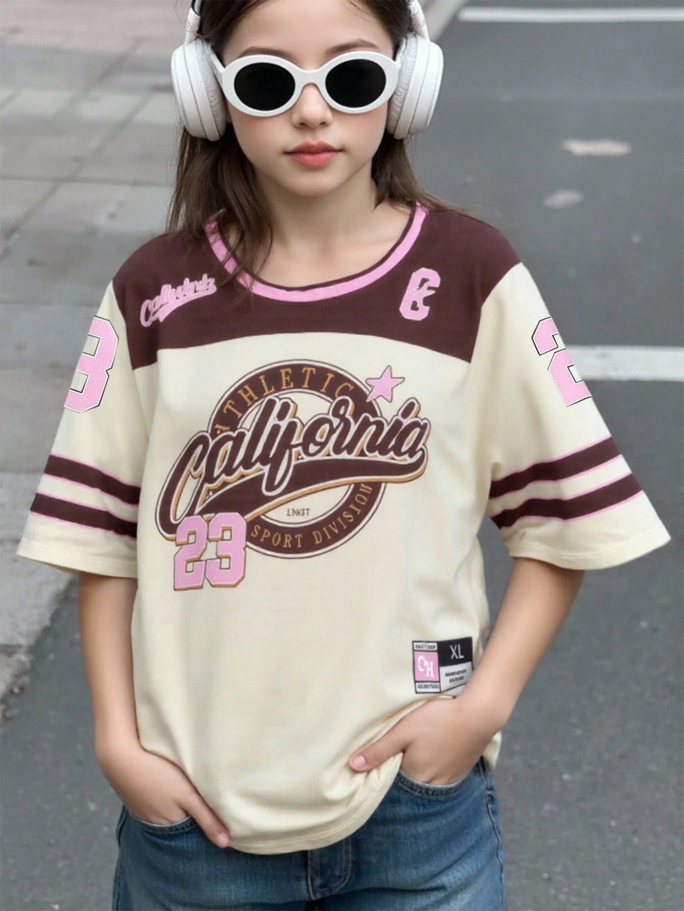 SHEIN Tween Girls' Sporty Casual Fashion Number 28 Colorblock Striped Print Short Sleeve T-Shirt, Pink/Black/White, Summer