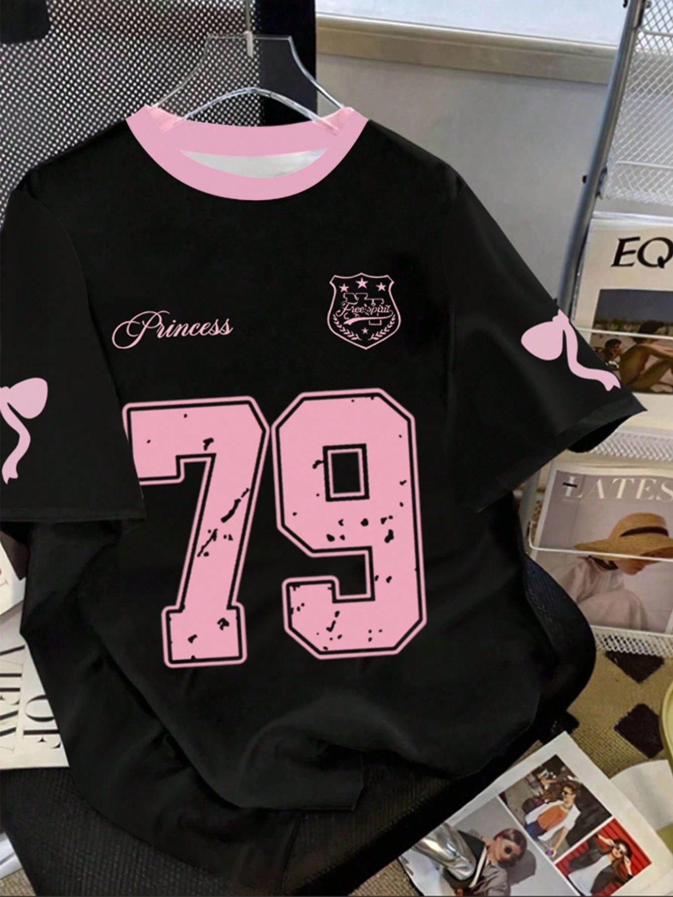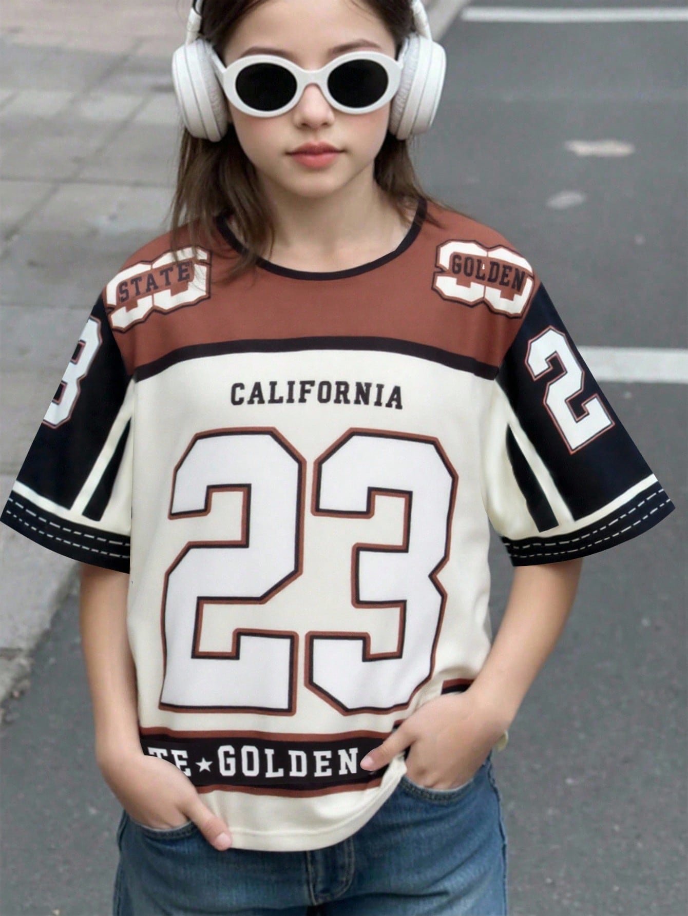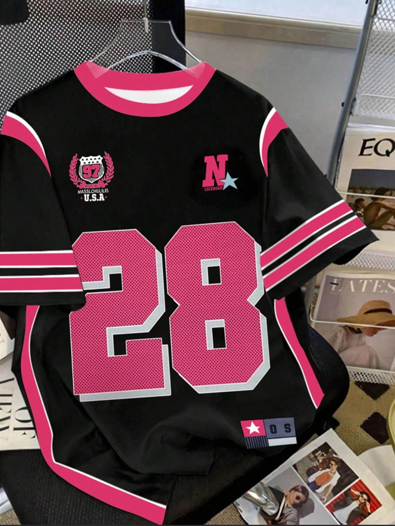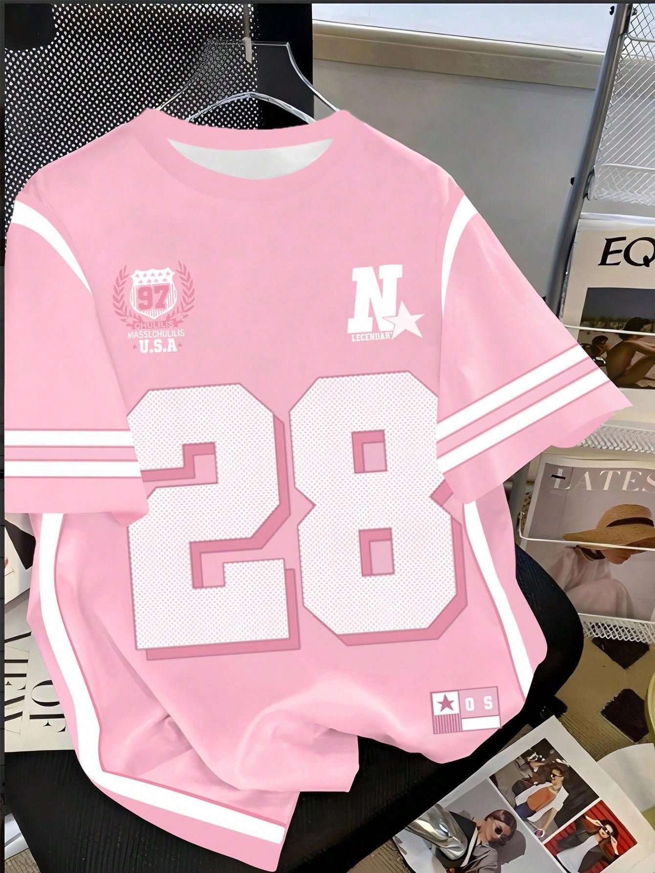SHEIN Tween Girls' Sporty Casual Fashion Number 28 Colorblock Striped Print Short Sleeve T-Shirt, Pink/Black/White, Summer