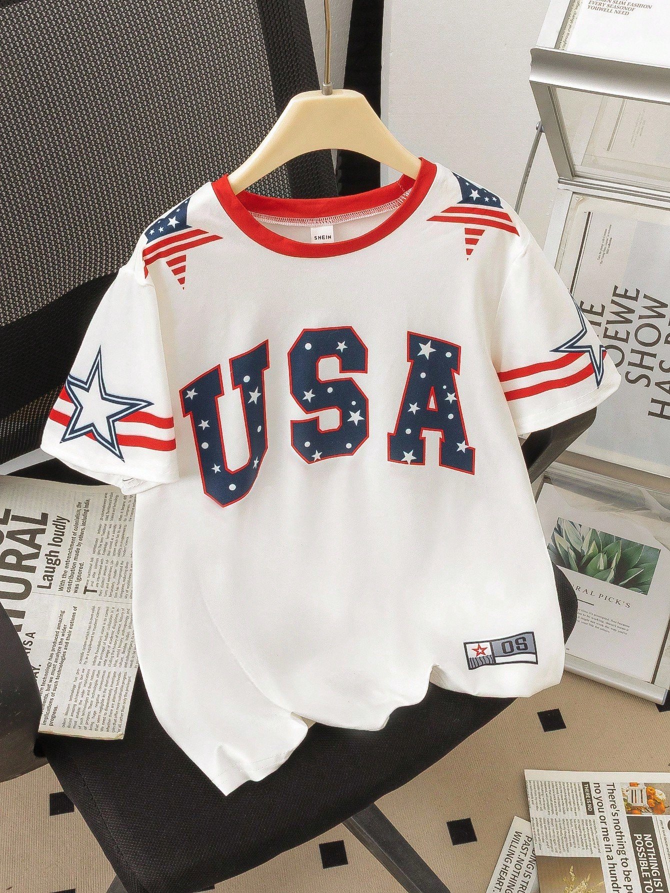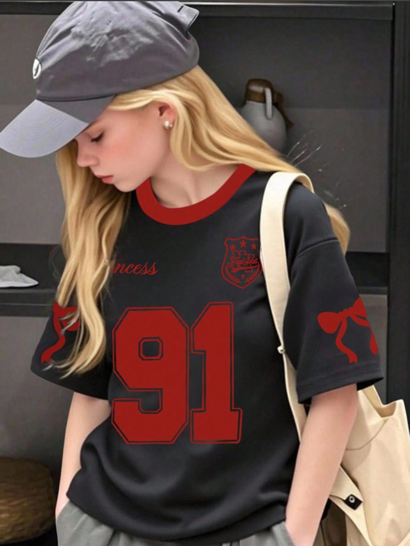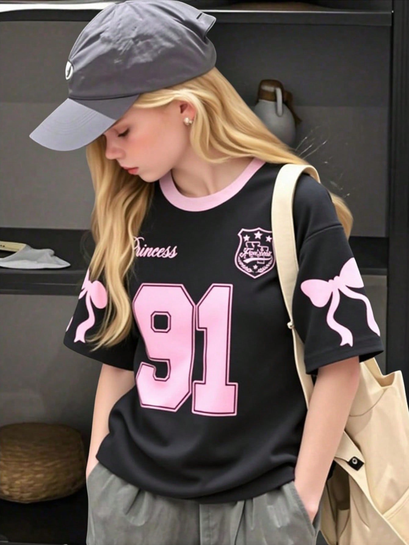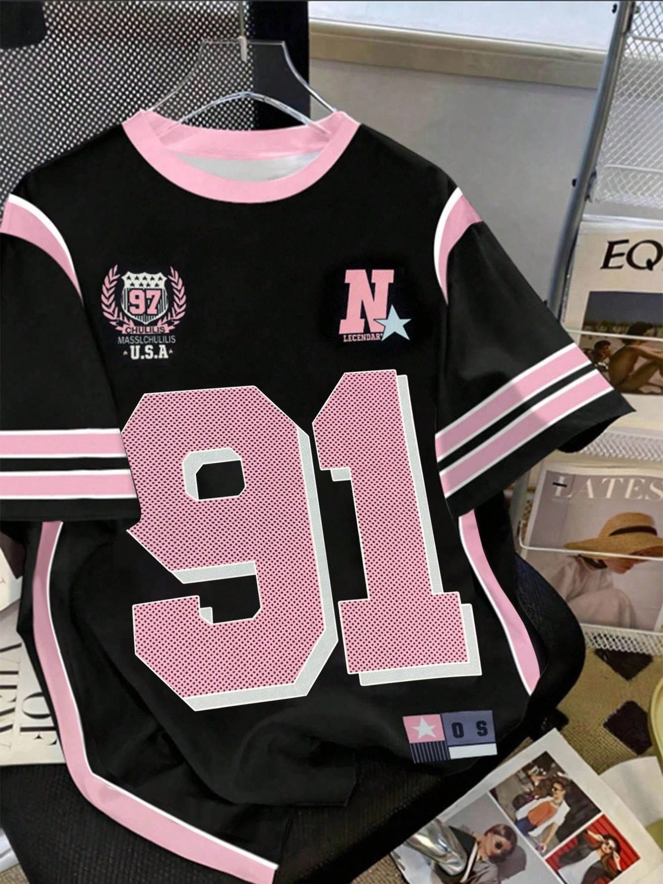 SHEIN Tween Girls' Sporty Casual Fashion Number 28 Colorblock Striped Print Short Sleeve T-Shirt, Pink/Black/White, Summer