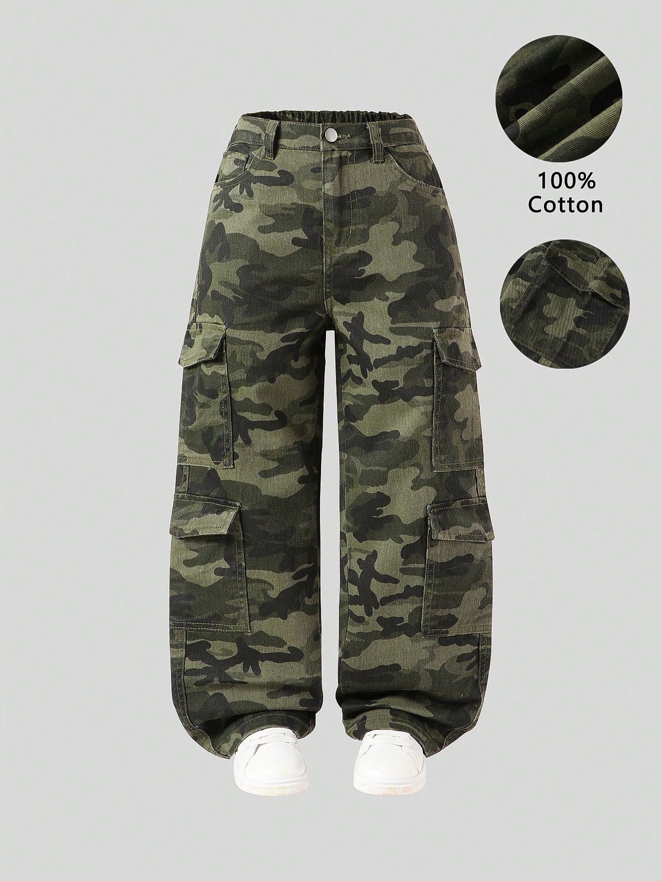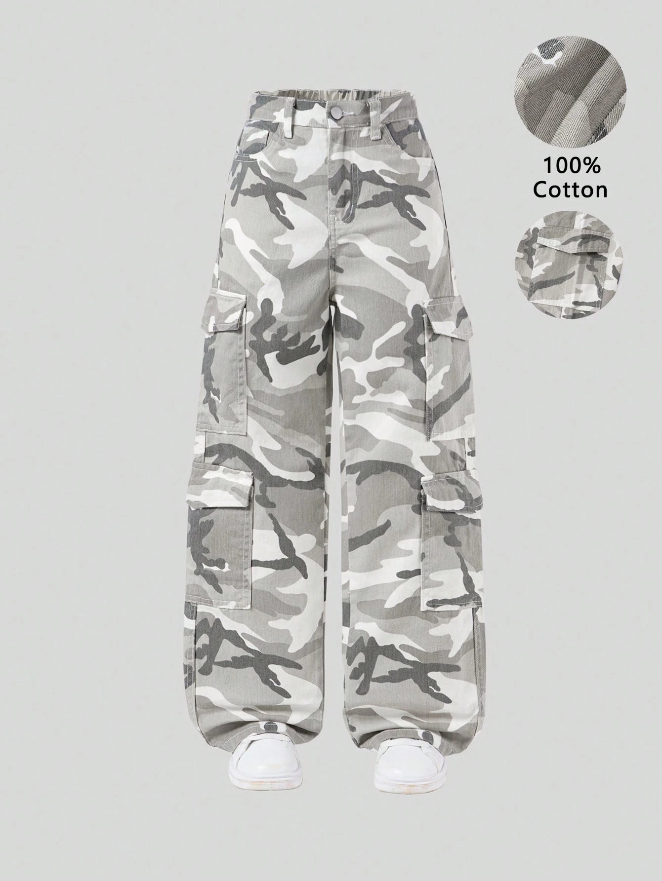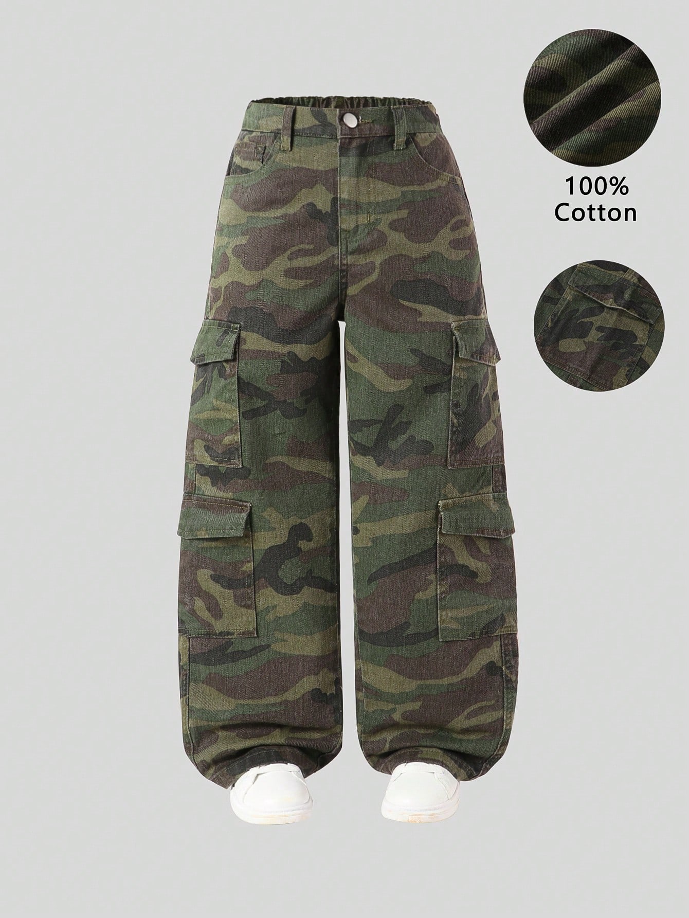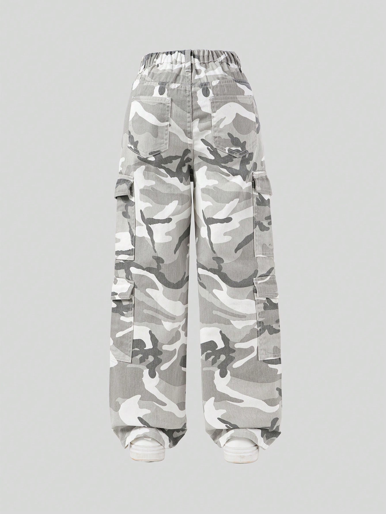 SHEIN Tween Girls Y2K Casual Multi Pocket Street Drawstring Waist Light Color Camouflage Print Cargo Jeans, School, Campus, College