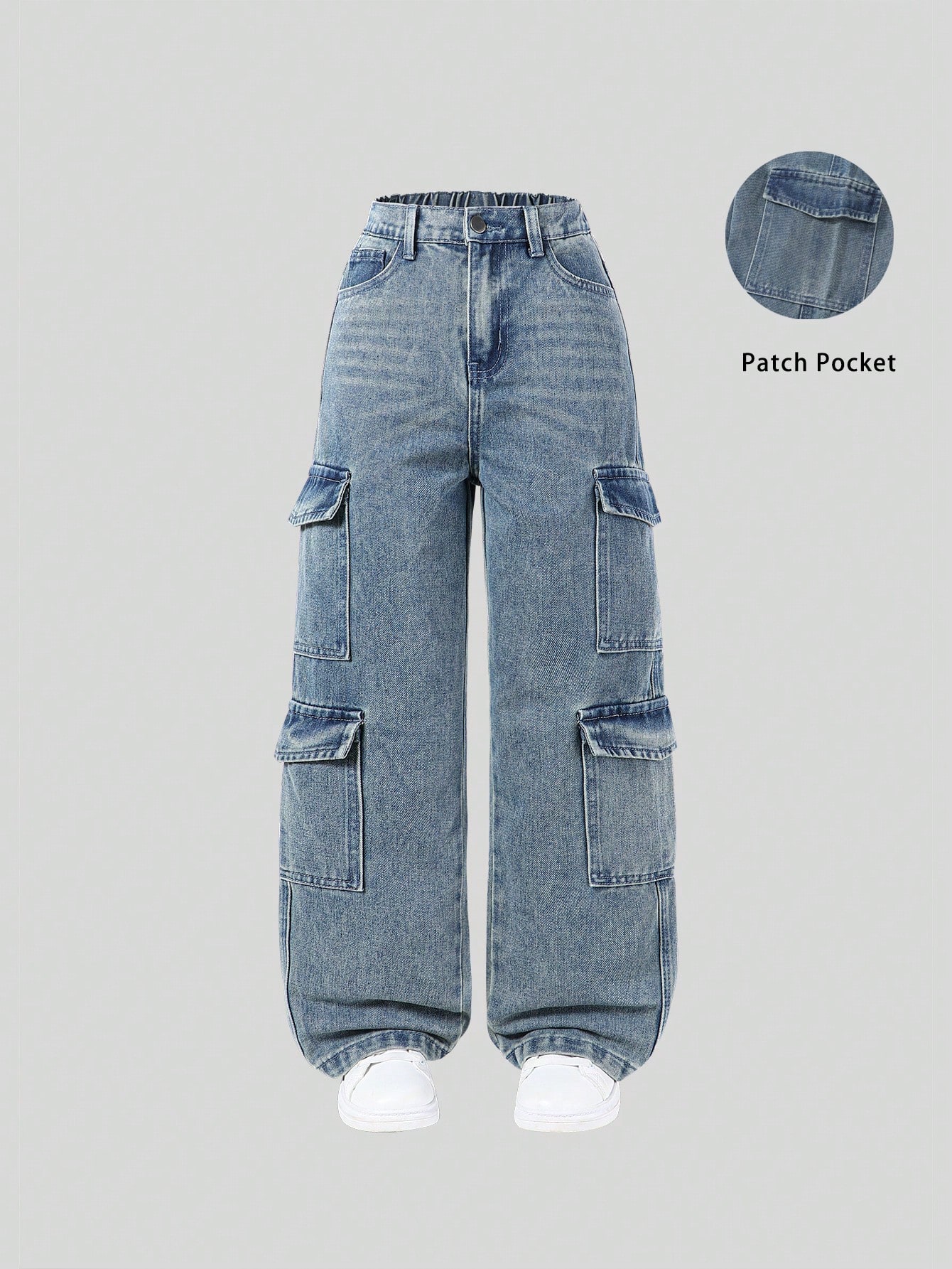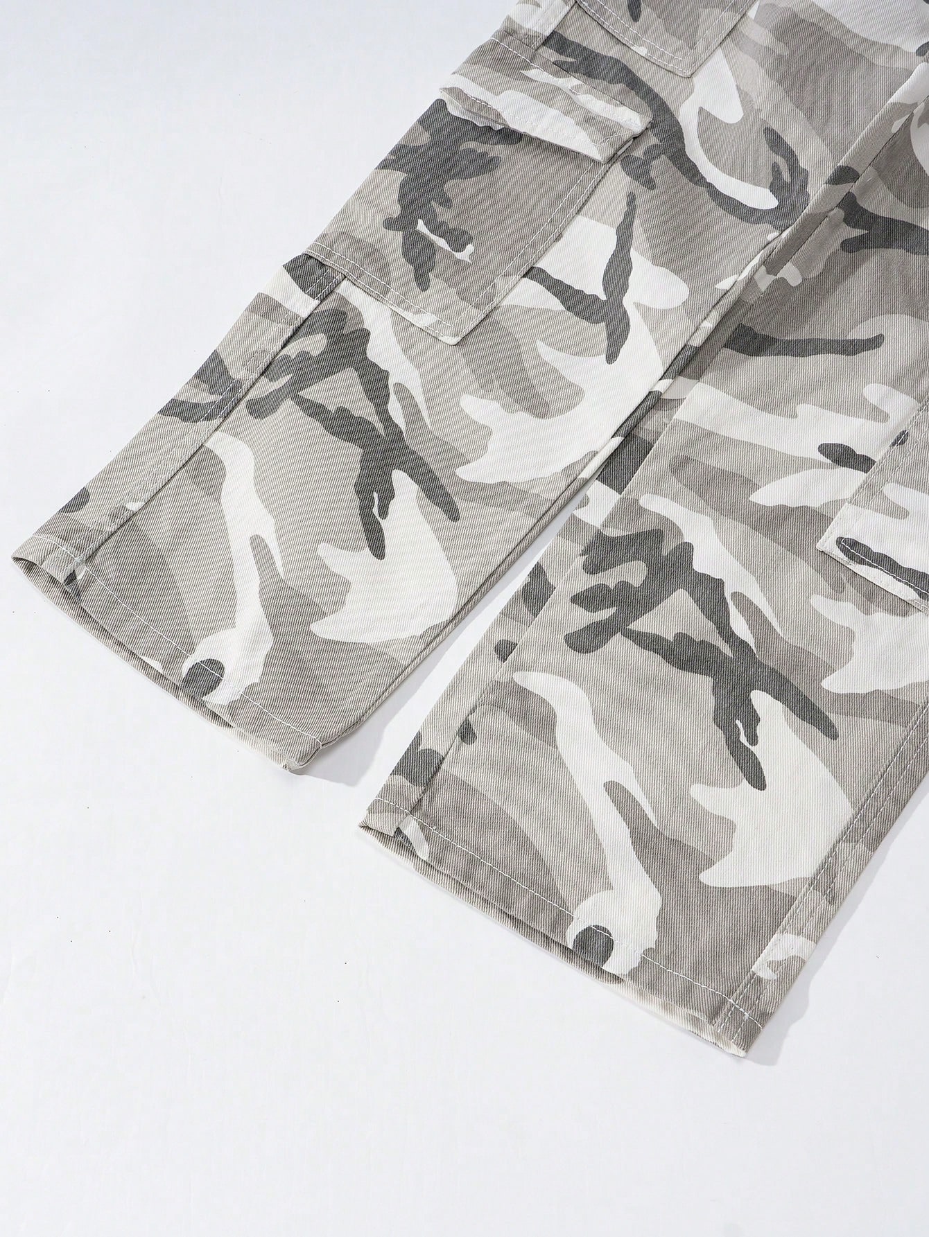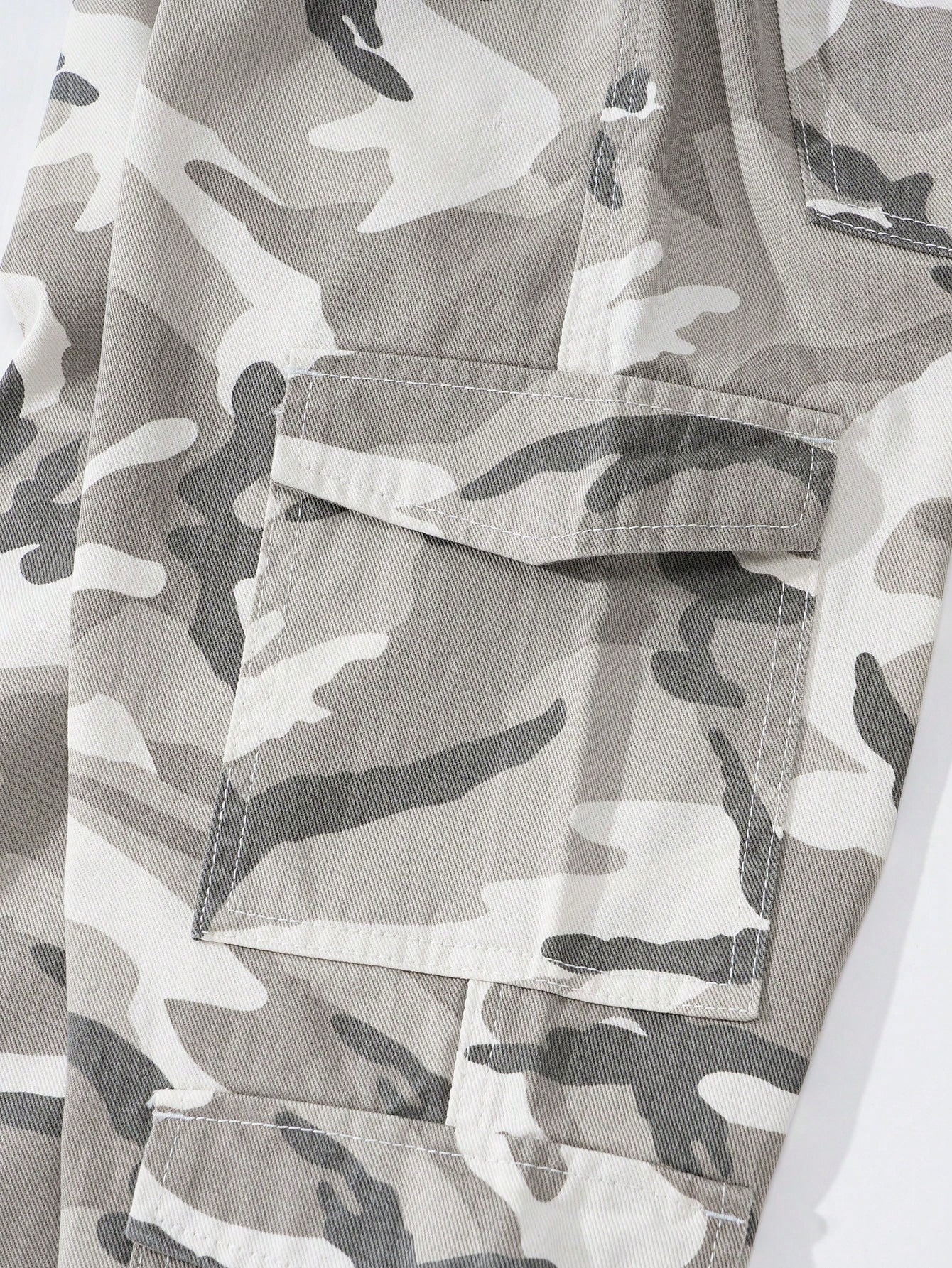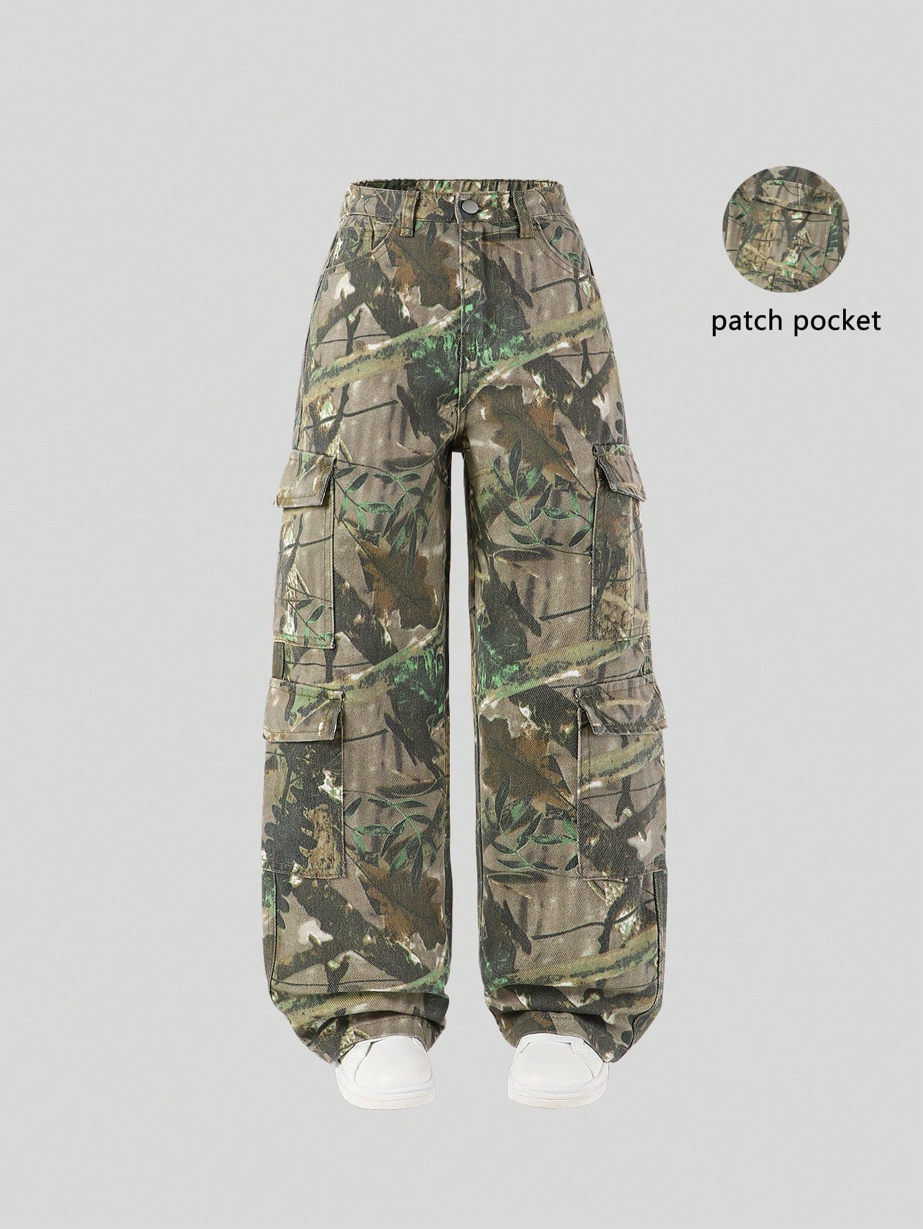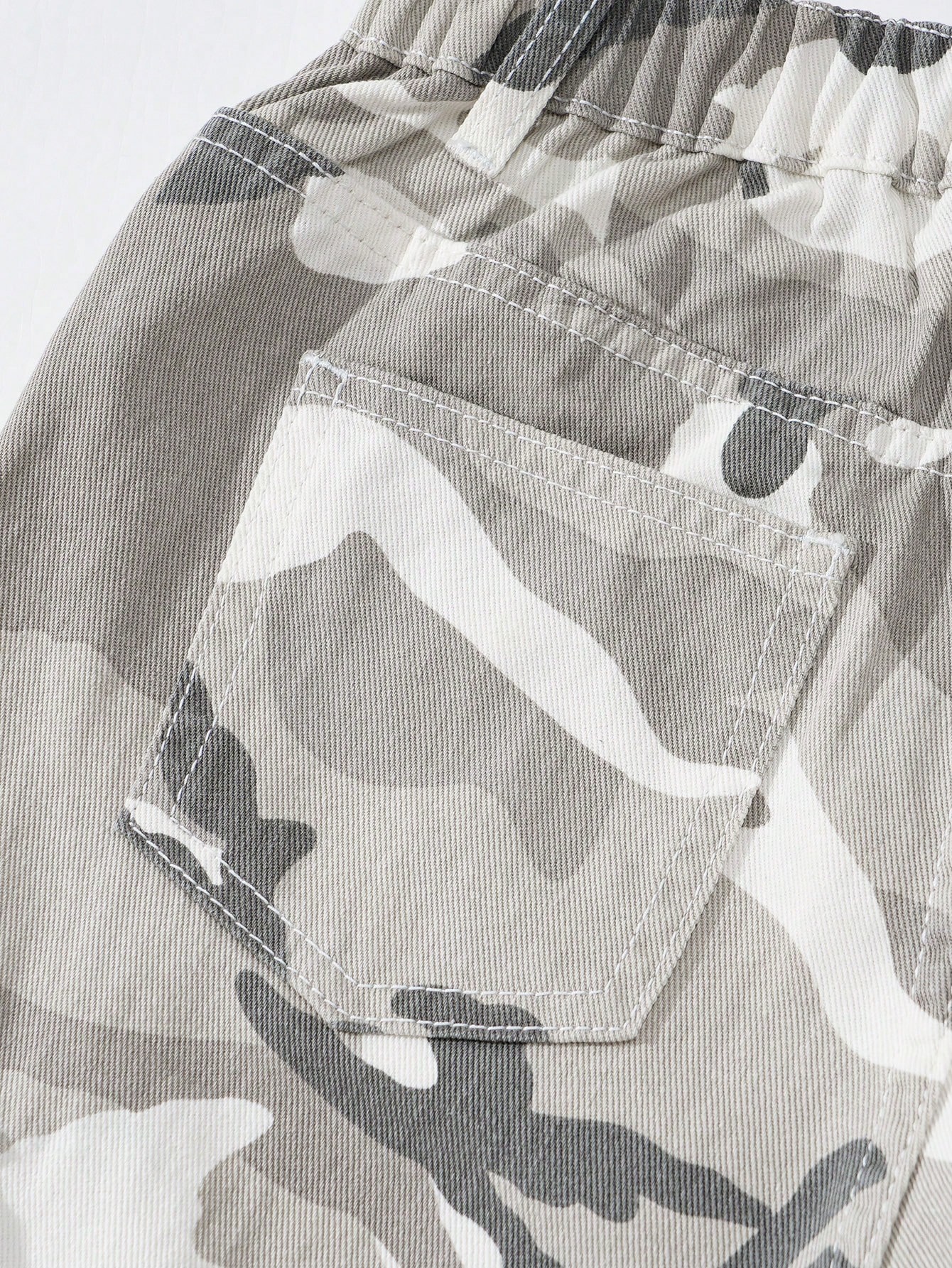 SHEIN Tween Girls Y2K Casual Multi Pocket Street Drawstring Waist Light Color Camouflage Print Cargo Jeans, School, Campus, College