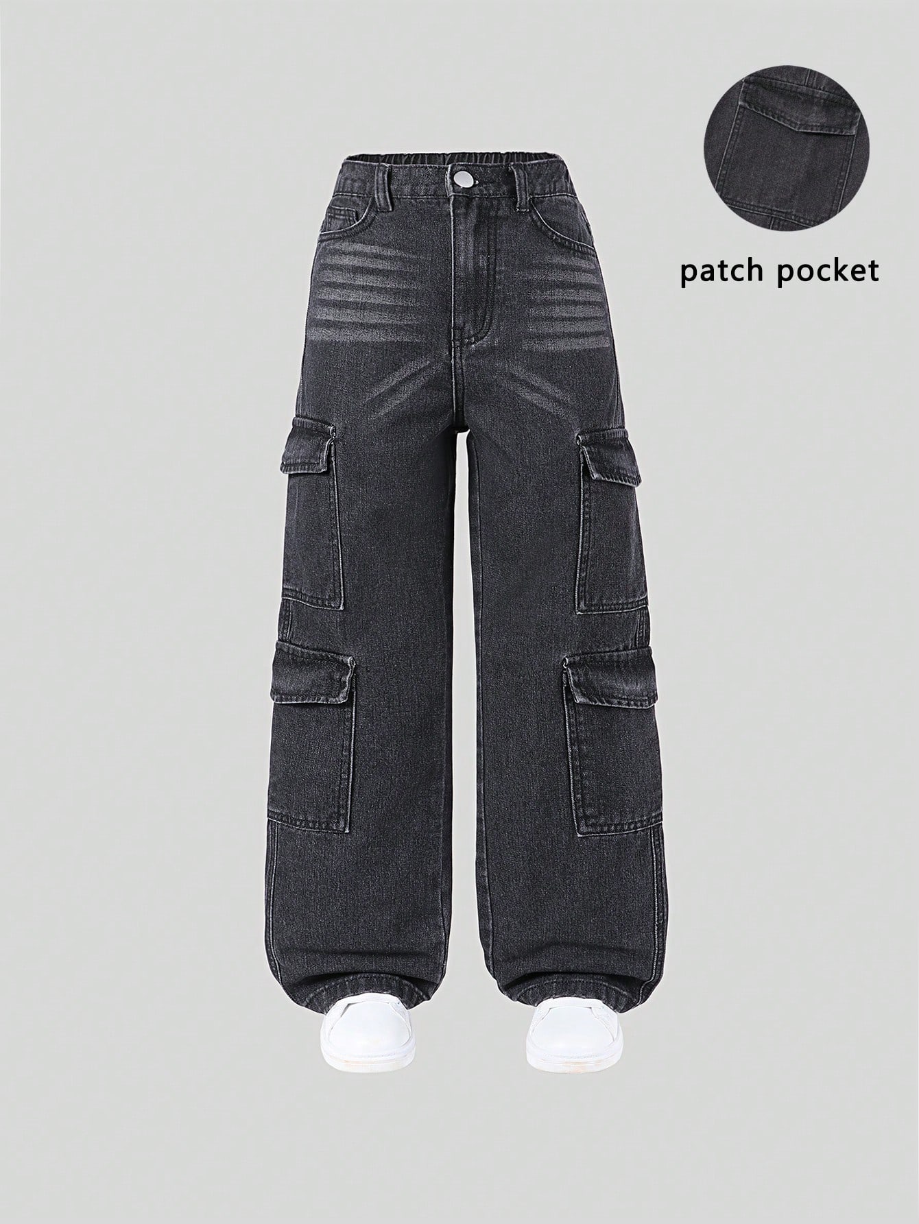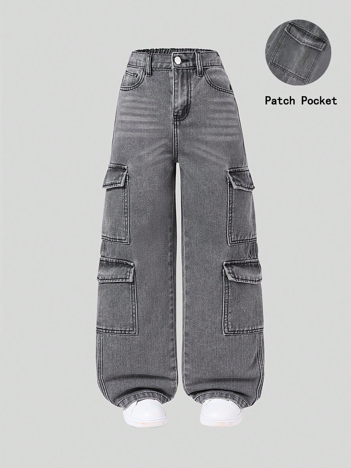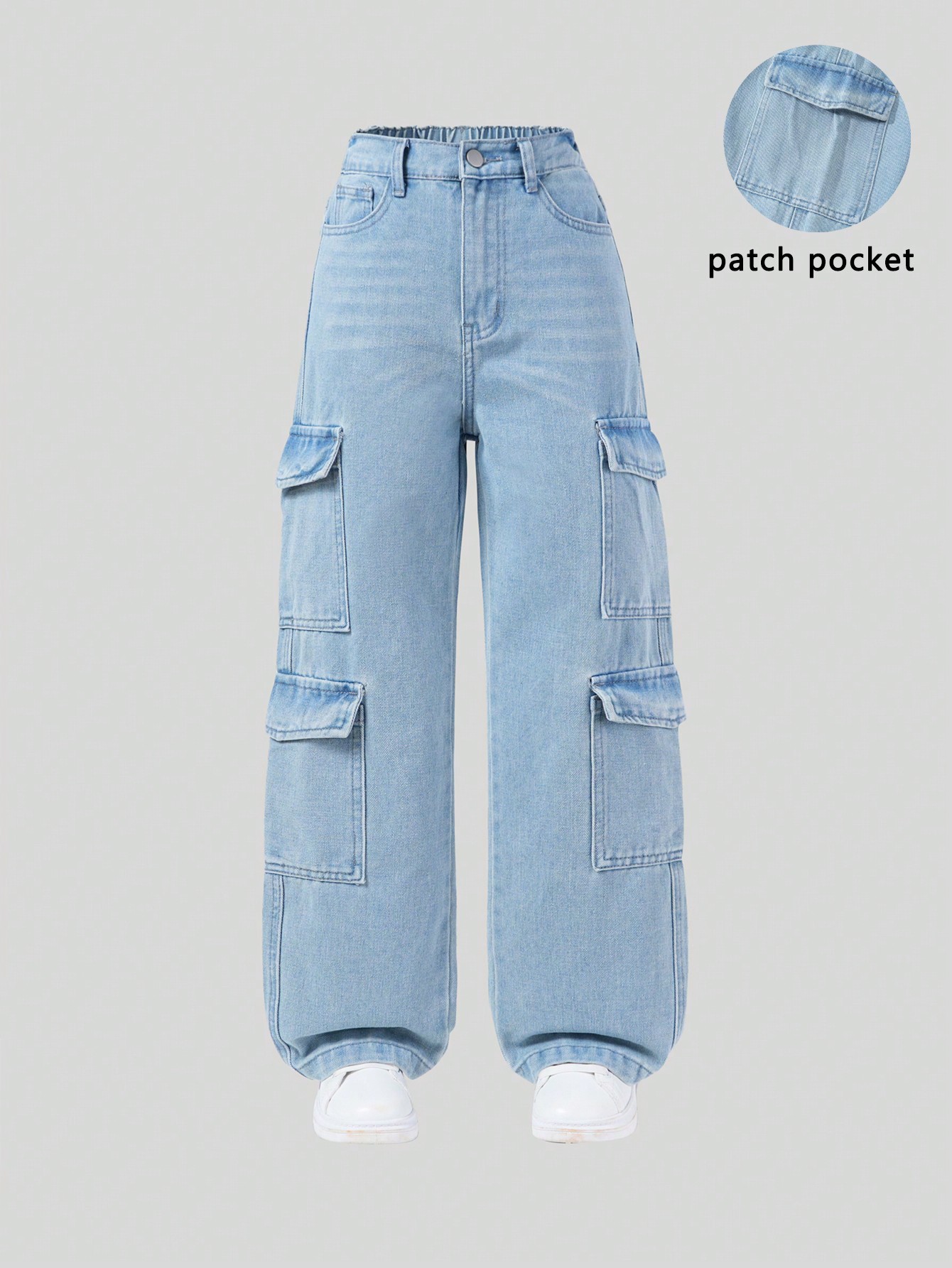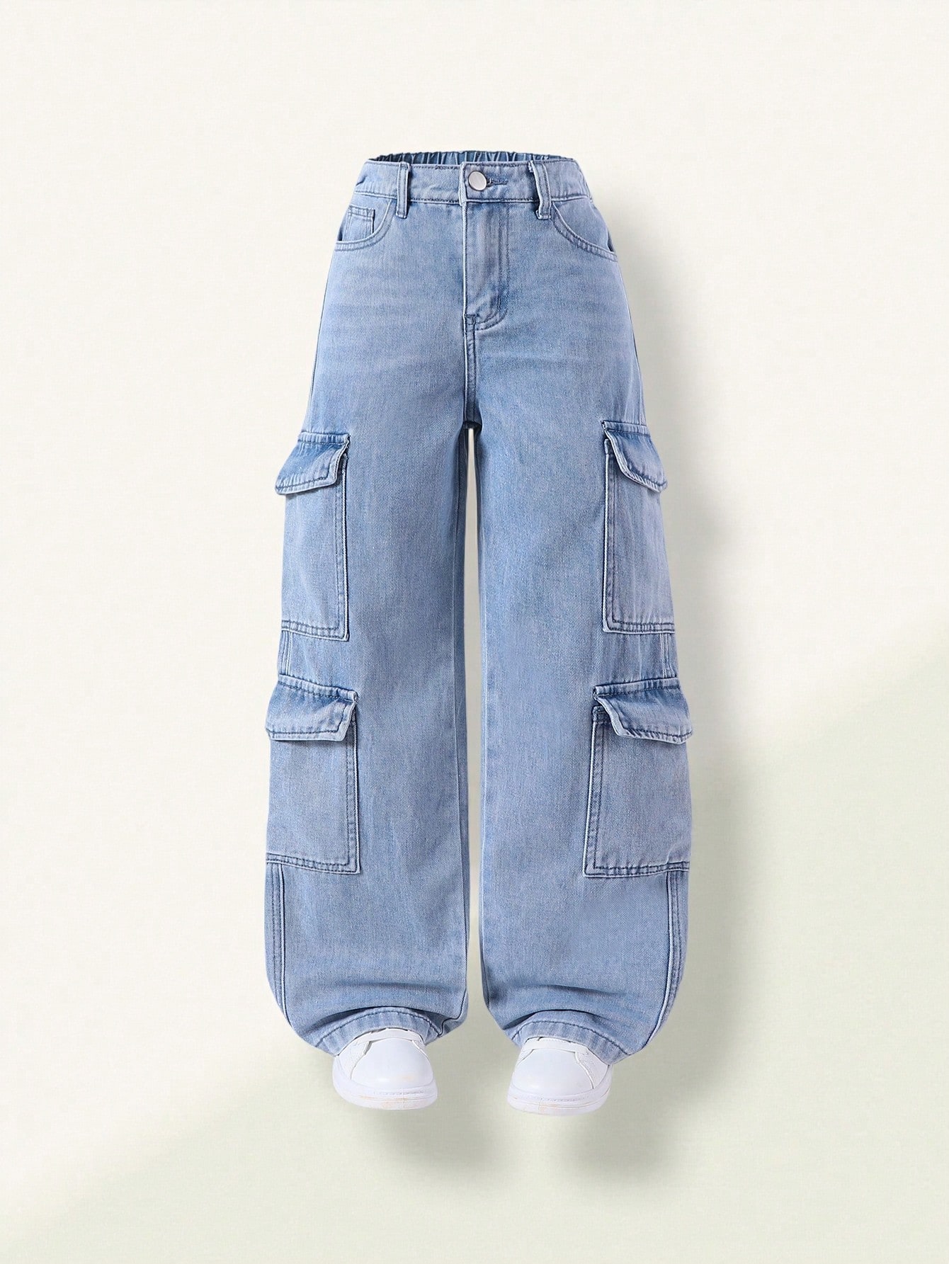 SHEIN Tween Girls Y2K Casual Multi Pocket Street Drawstring Waist Light Color Camouflage Print Cargo Jeans, School, Campus, College