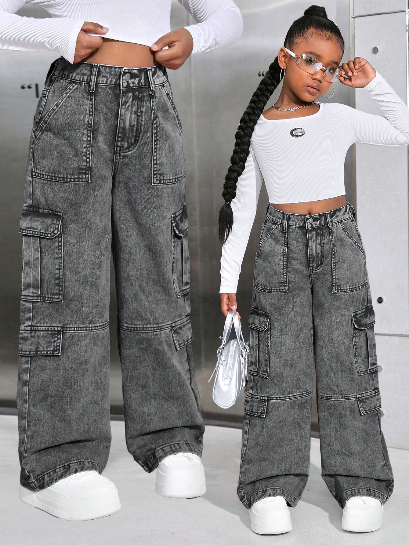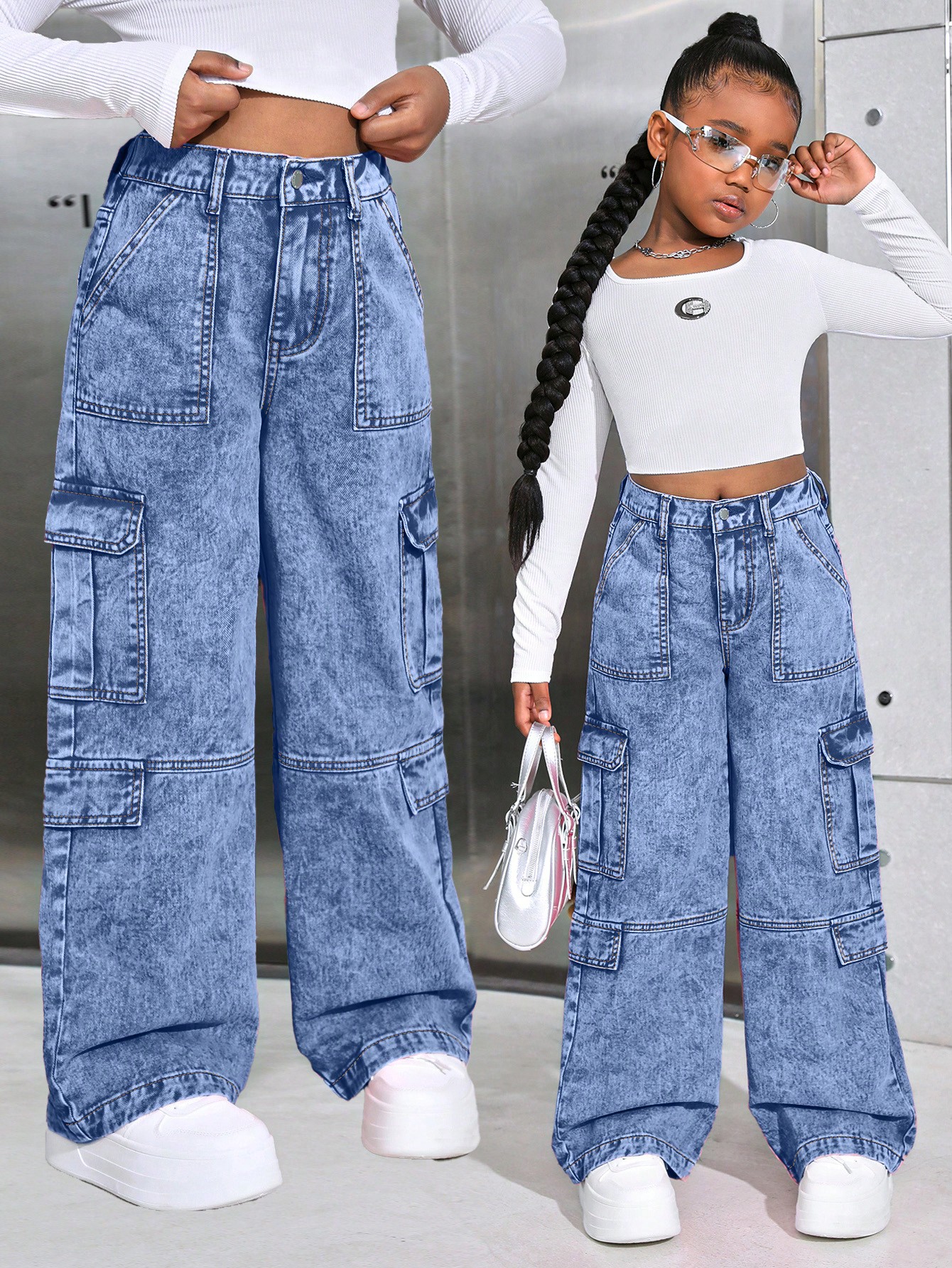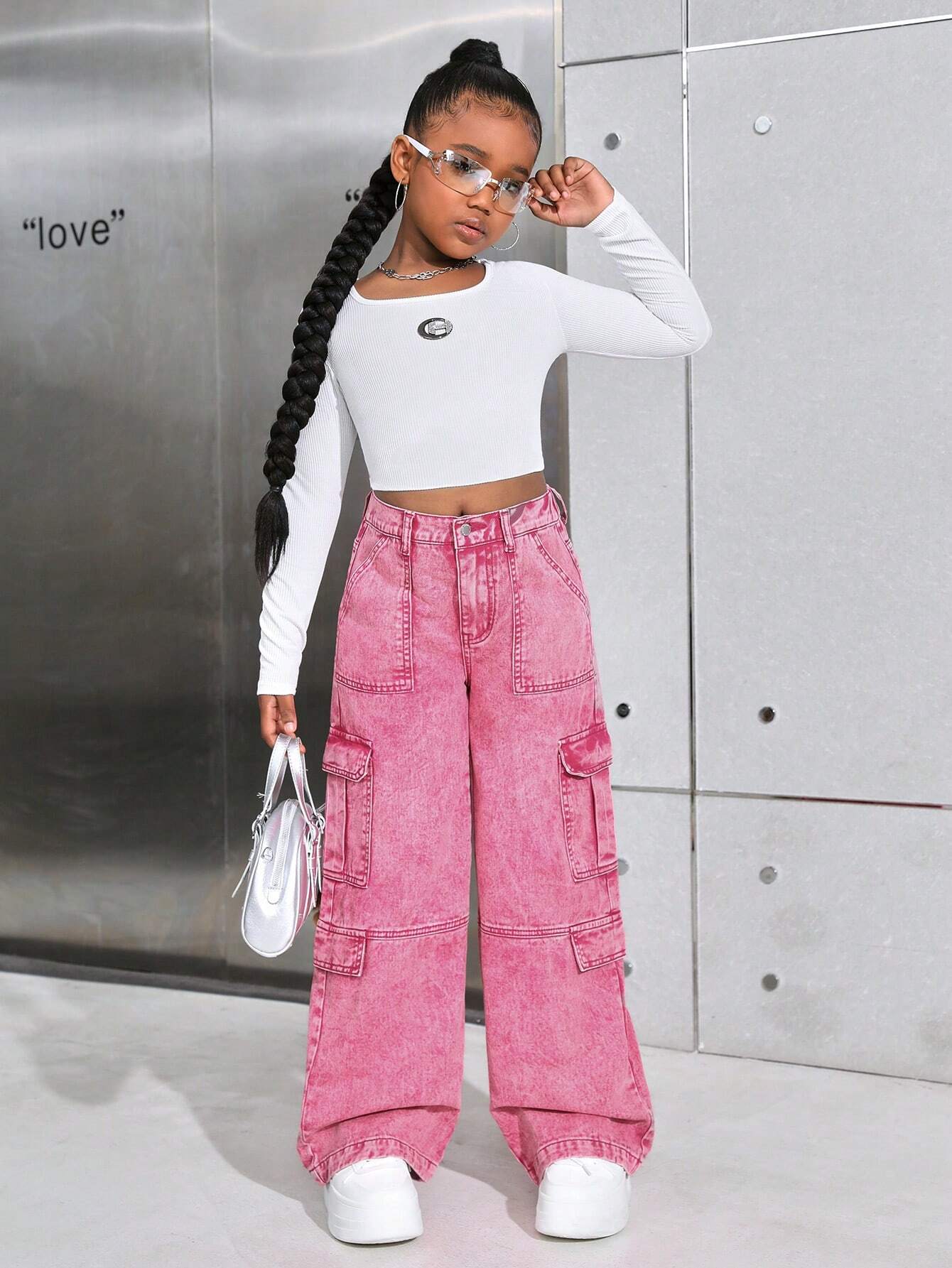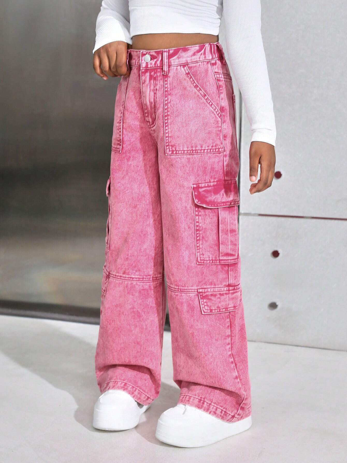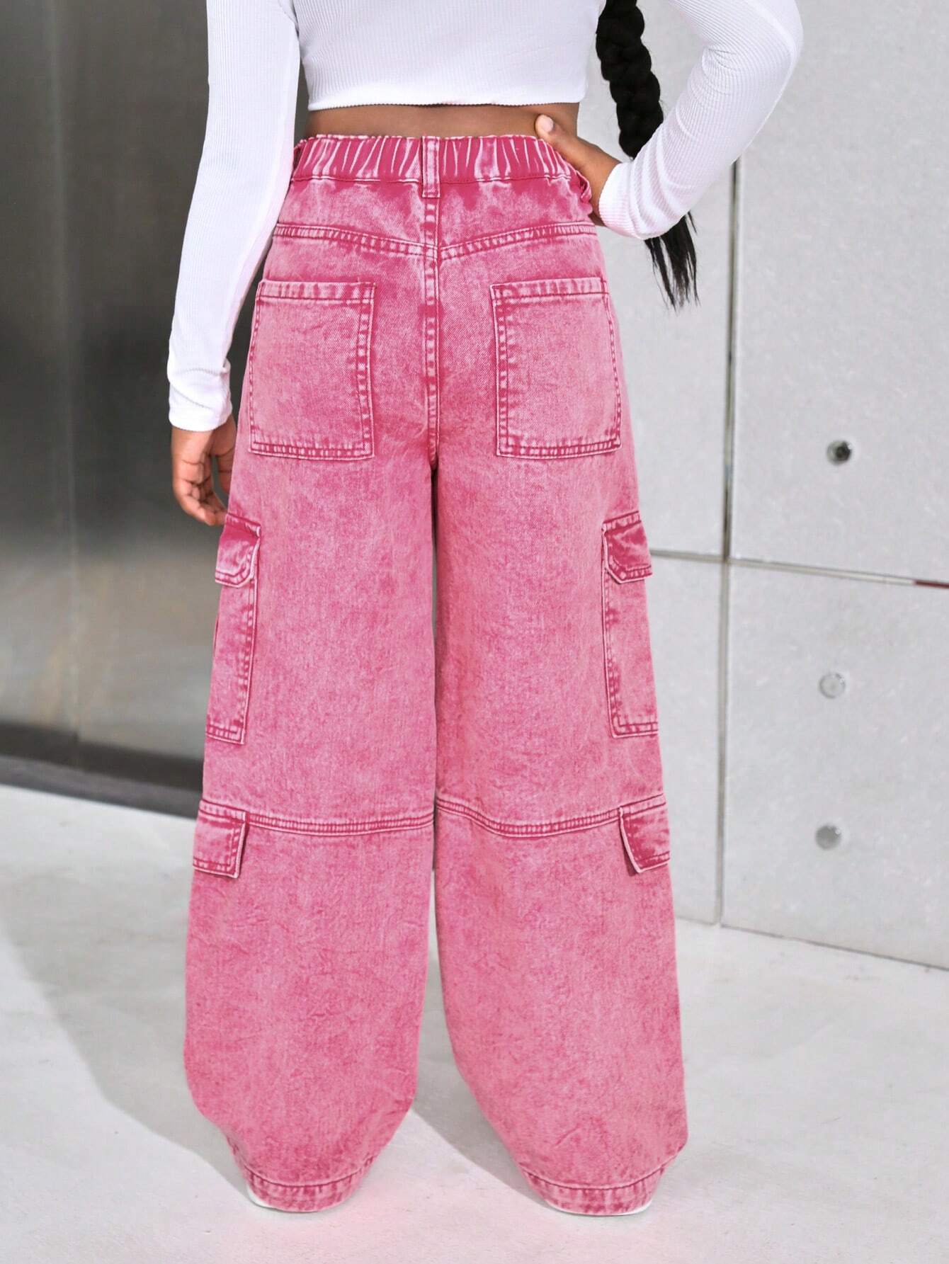 SHEIN Tween Girls Y2K Pink Stonewashed High Waist Flap Pocket Baggy Straight Leg Cargo Jeans