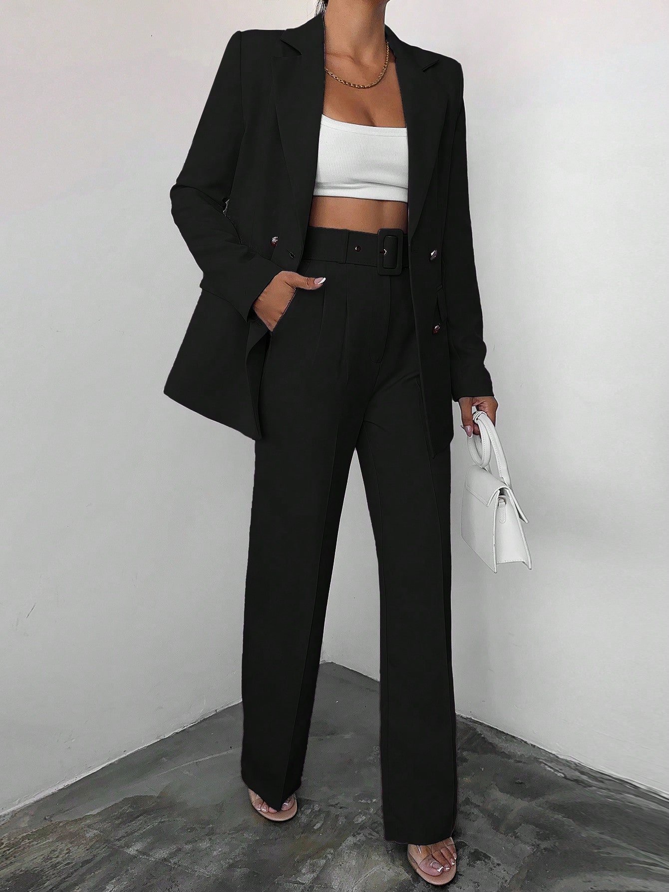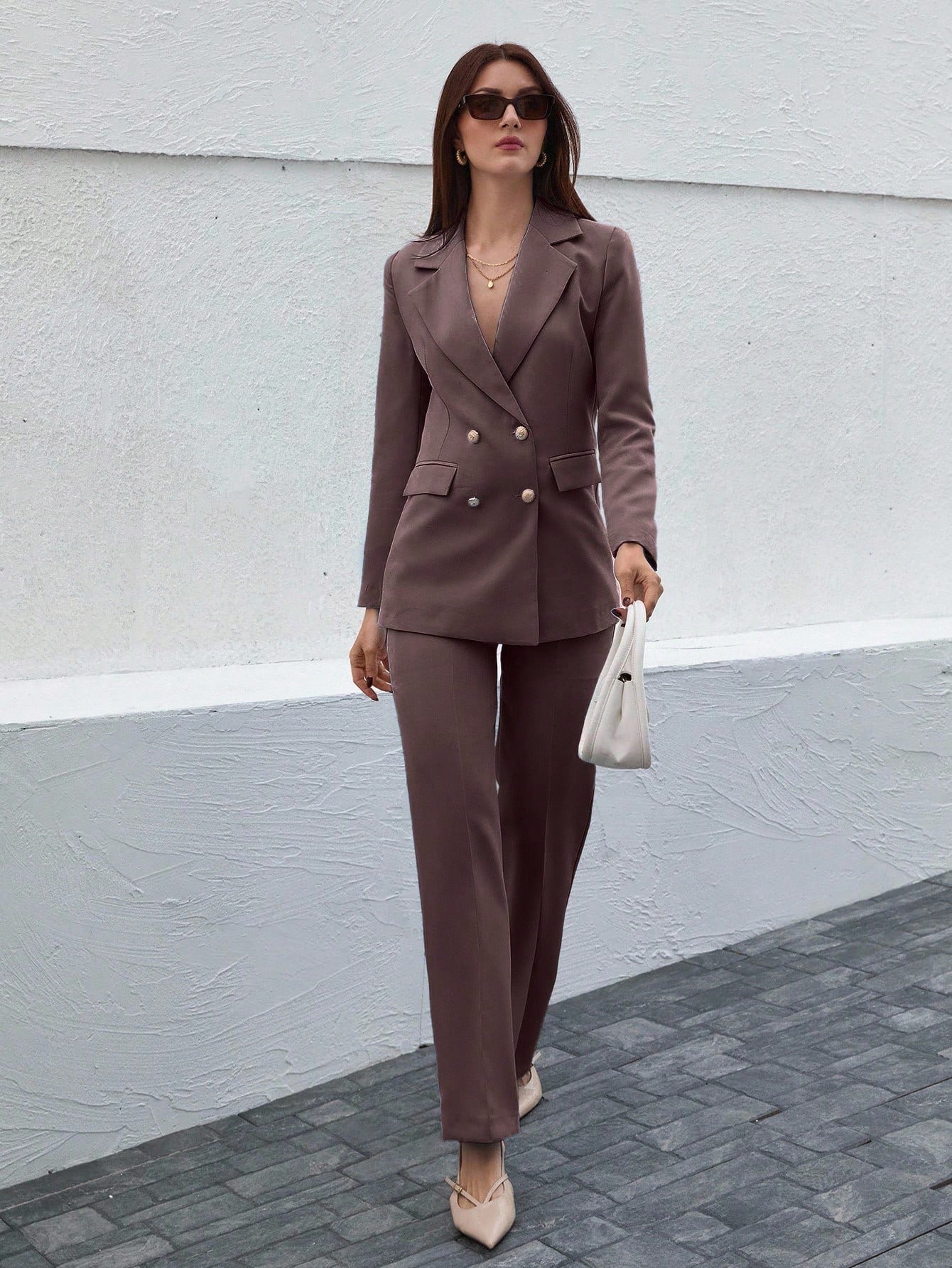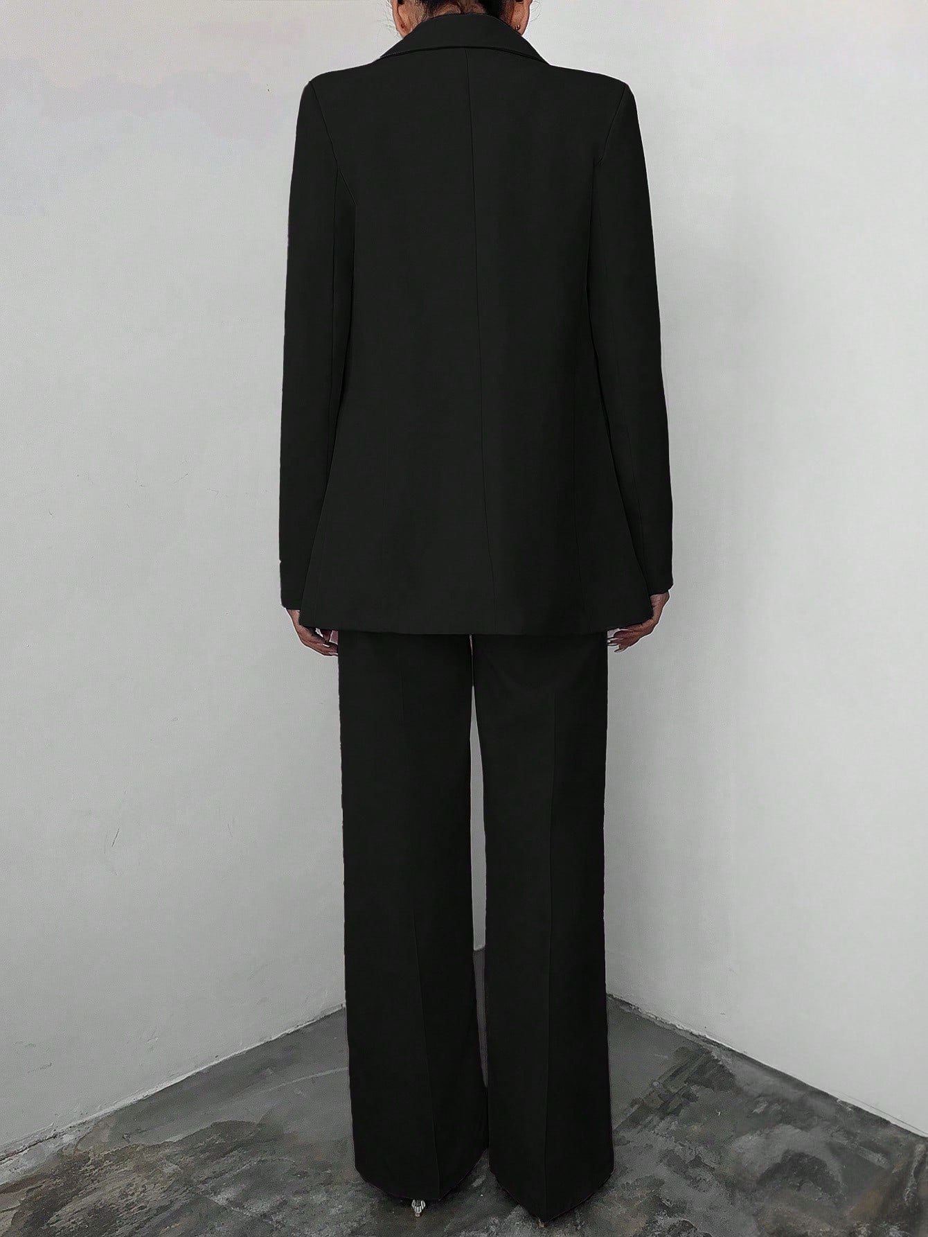 SHEIN Women's Solid Color Lapel NeckLong Sleeve Jacket And Flared Pants Elegant Suit Set