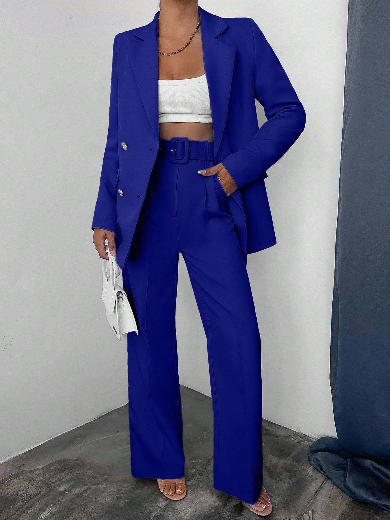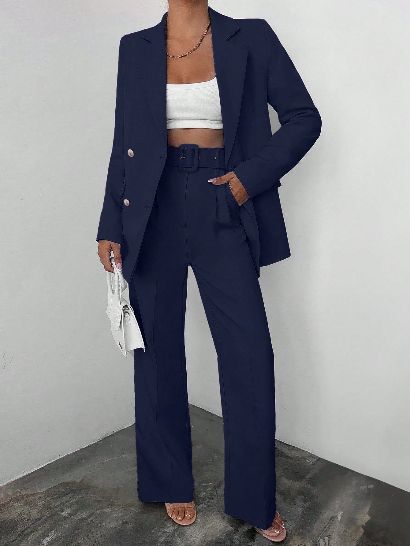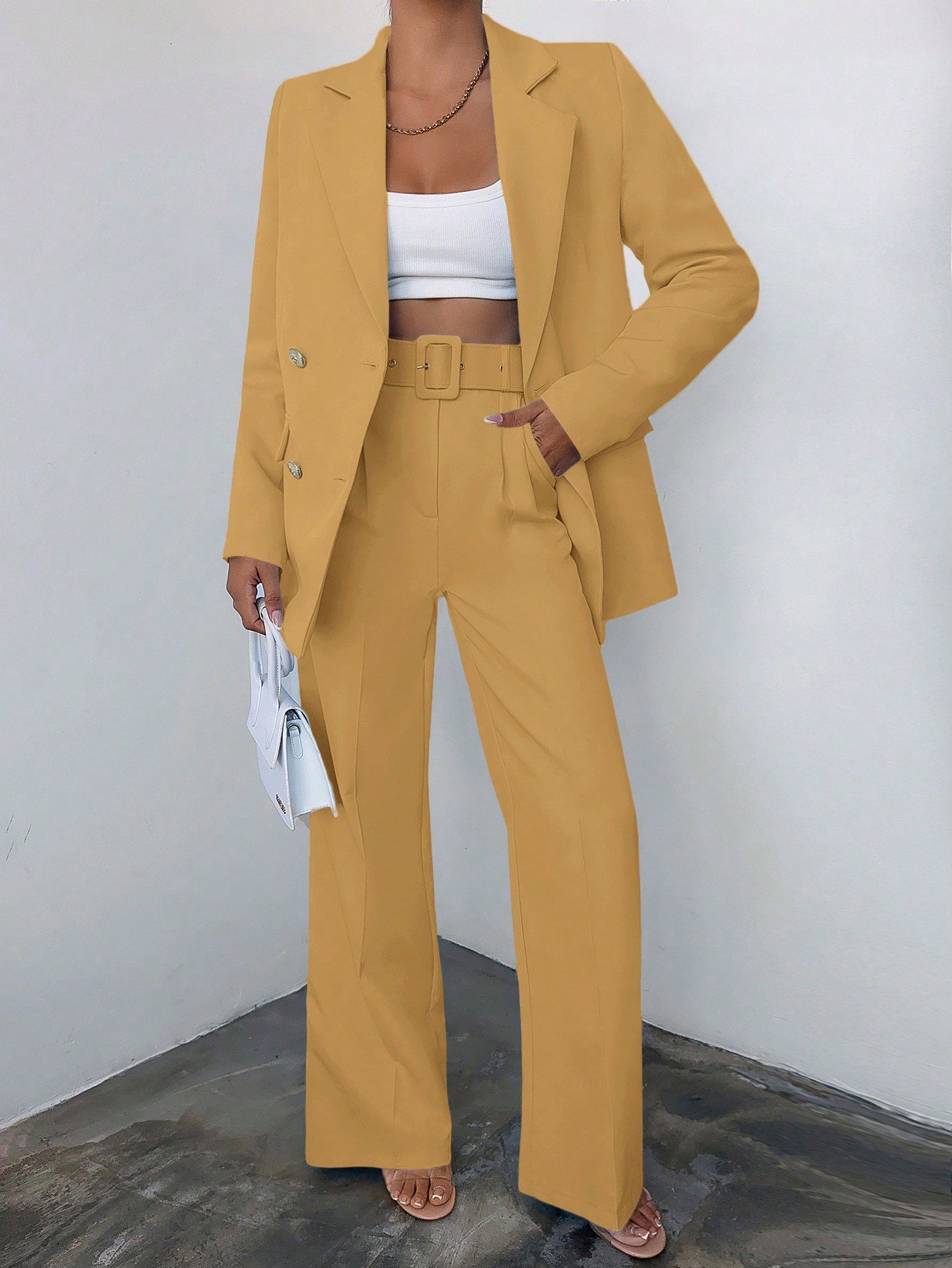 SHEIN Women's Solid Color Lapel NeckLong Sleeve Jacket And Flared Pants Elegant Suit Set