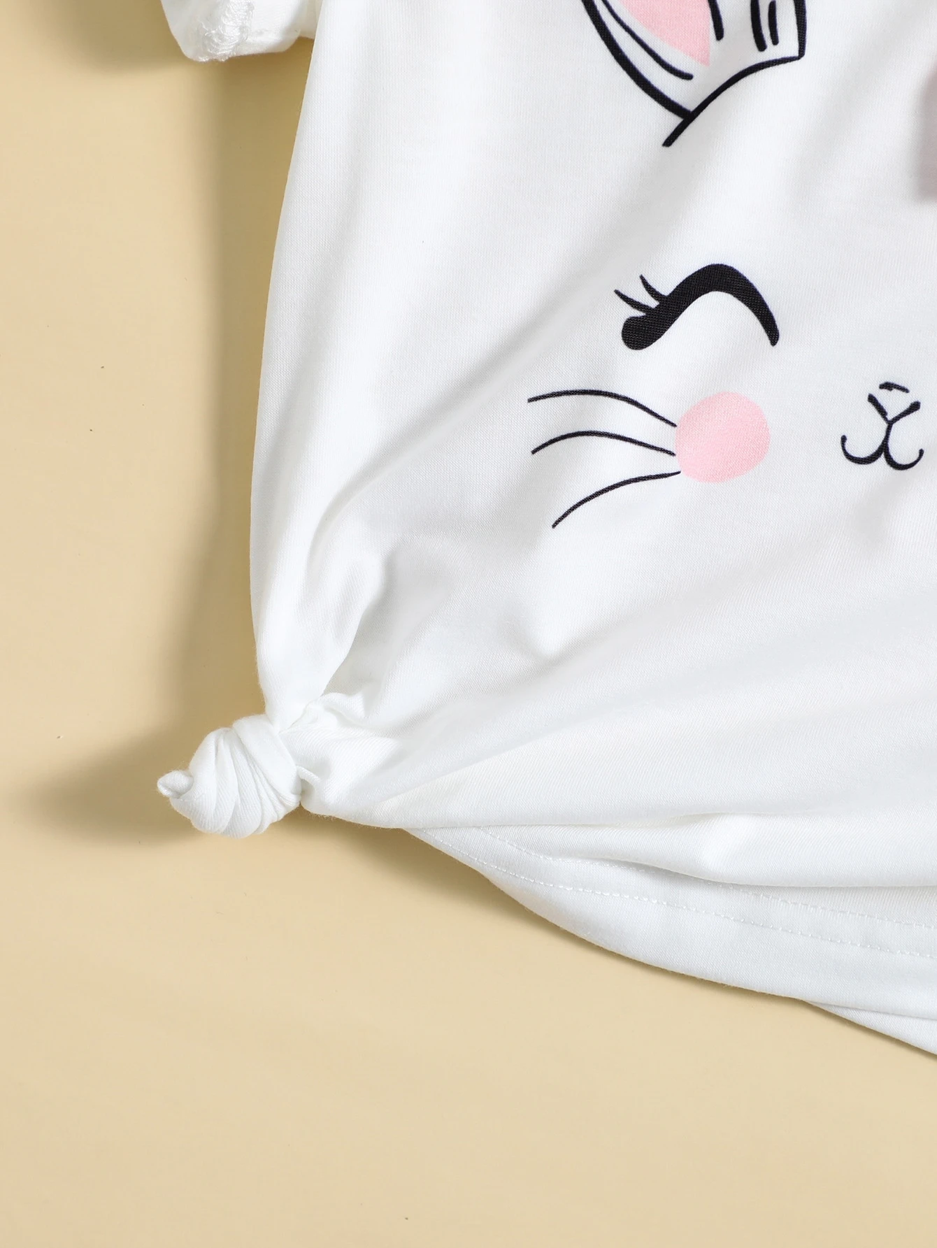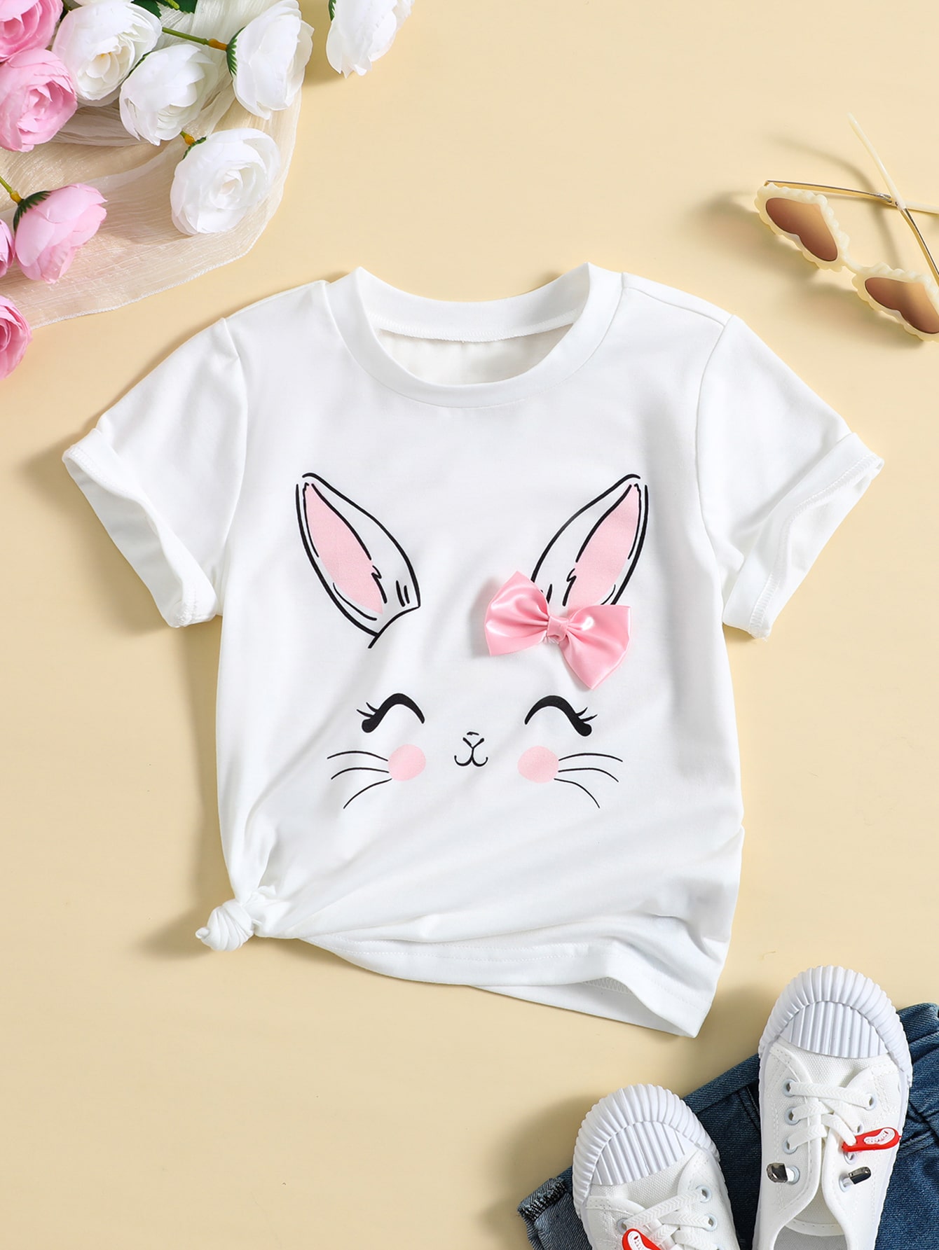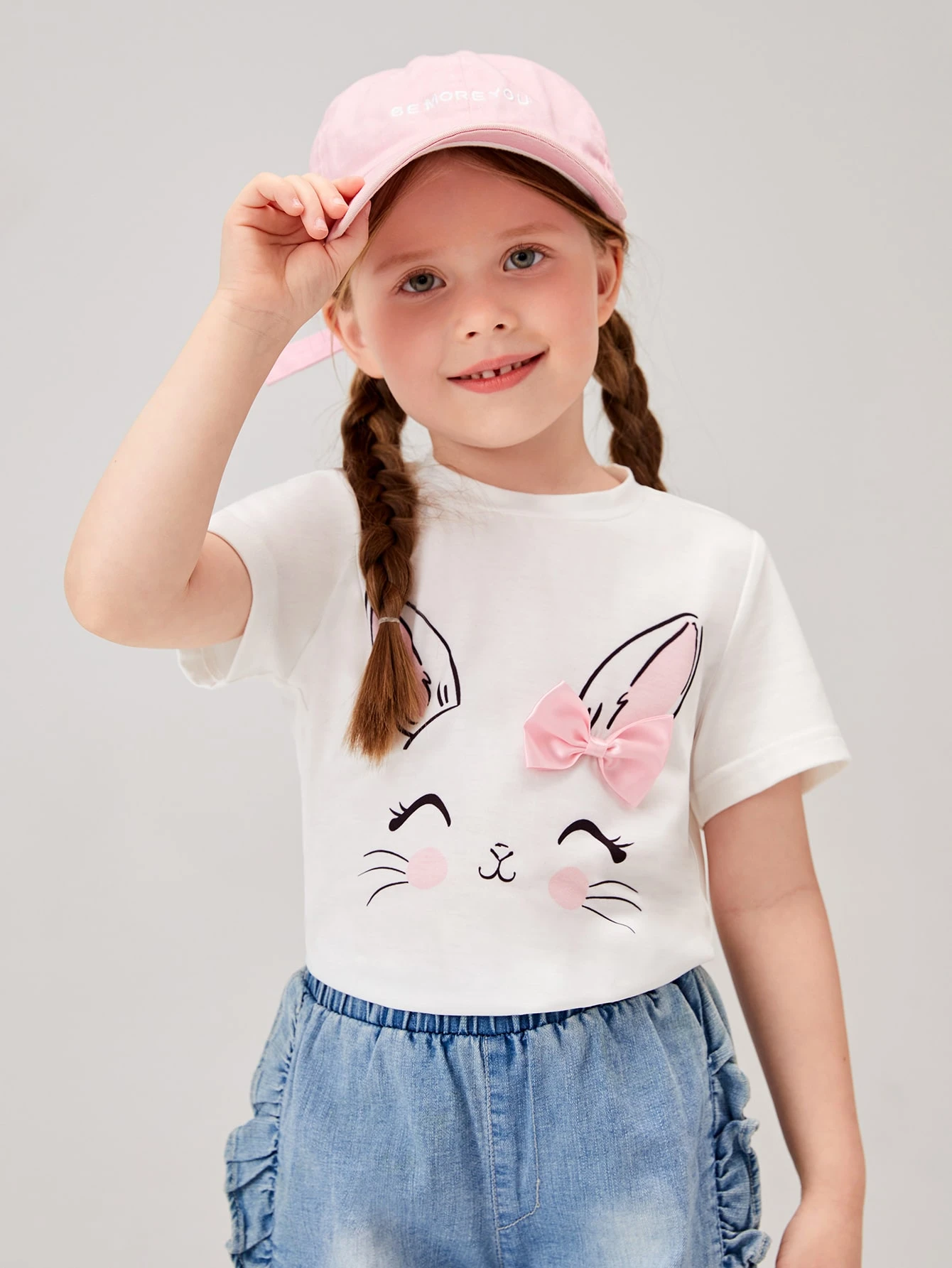 SHEIN Young Girl White Cute Cartoon Rabbit Printed T-Shirt For Summer With Round Neck And Short Sleeves,Holiday,Summer,Travel