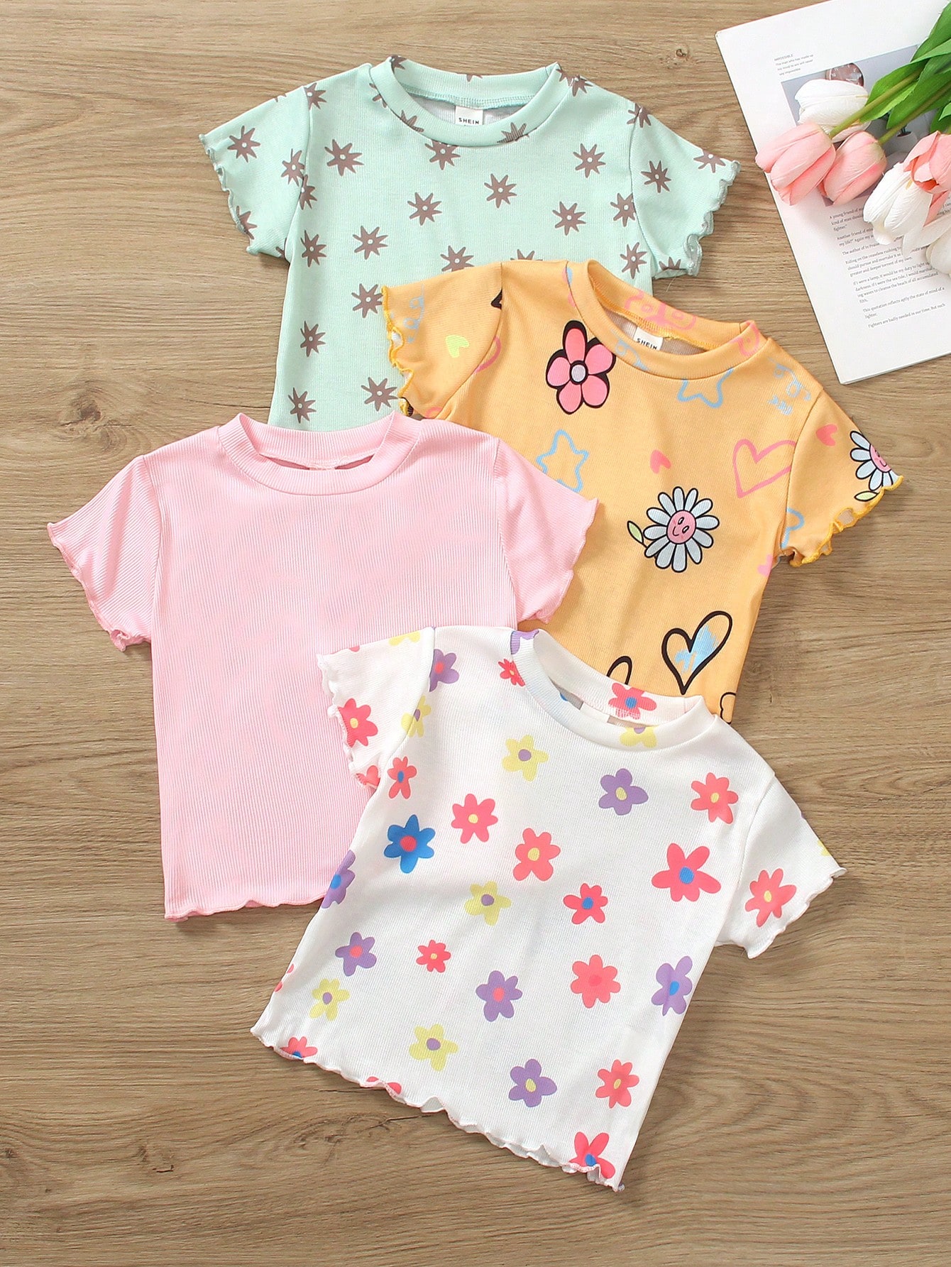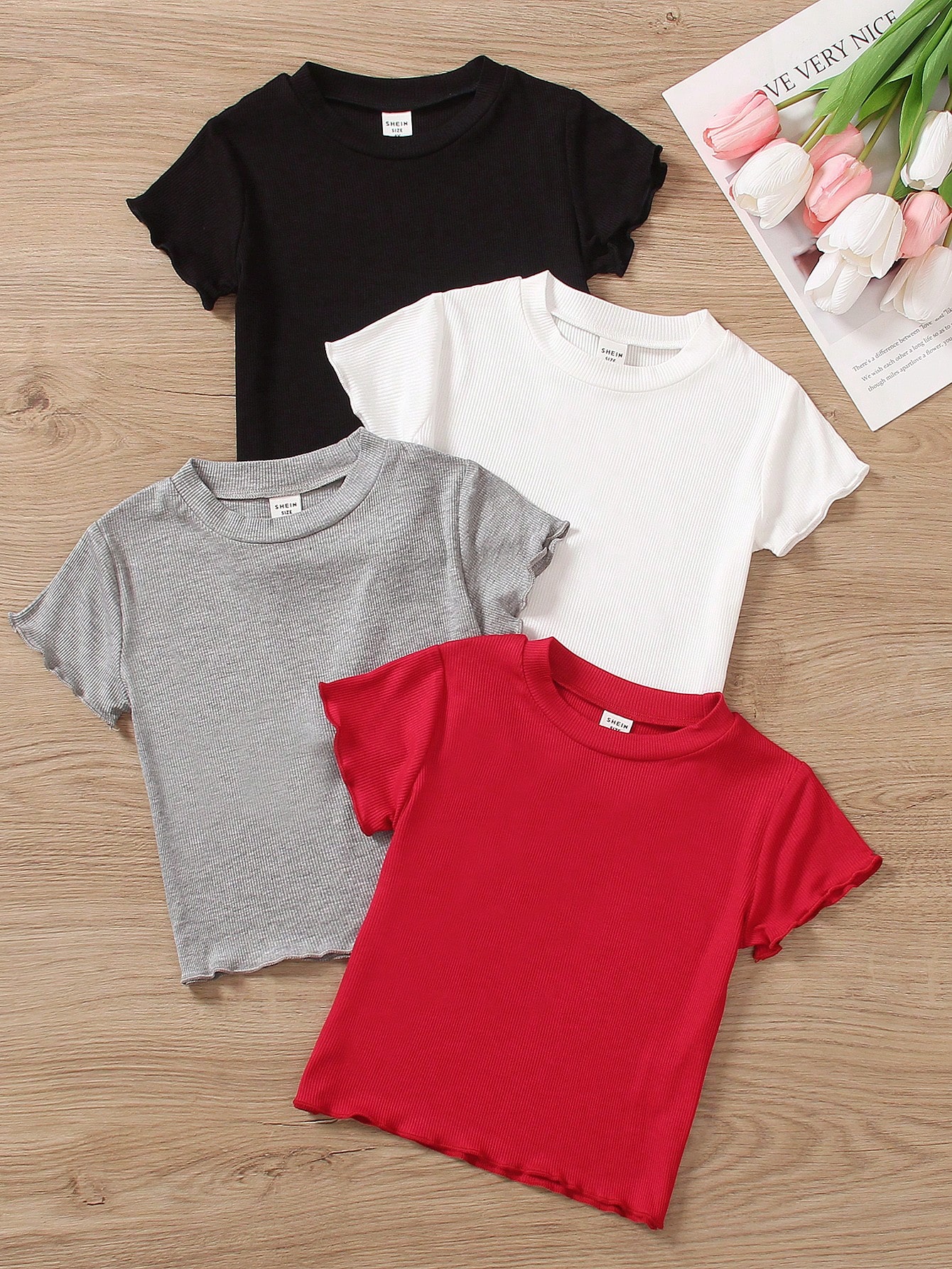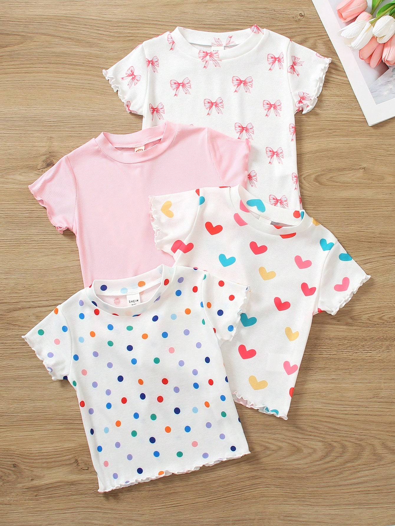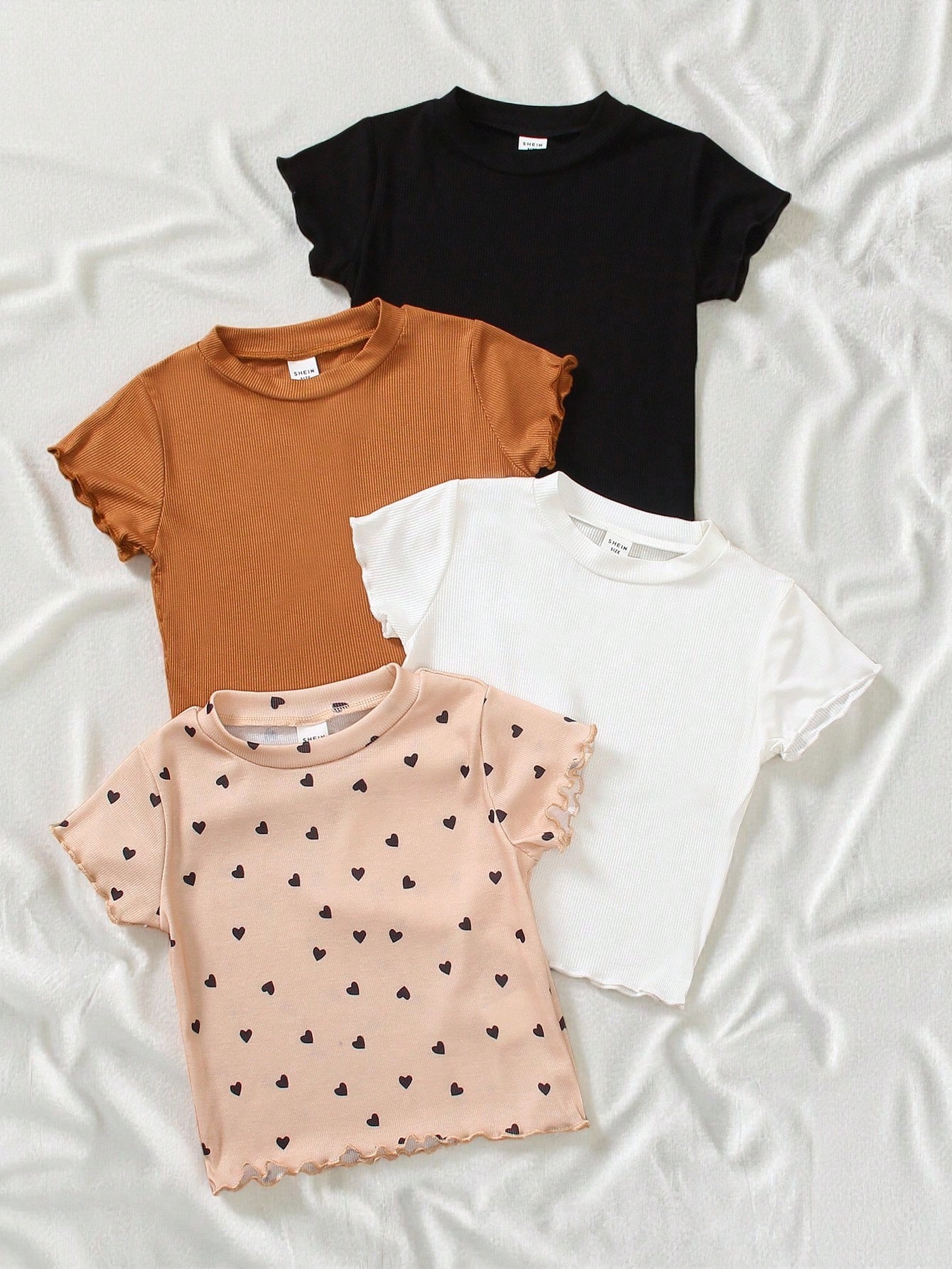 SHEIN Young Girls 4pcs Solid & Heart Print Lettuce Trim Tee For Summer Summer Holiday