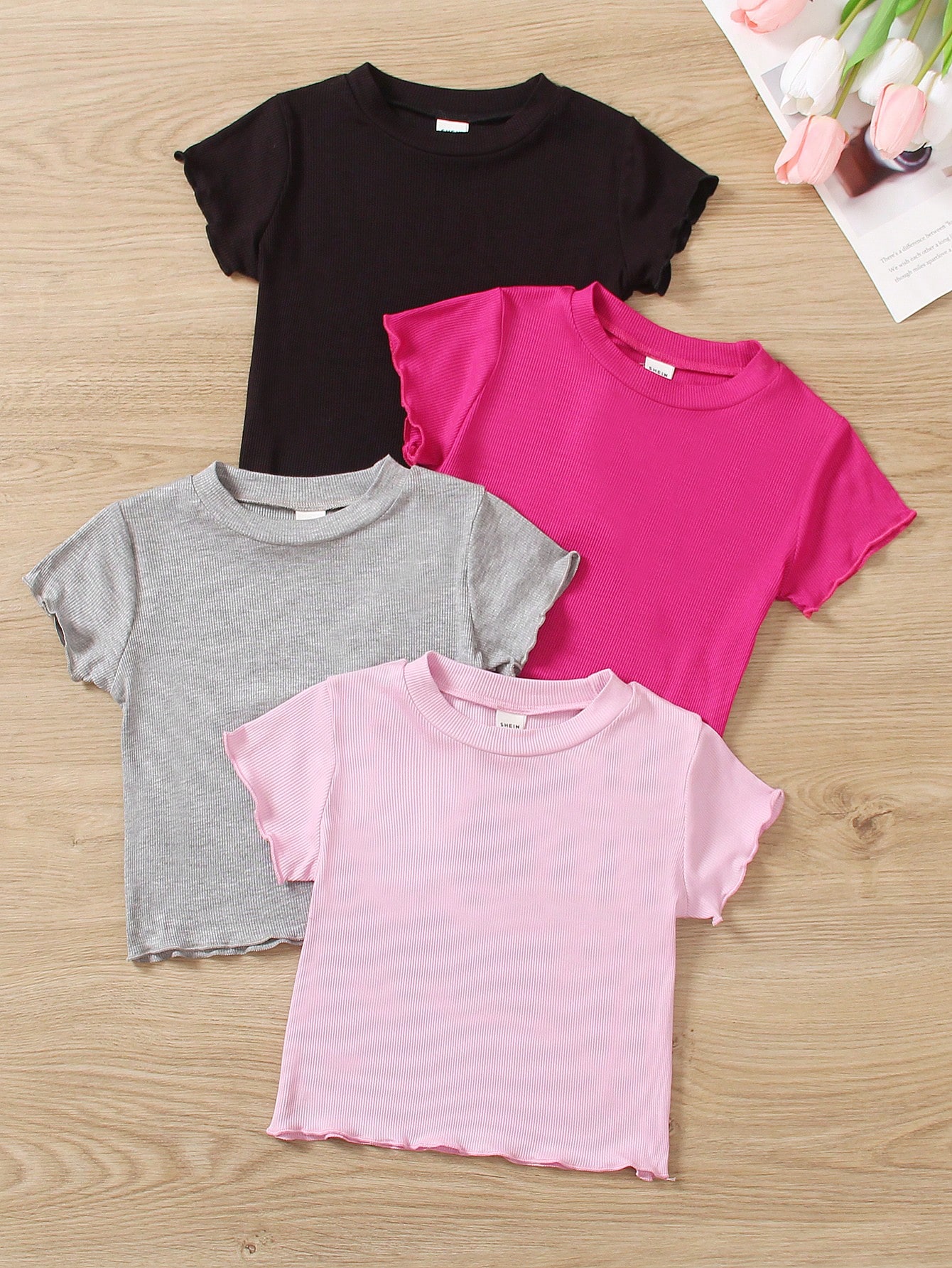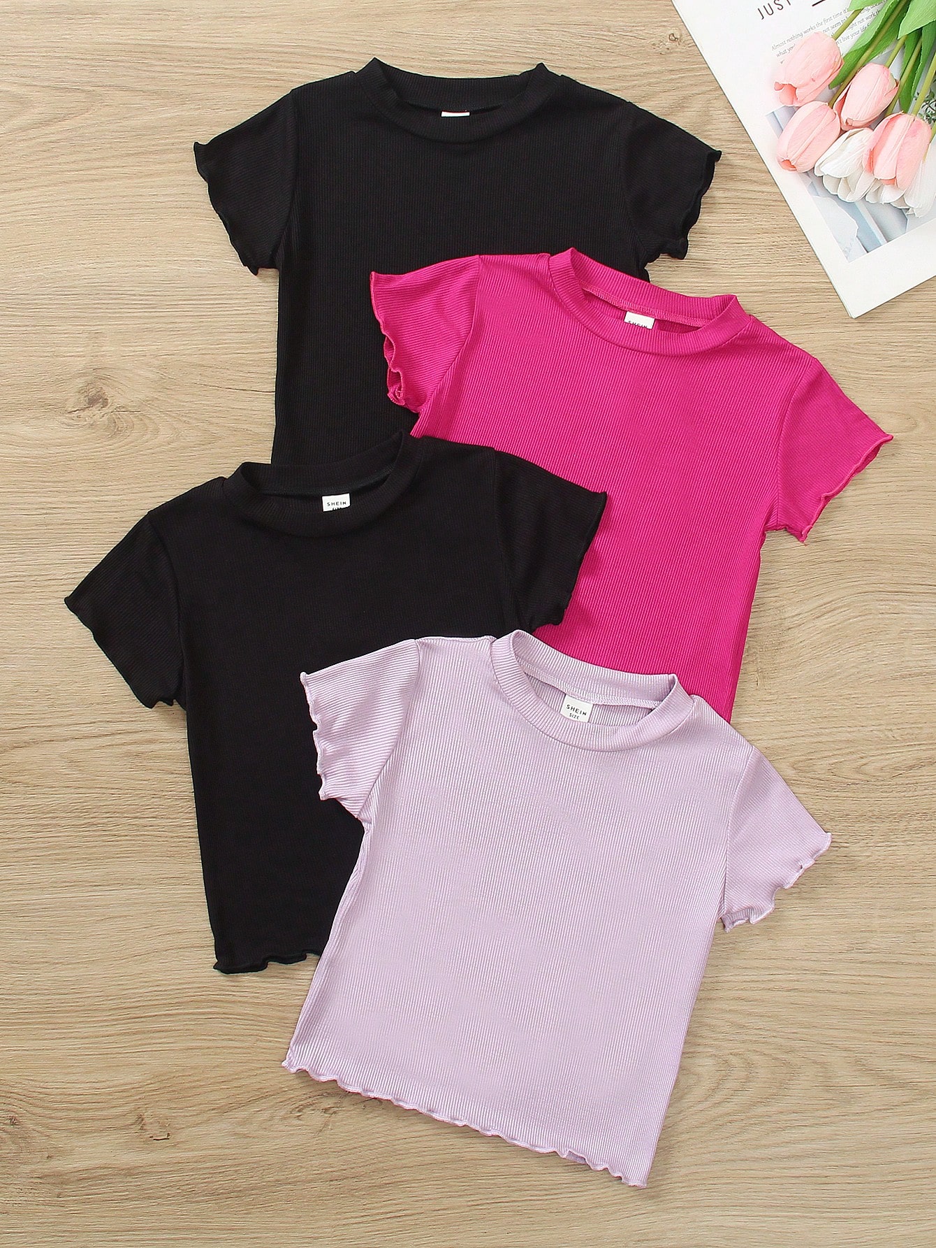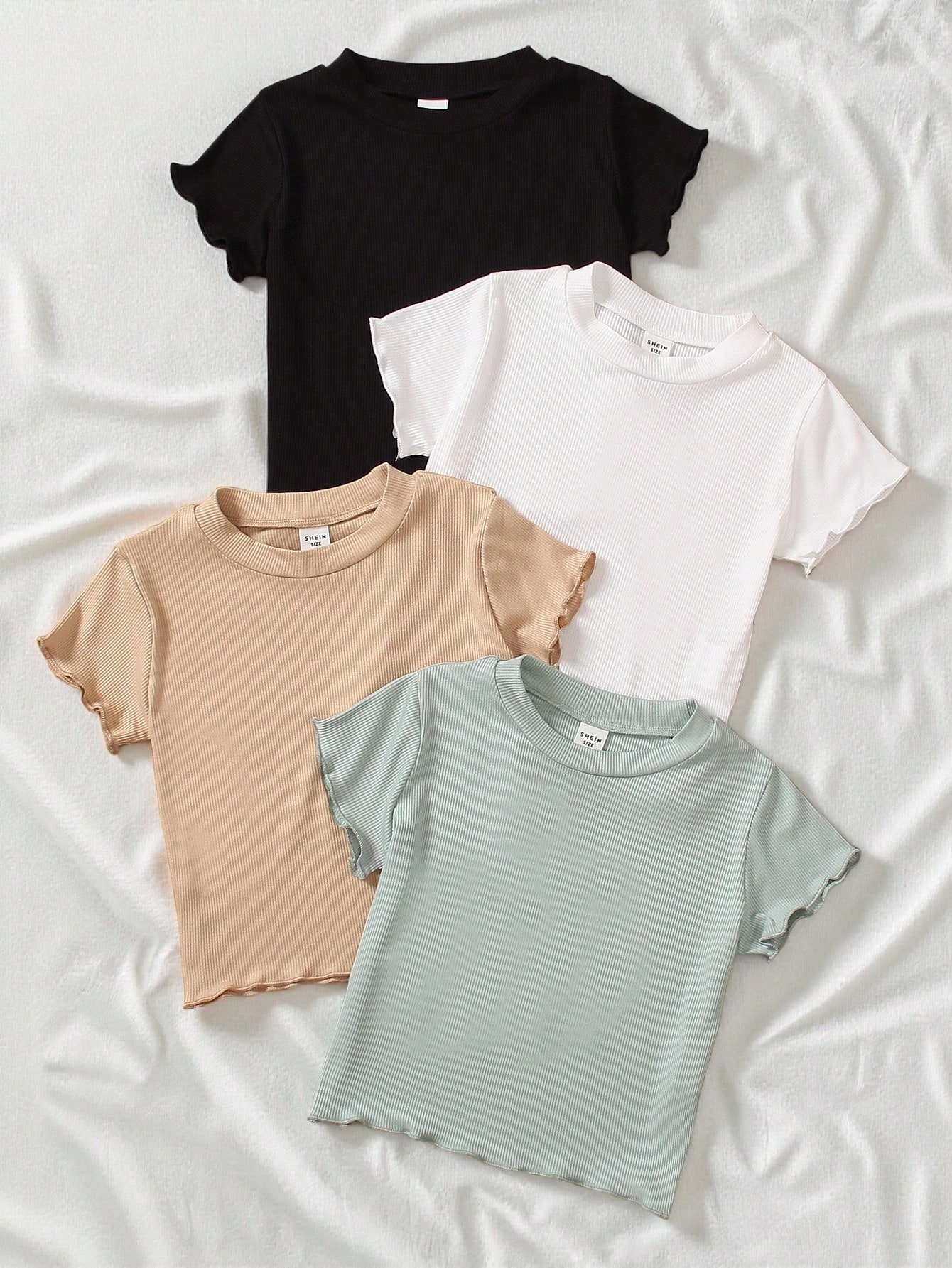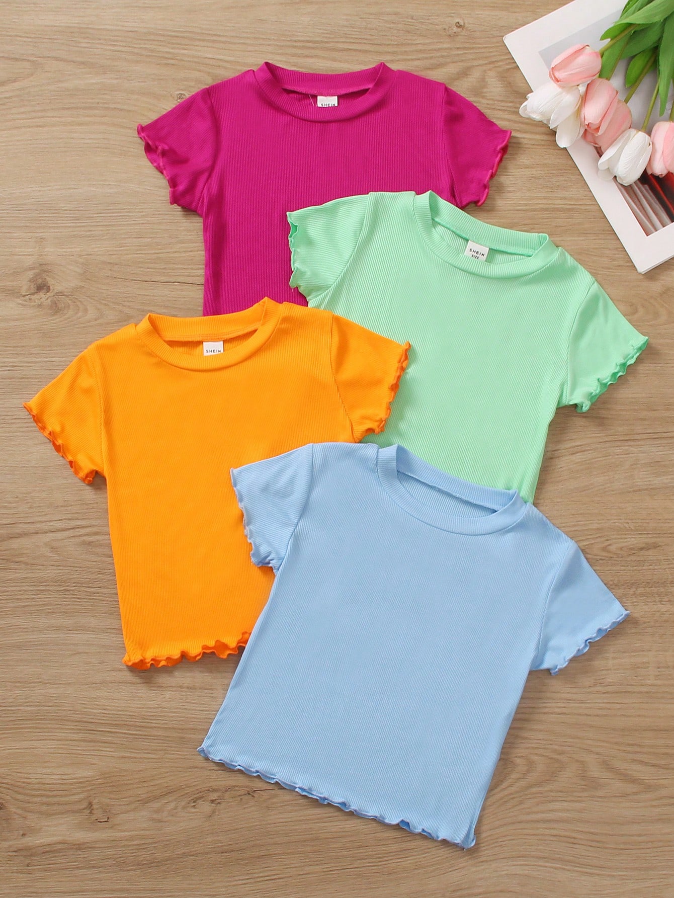 SHEIN Young Girls 4pcs Solid & Heart Print Lettuce Trim Tee For Summer Summer Holiday
