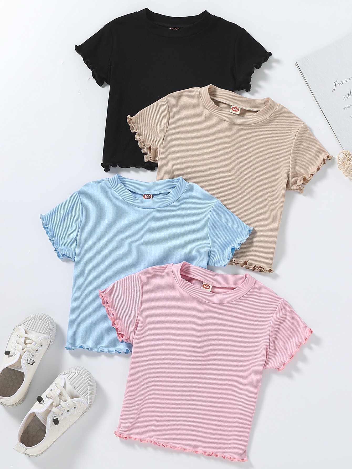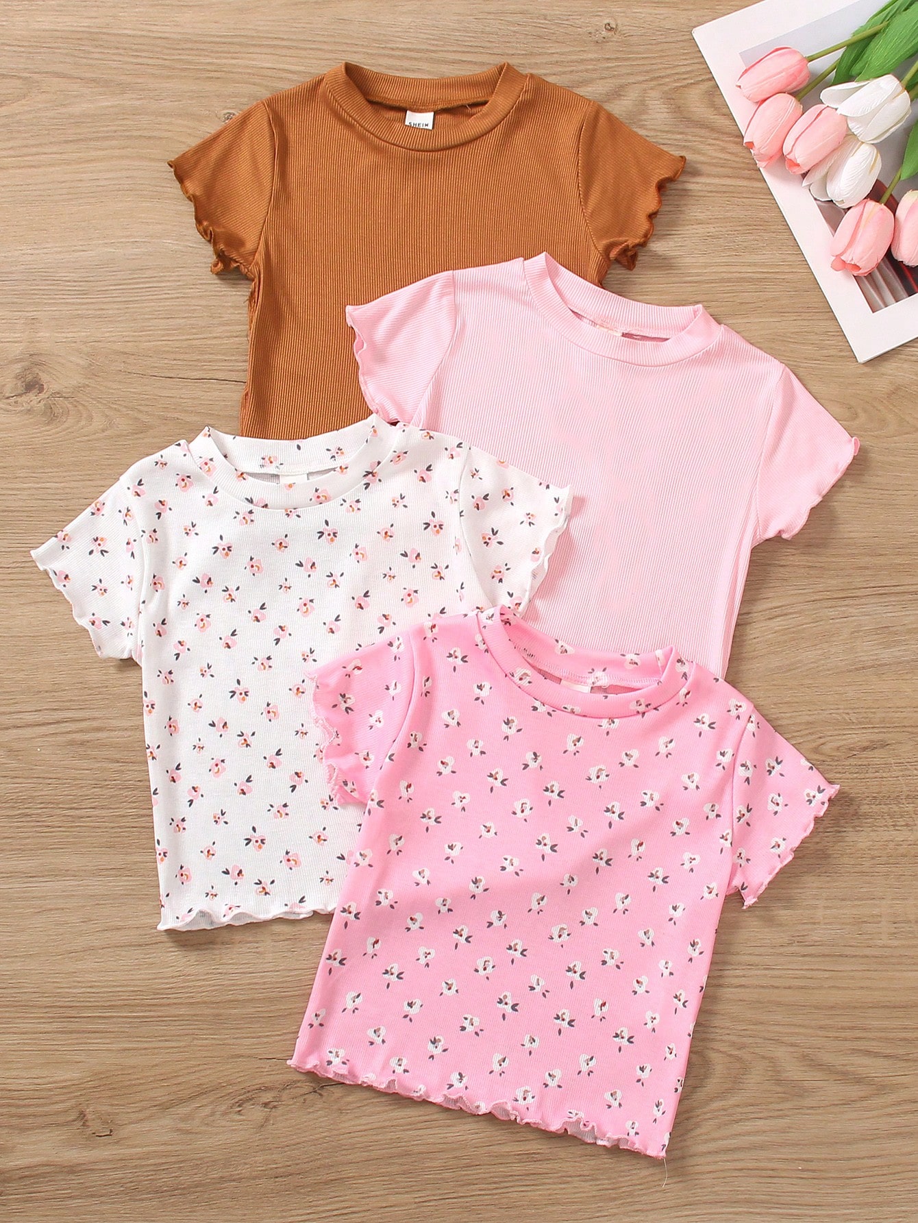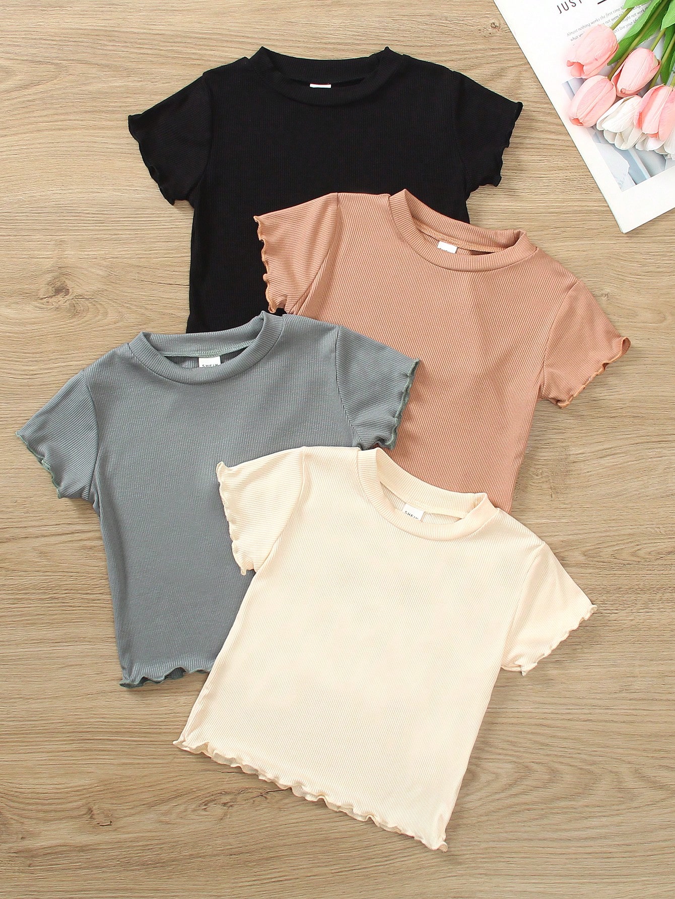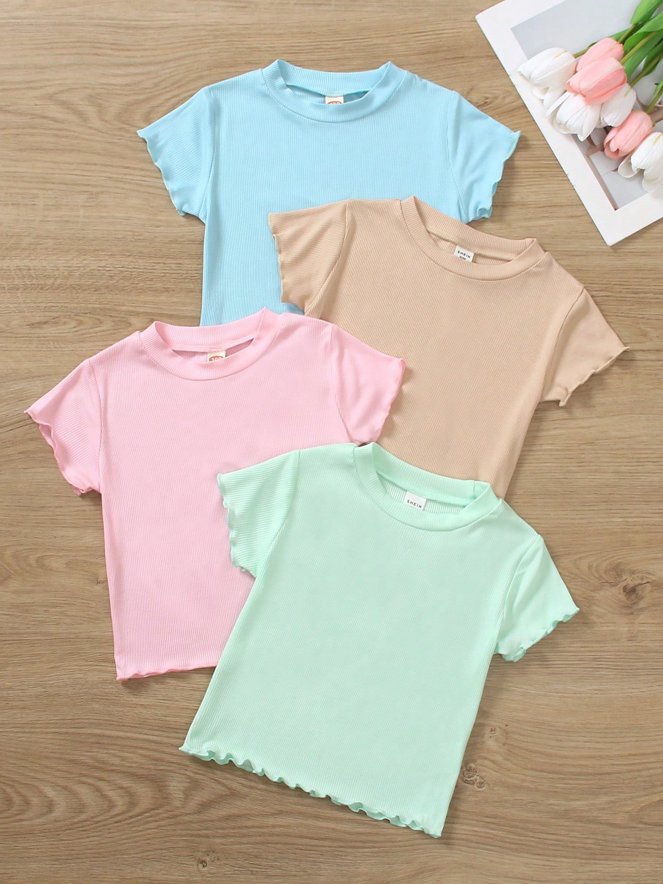 SHEIN Young Girls 4pcs Solid & Heart Print Lettuce Trim Tee For Summer Summer Holiday