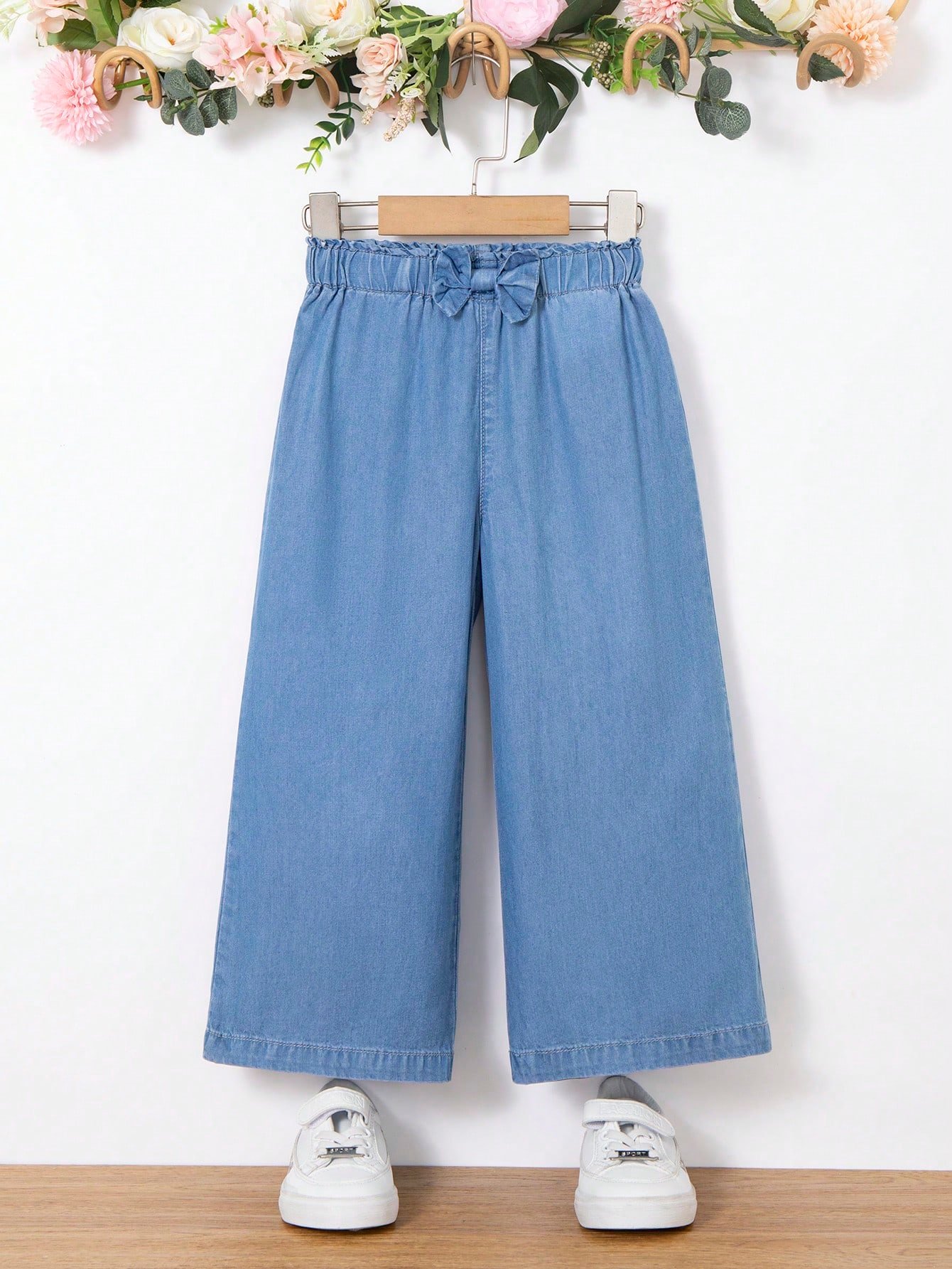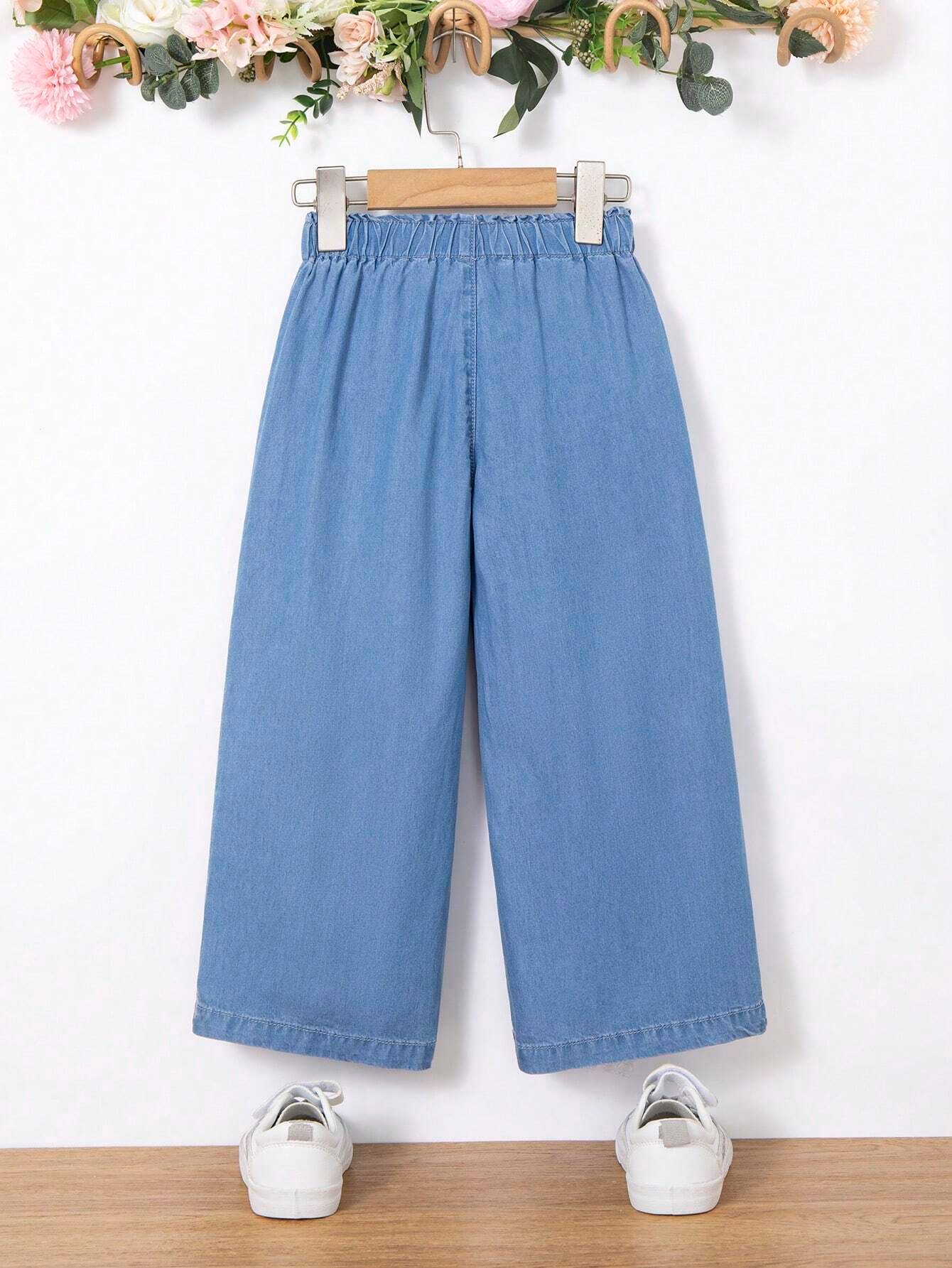SHEIN Young Girls' Denim Effect Blue Jeans,Summer Boho Denim Wide-Leg Pants