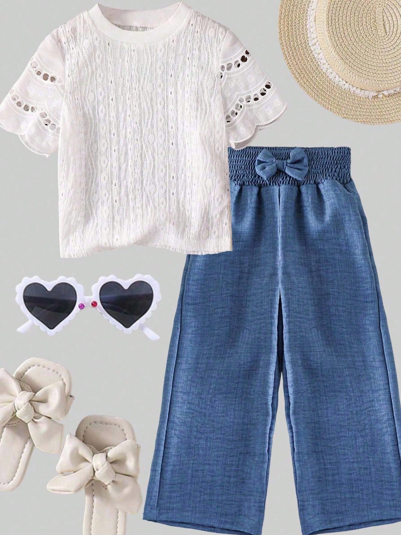 SHEIN Young Girls Small Size Blue Fabric Cable Knit Waistband Cute 3D Bow Decor Casual Pants