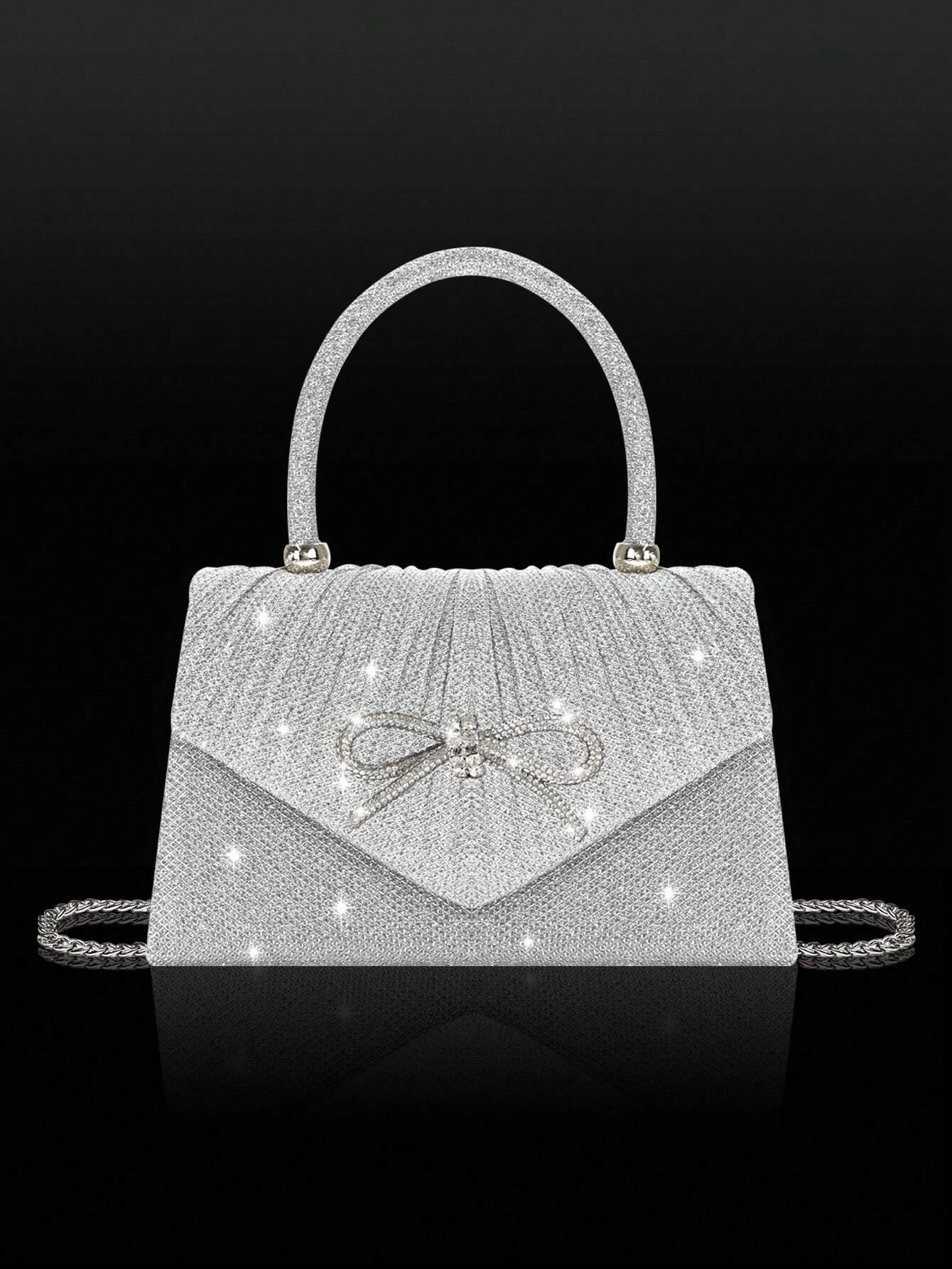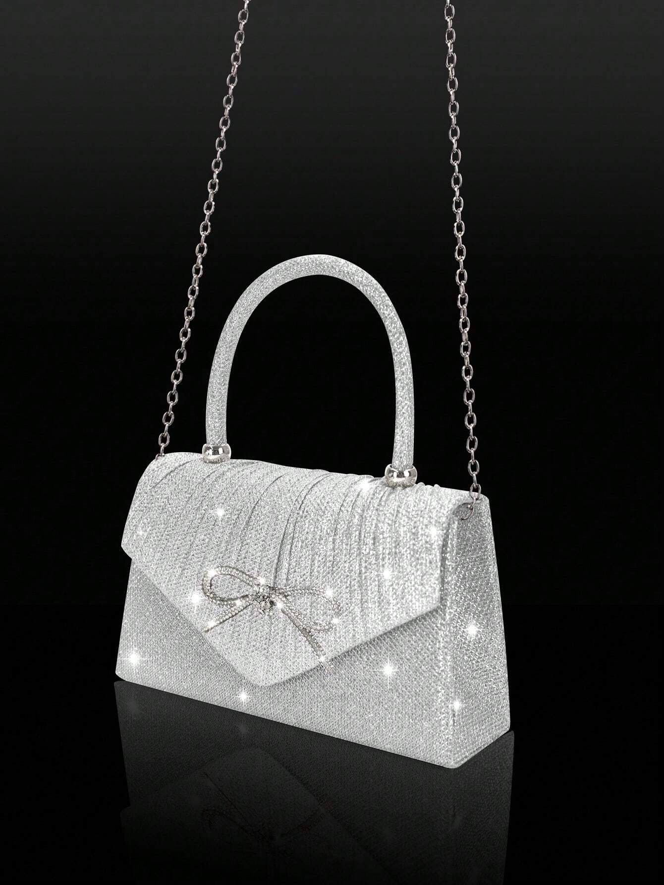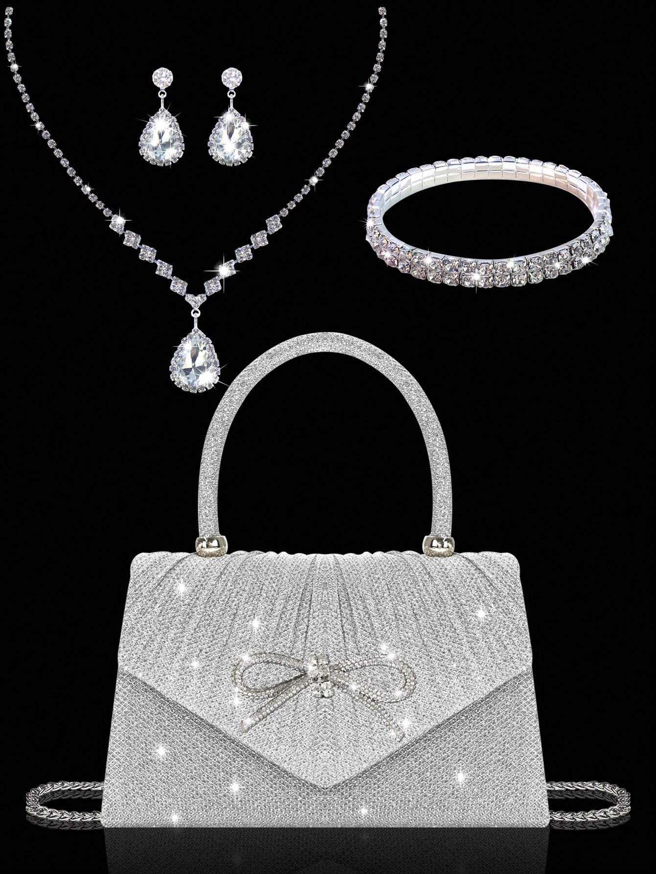 Shiny And Elegant Mini Bow Women's Evening Bag, Paired With Exquisite And Luxurious Rhinestone Bracelet, Necklace And Earrings Four-Piece Set, Simple And Fashionable Solid Color Pleated Flap Handbag, Suitable For Holiday Parties, Dances, Gatherings, Banqu
