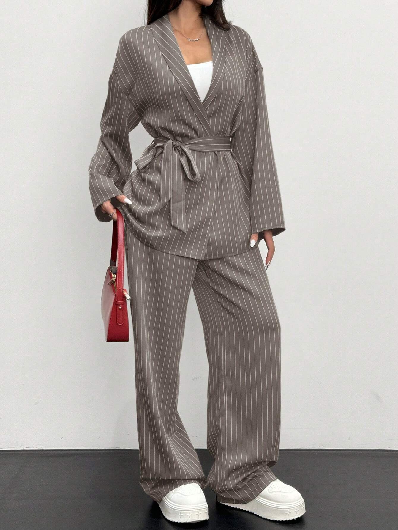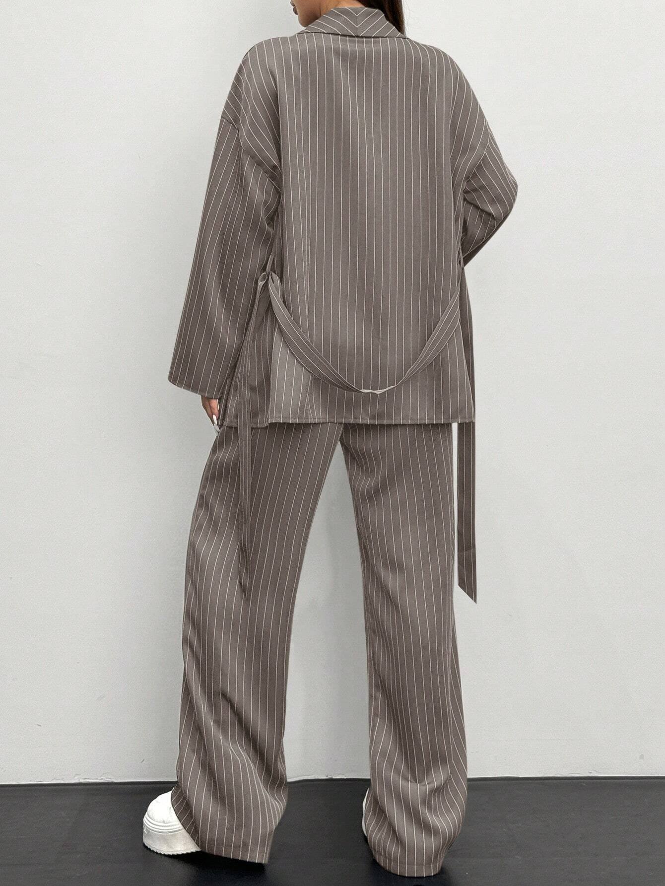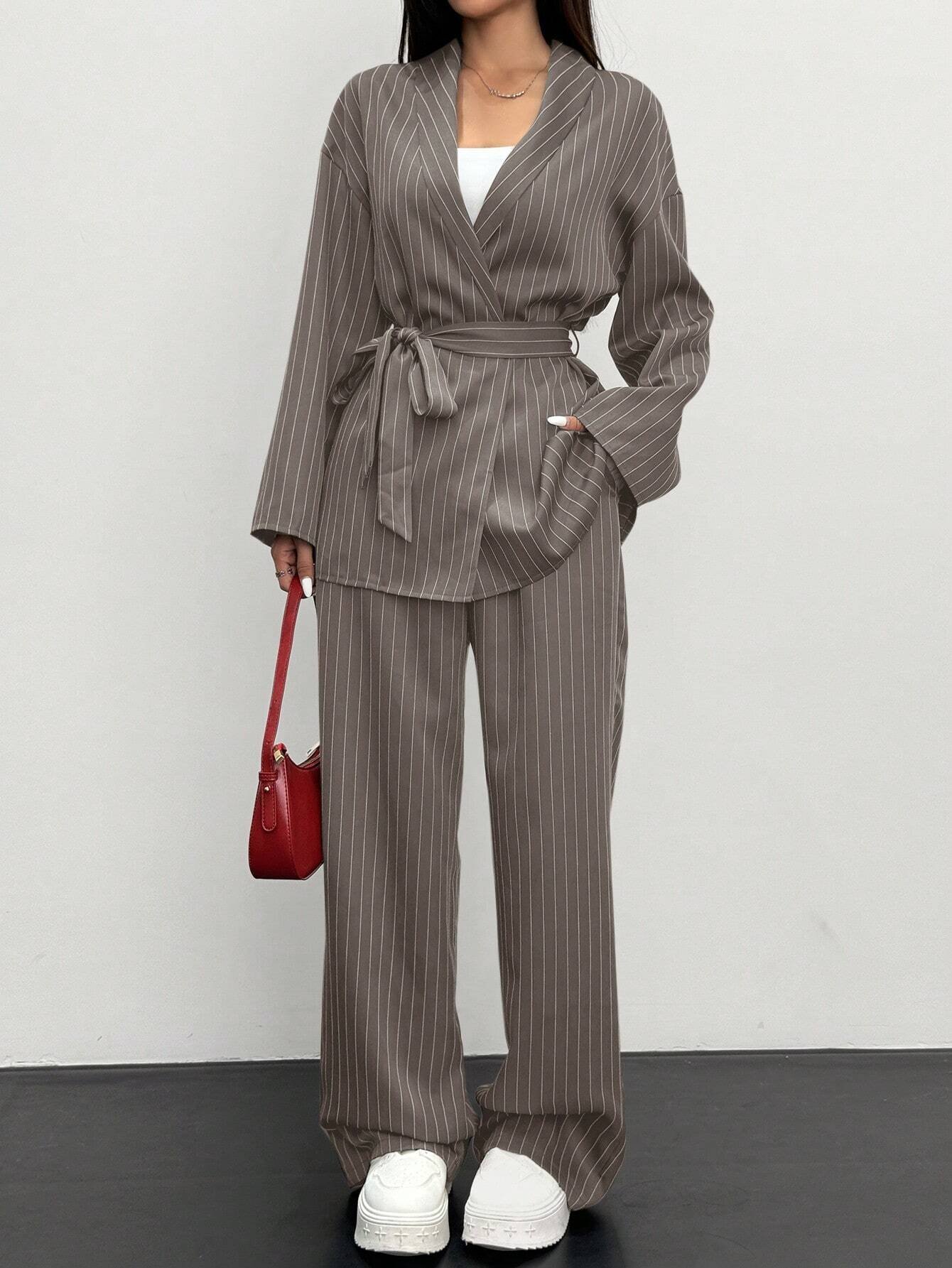 Siren Gaze 2pcs Women Striped Wrap Casual Kimono Suit Set, Grey, Office Lady Fashion Business Attire In Fall/Winter Brown
