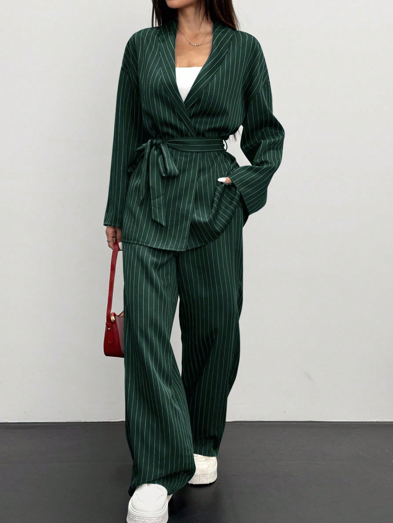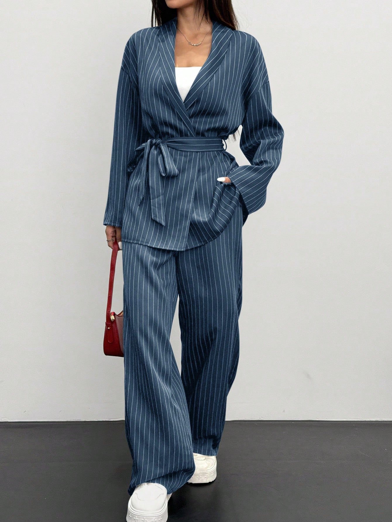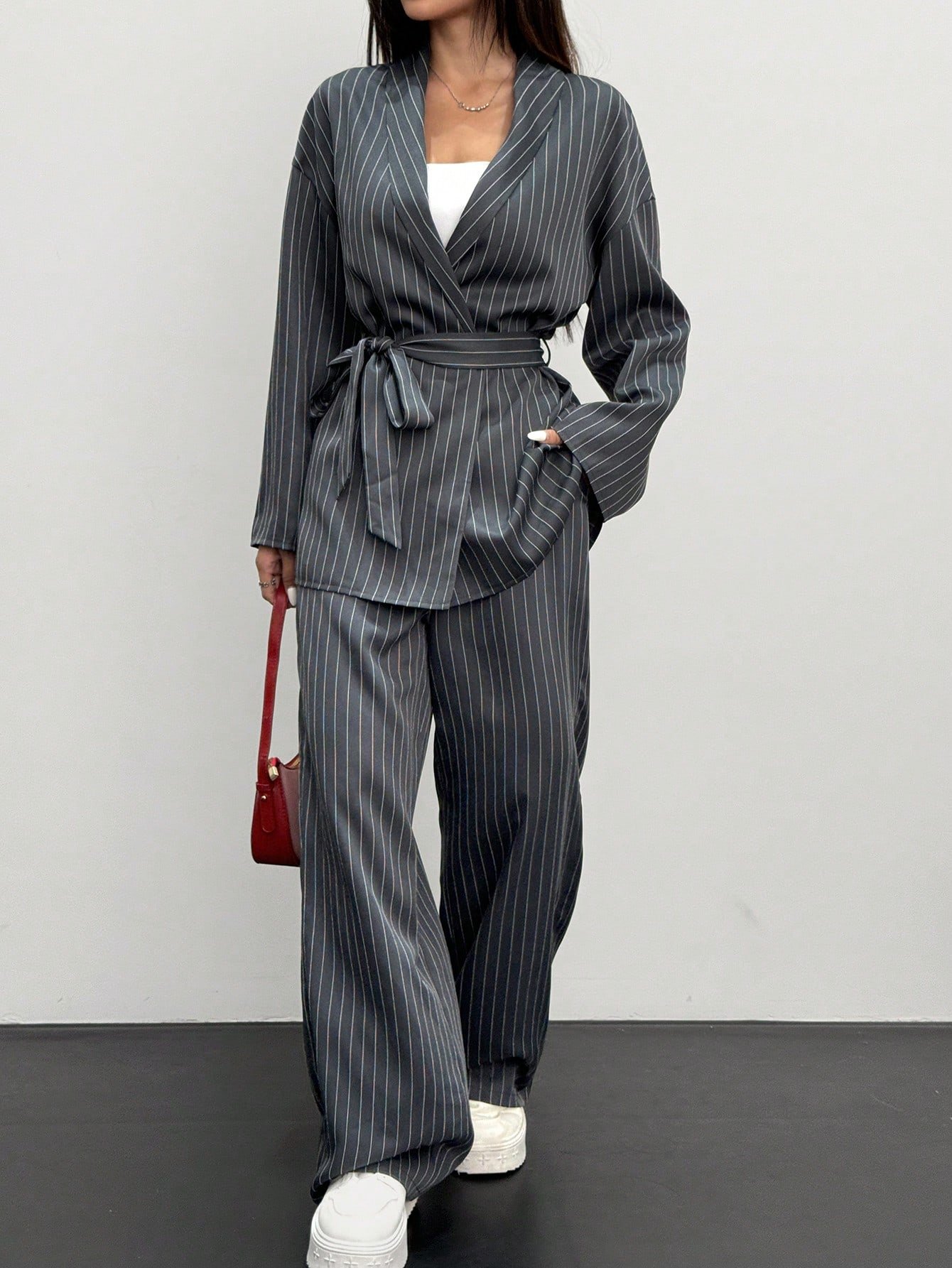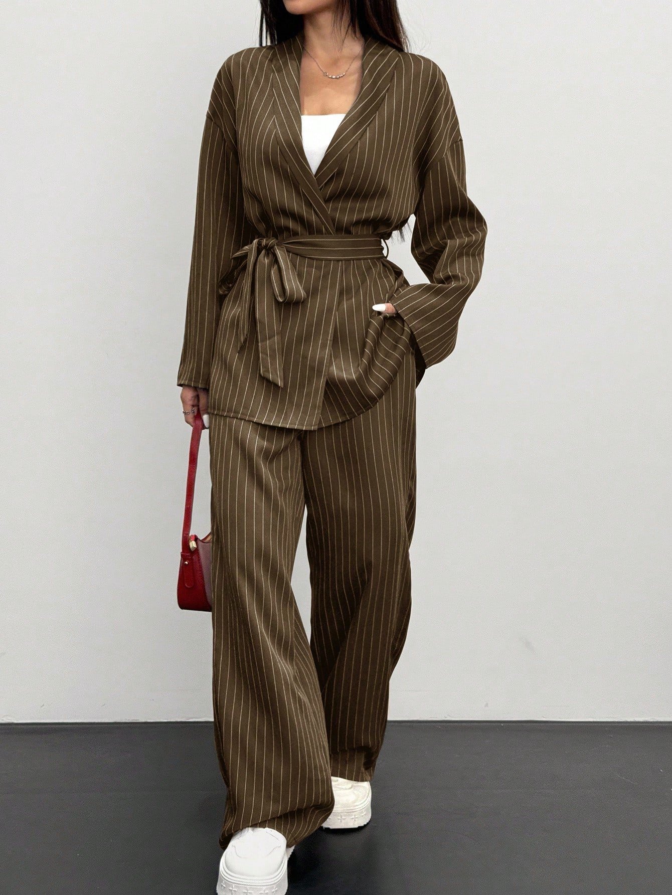 Siren Gaze 2pcs Women Striped Wrap Casual Kimono Suit Set, Grey, Office Lady Fashion Business Attire In Fall/Winter Brown