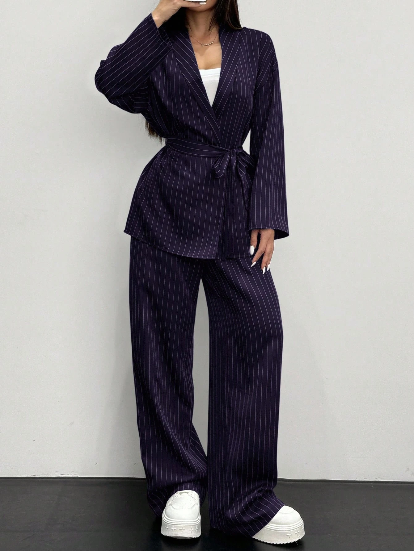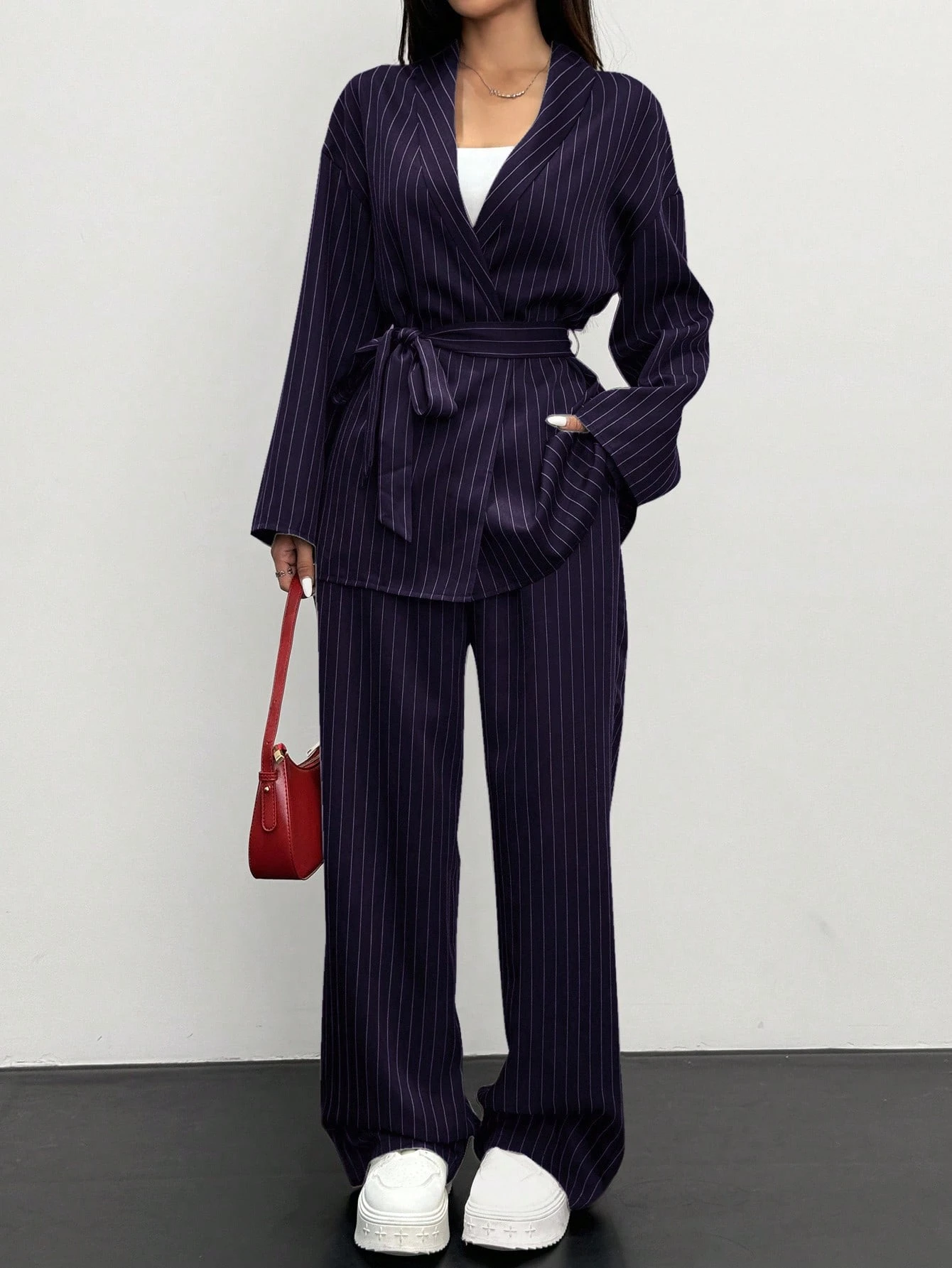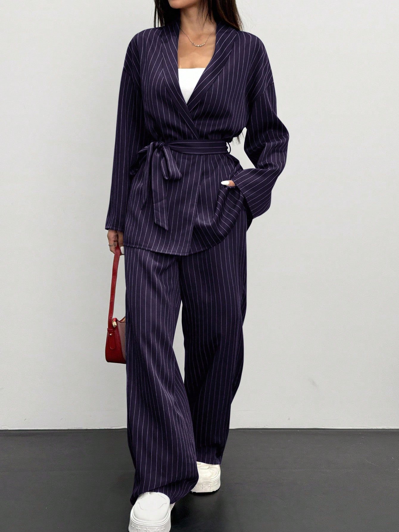 Siren Gaze Women Fashion Striped Wrap Jacket And Casual Pants 2 Pieces Set, Office Business Commute Suit, In Fall/Winter