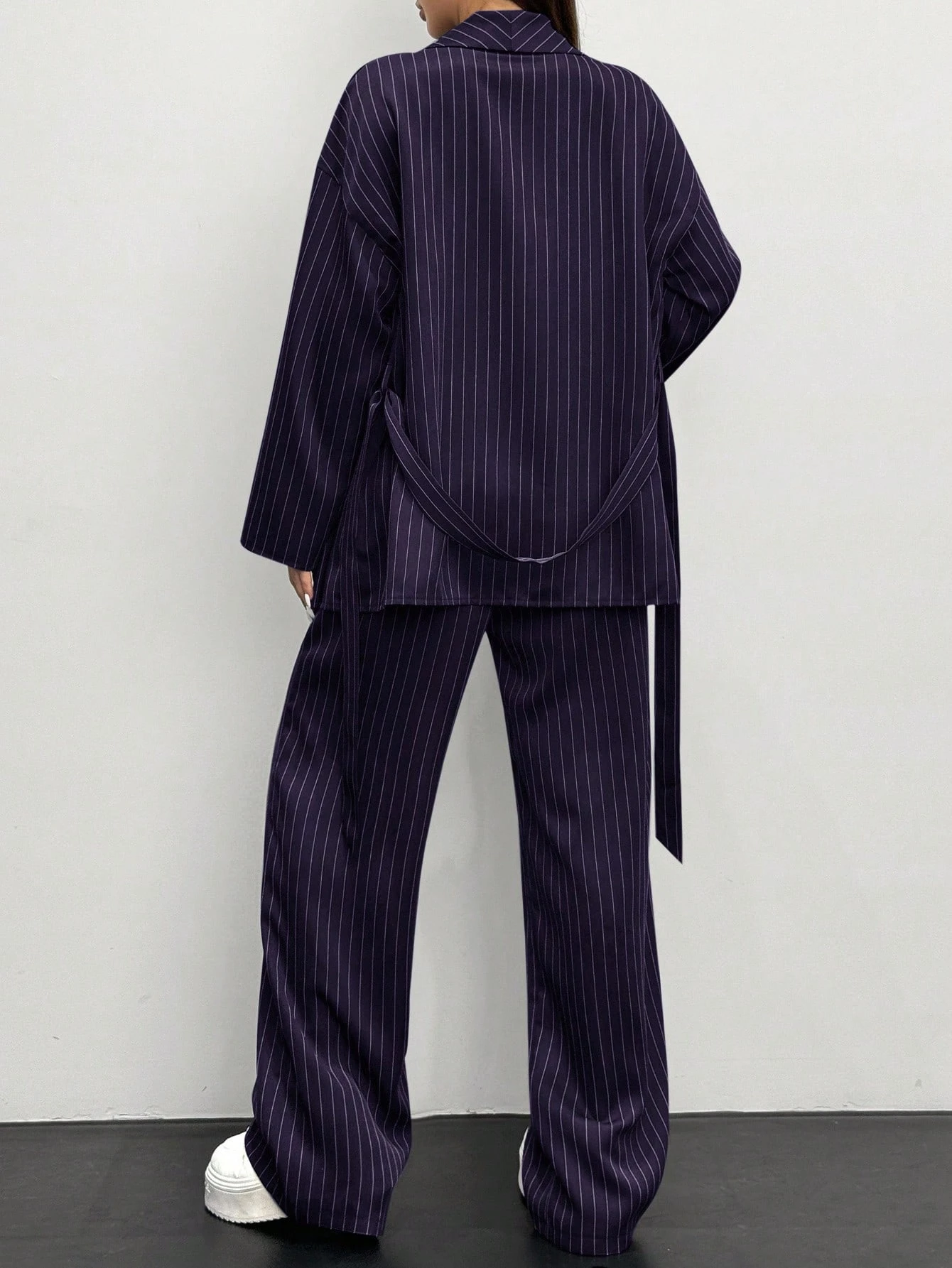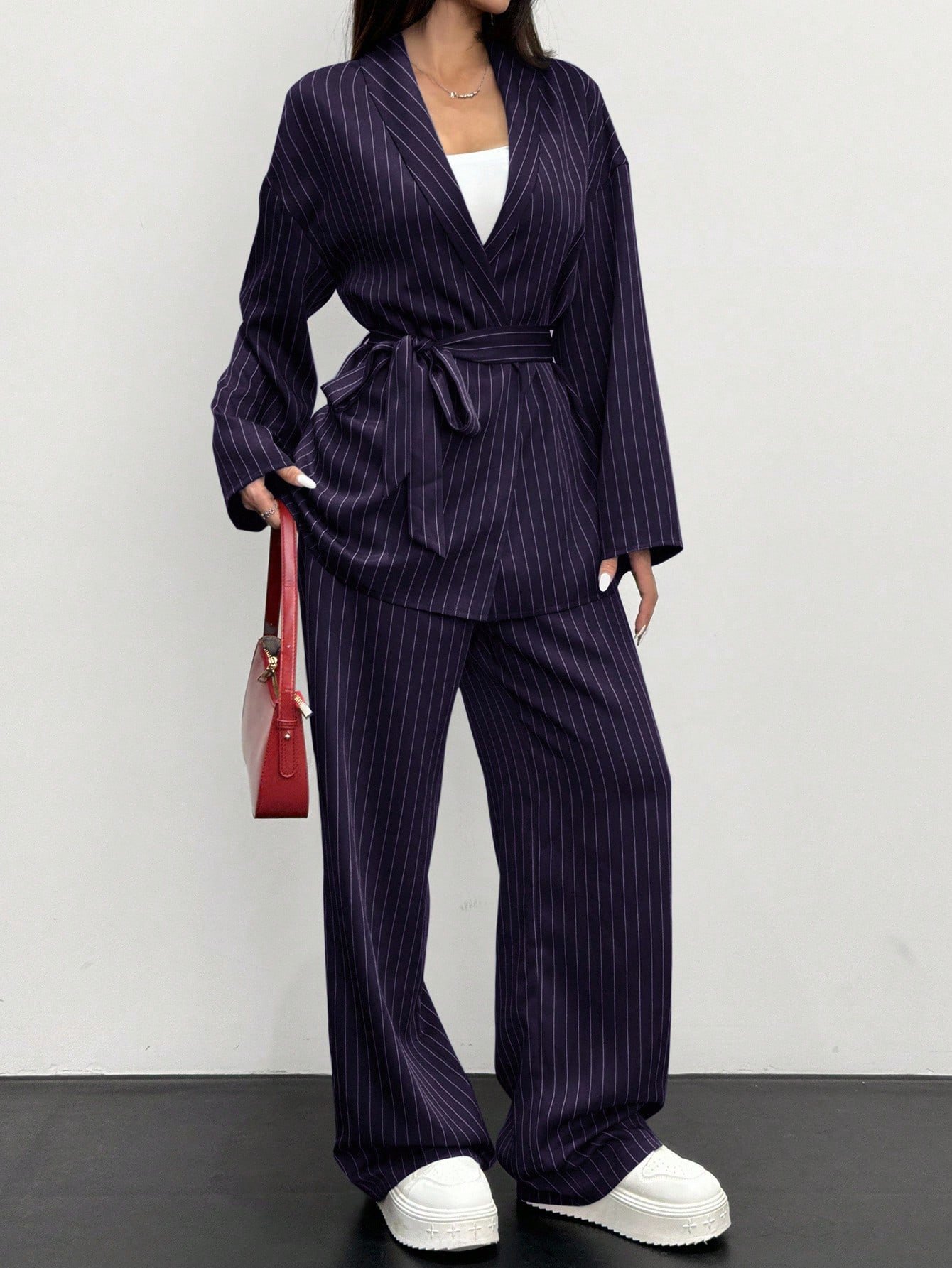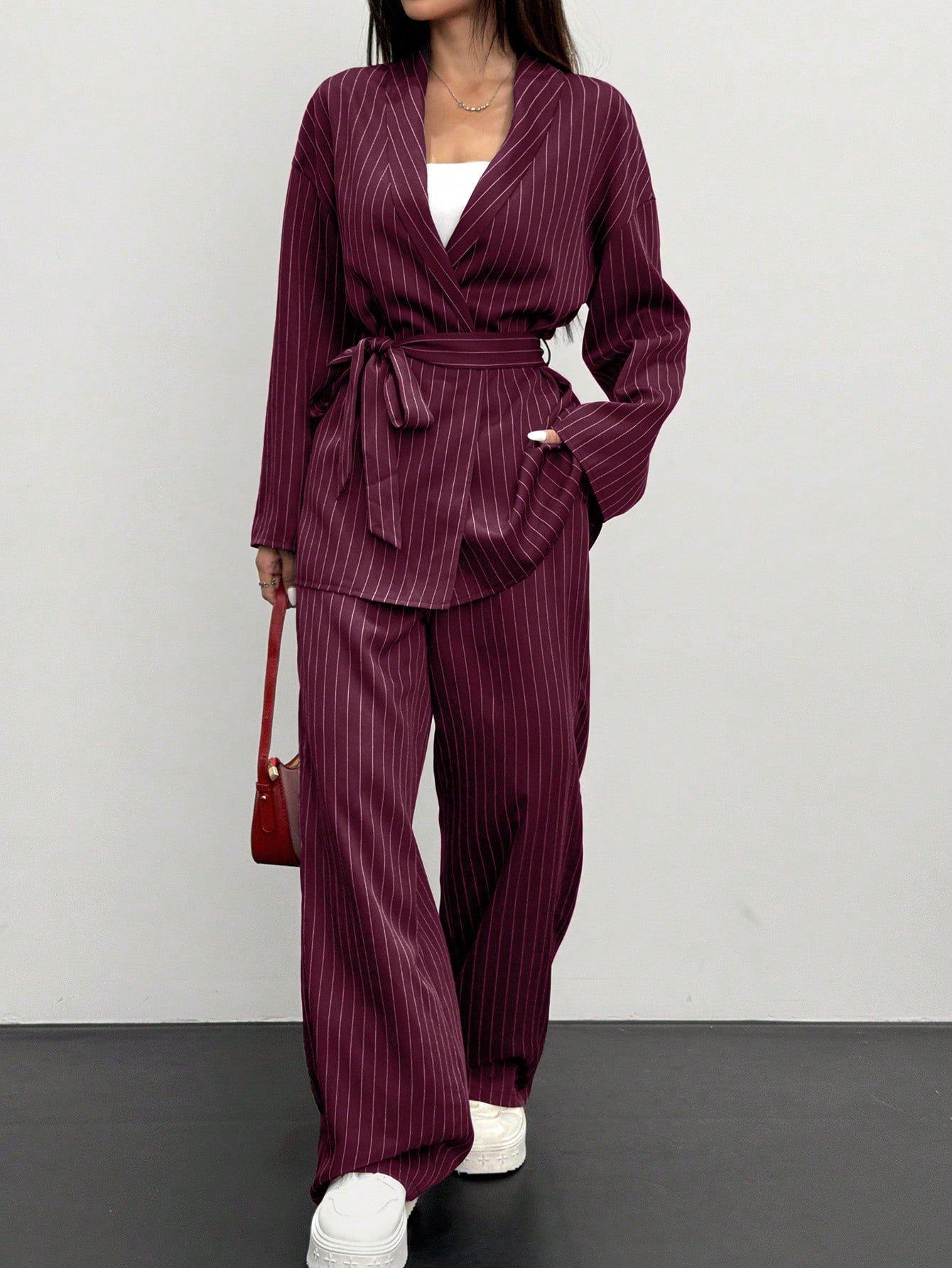 Siren Gaze Women Fashion Striped Wrap Jacket And Casual Pants 2 Pieces Set, Office Business Commute Suit, In Fall/Winter