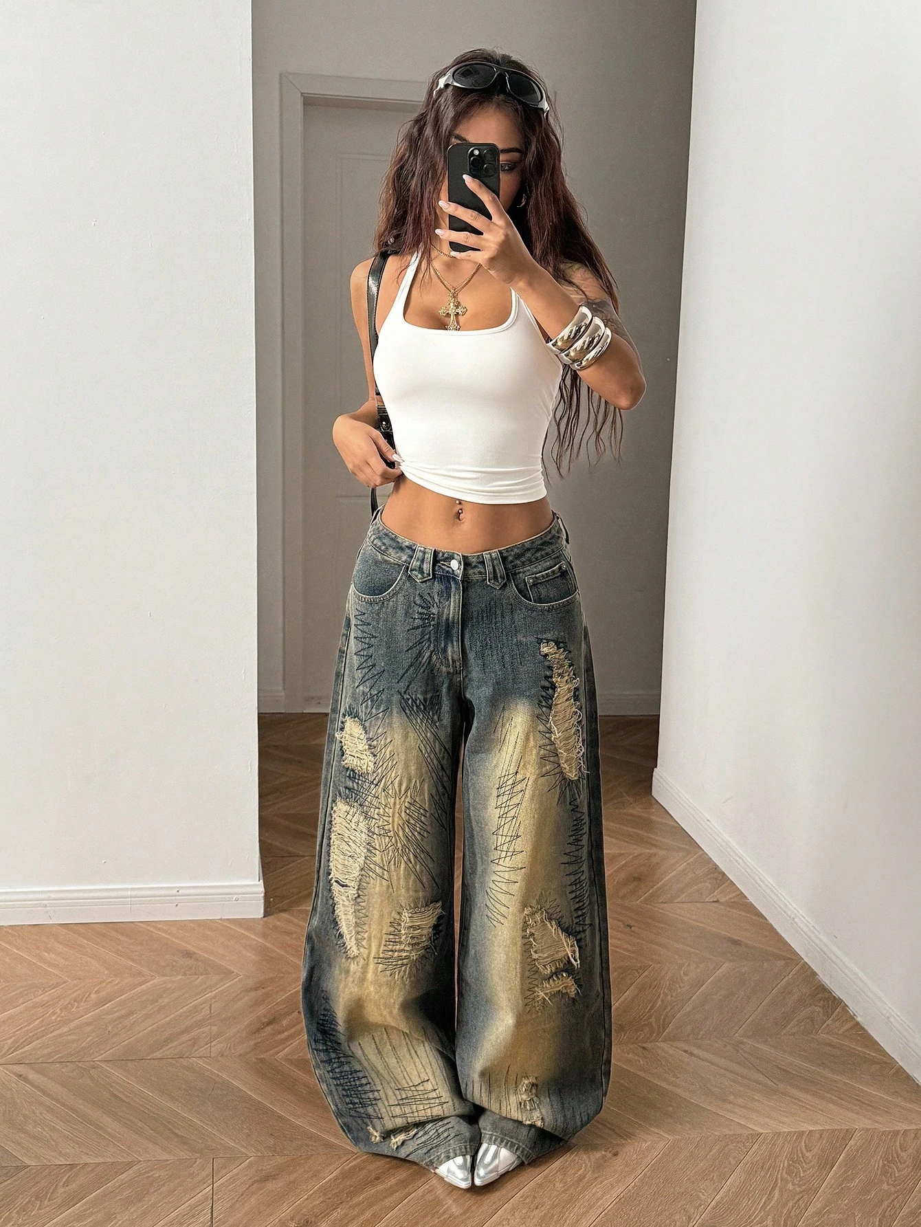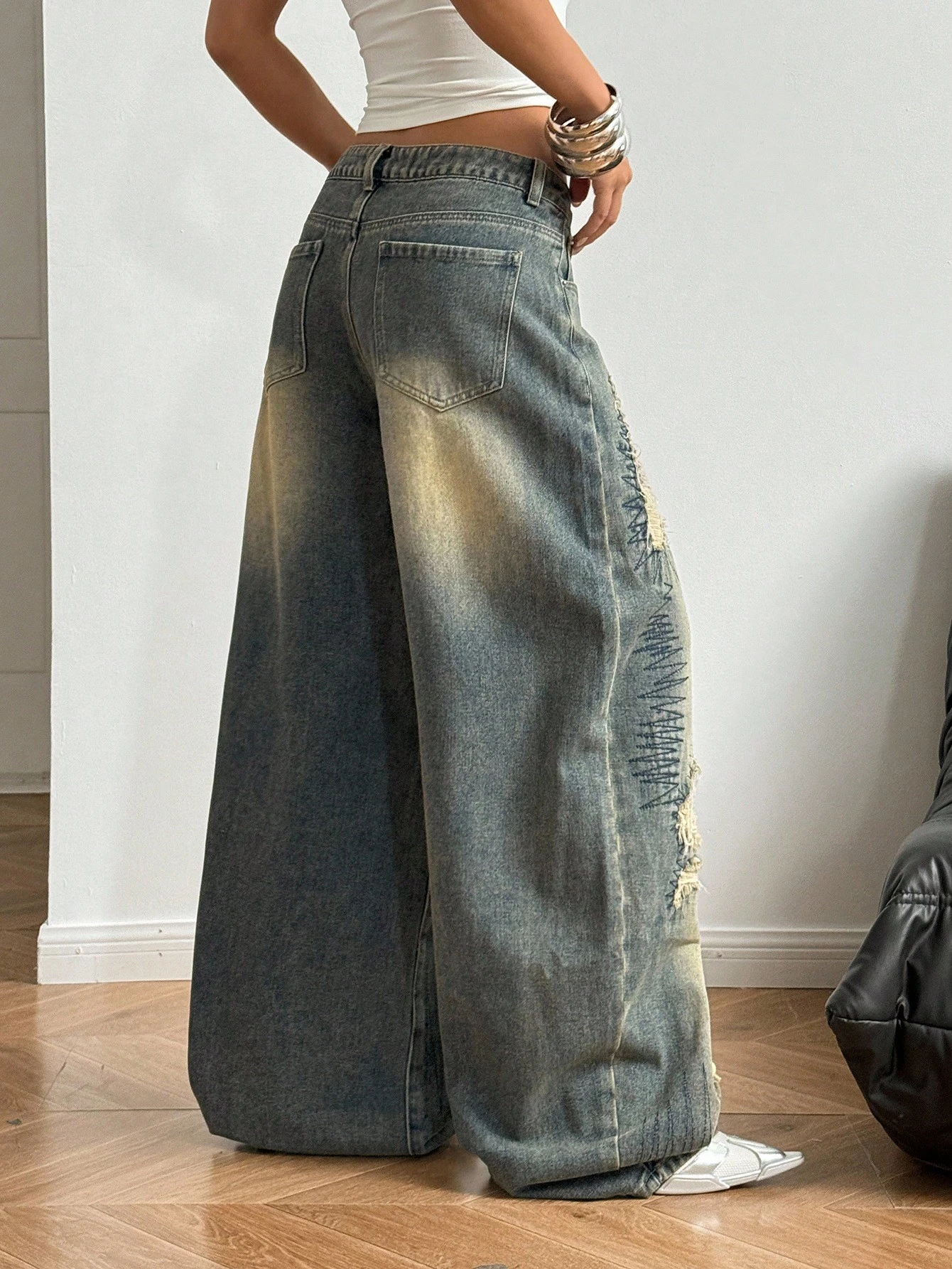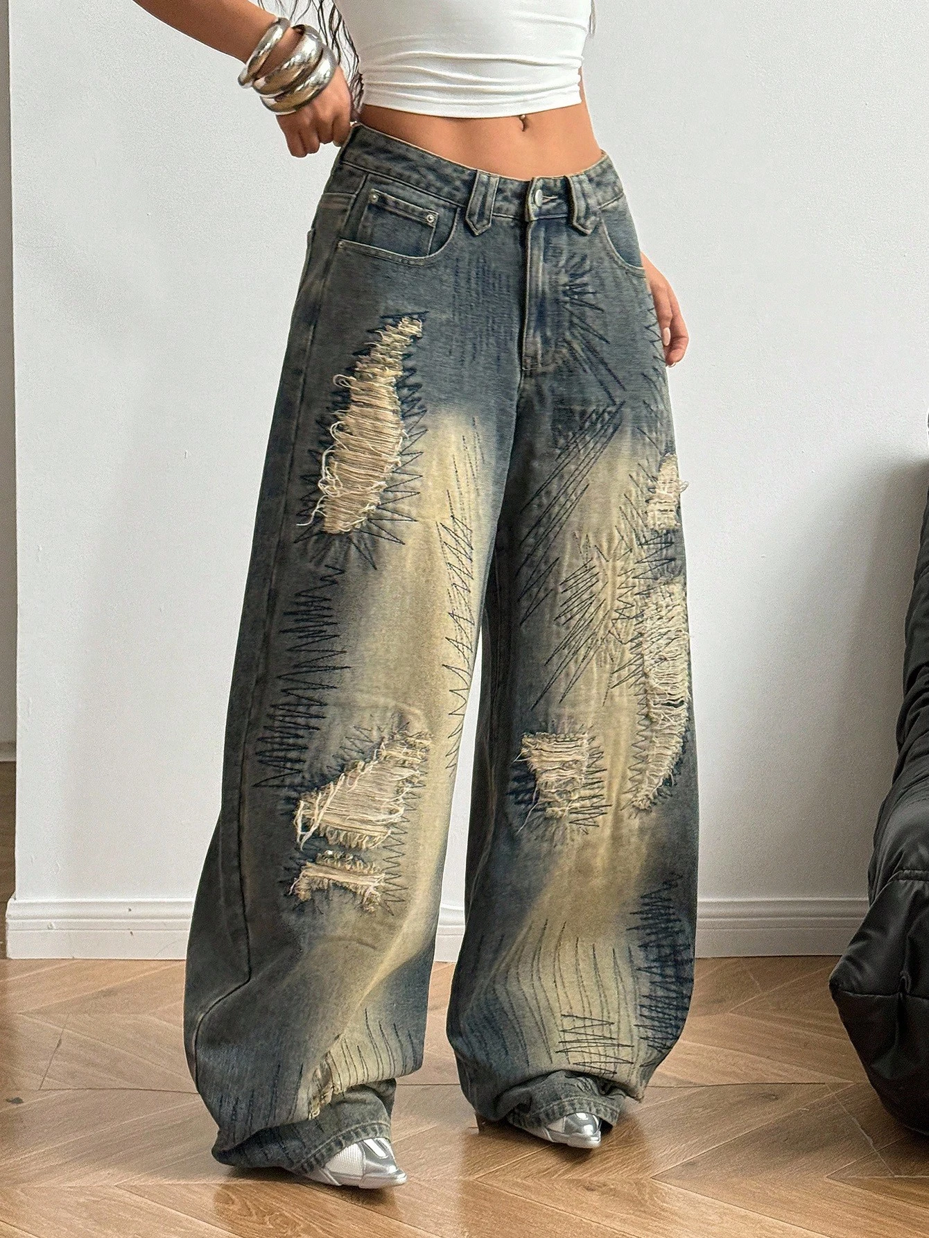 StreetHx Retro Streetwear Style Distressed Embroidered Wide Leg Jeans