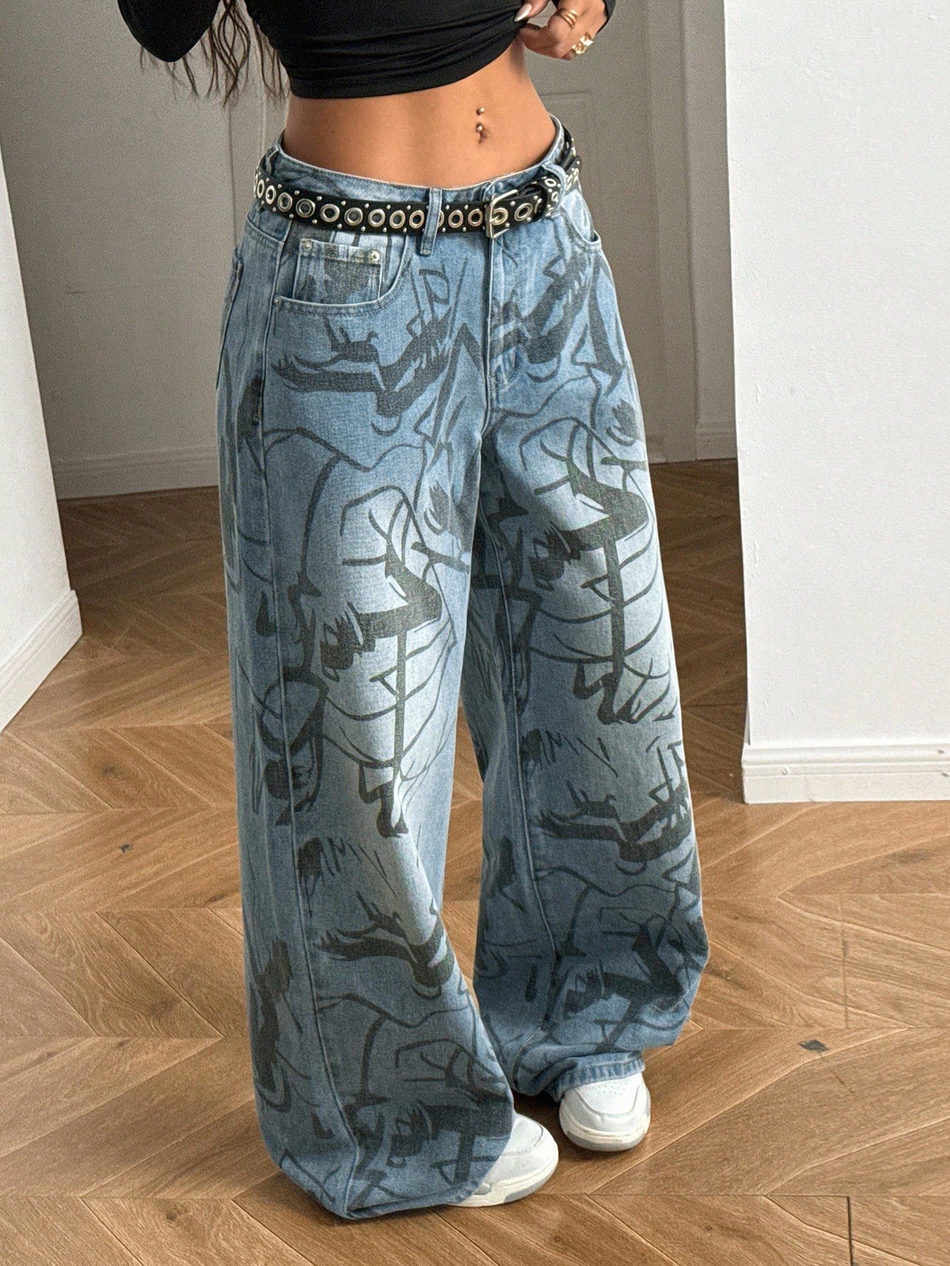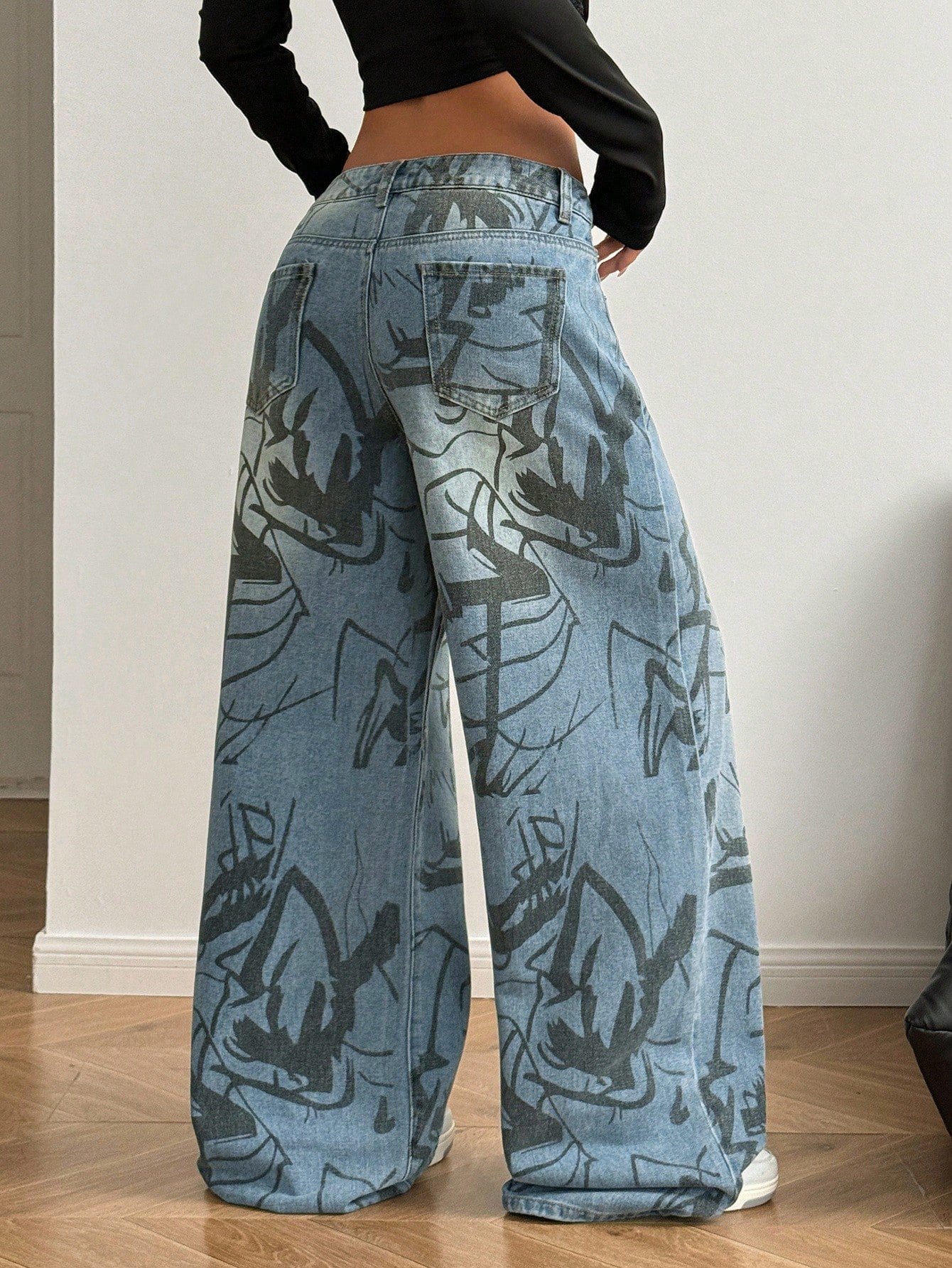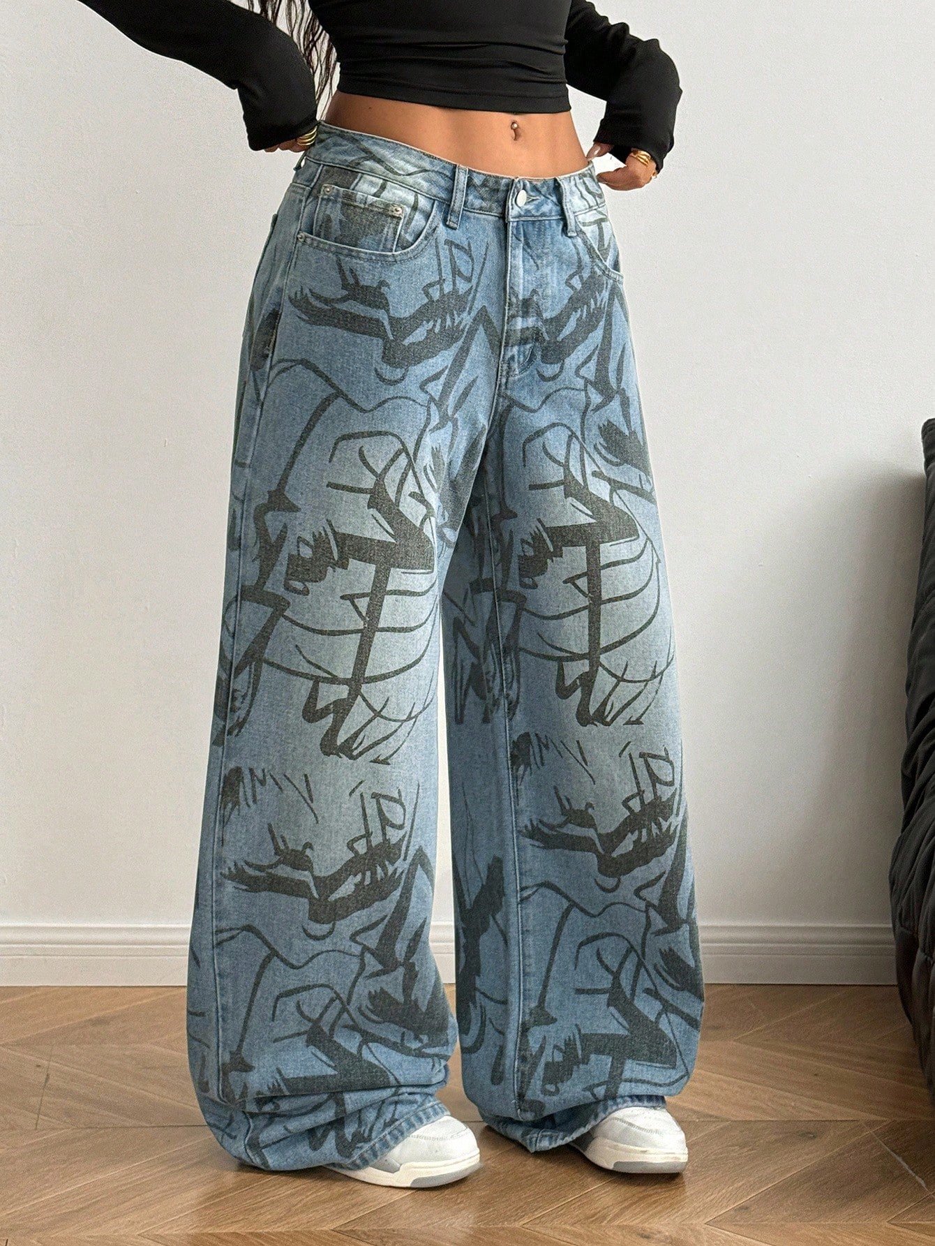 StreetHx Street Style Full Graffiti Print Wide Leg Jeans