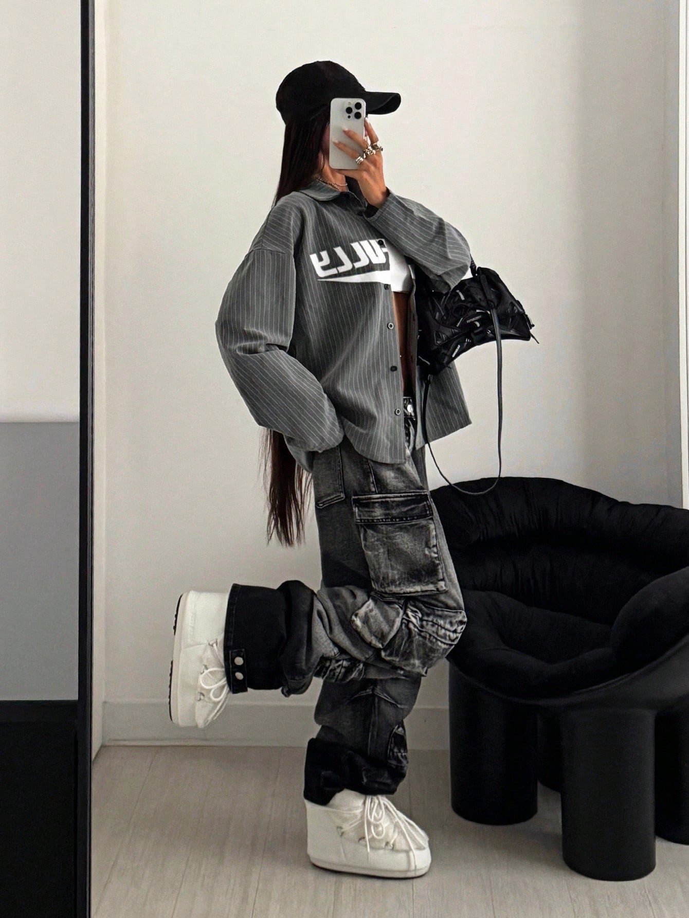 Be the first to review “StreetHx Streetwear Women's Casual Black & White Striped Slogan Print Oversized Long Sleeve Shirt, Autumn” Cancel reply