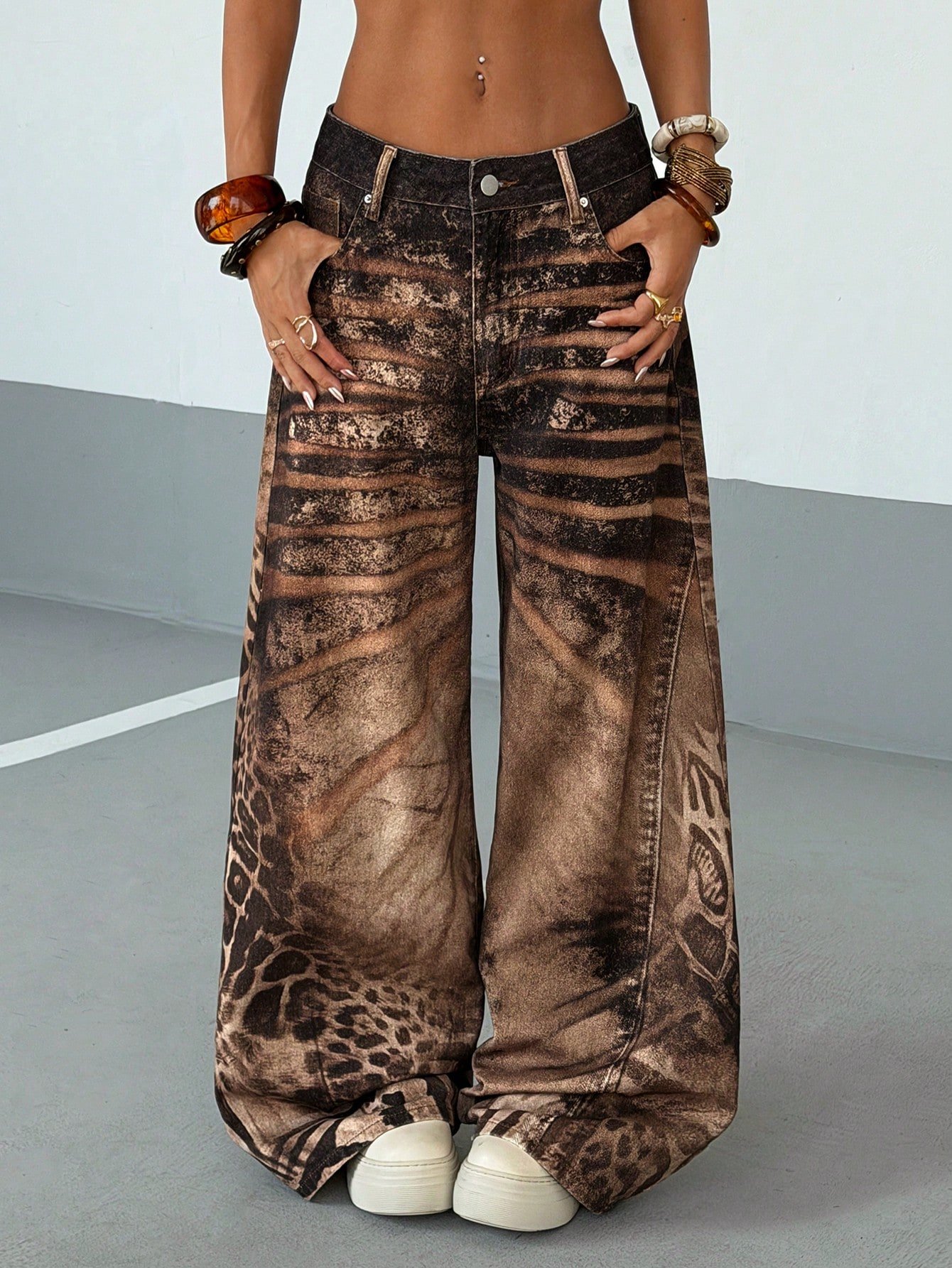 StreetHx Women's Colorblock Leopard Print Slant Pocket Fashion Wide Leg Jeans Printed Jeans Graphic Jeans Bohemian Pants Pants Wide Leg