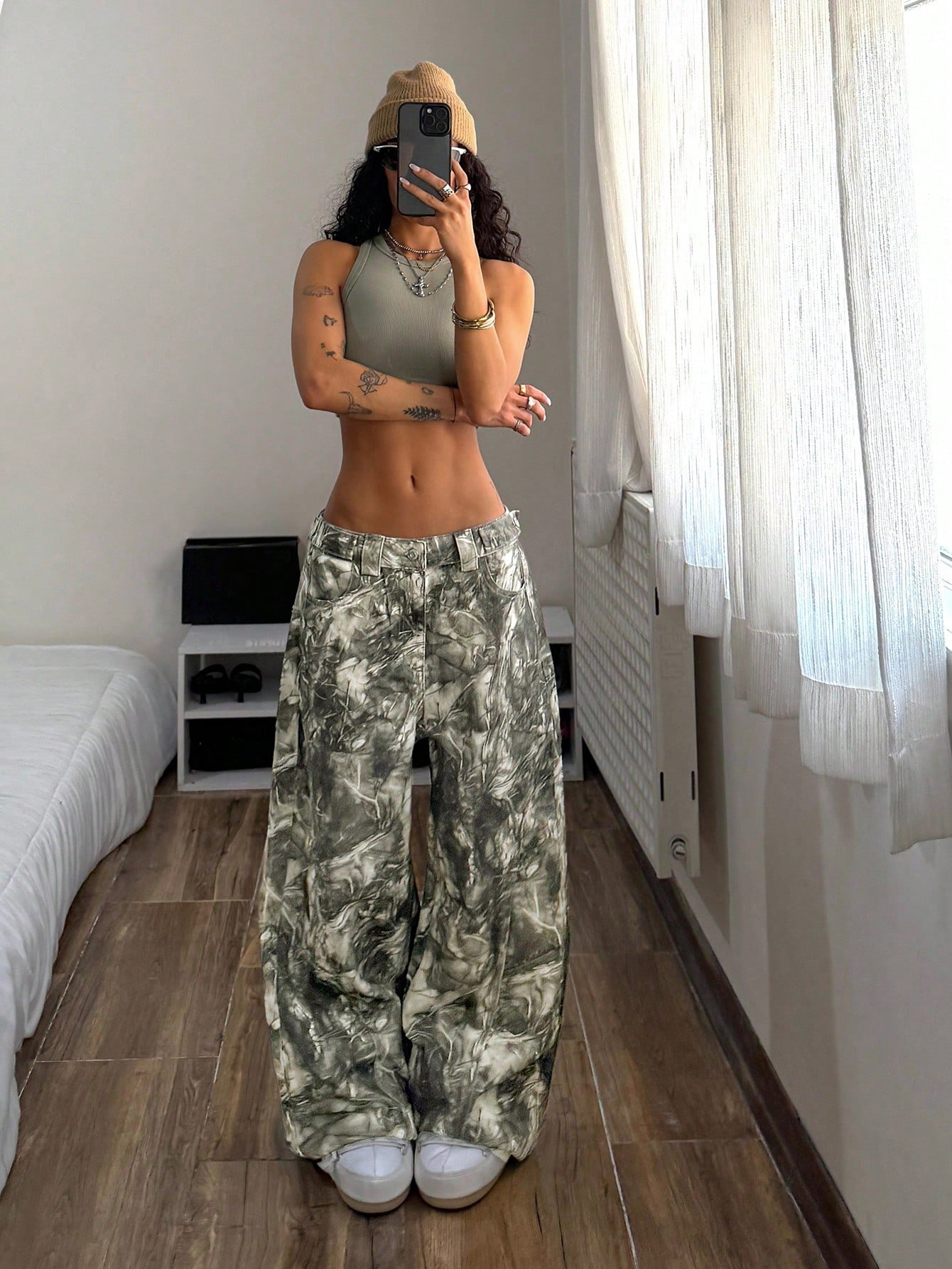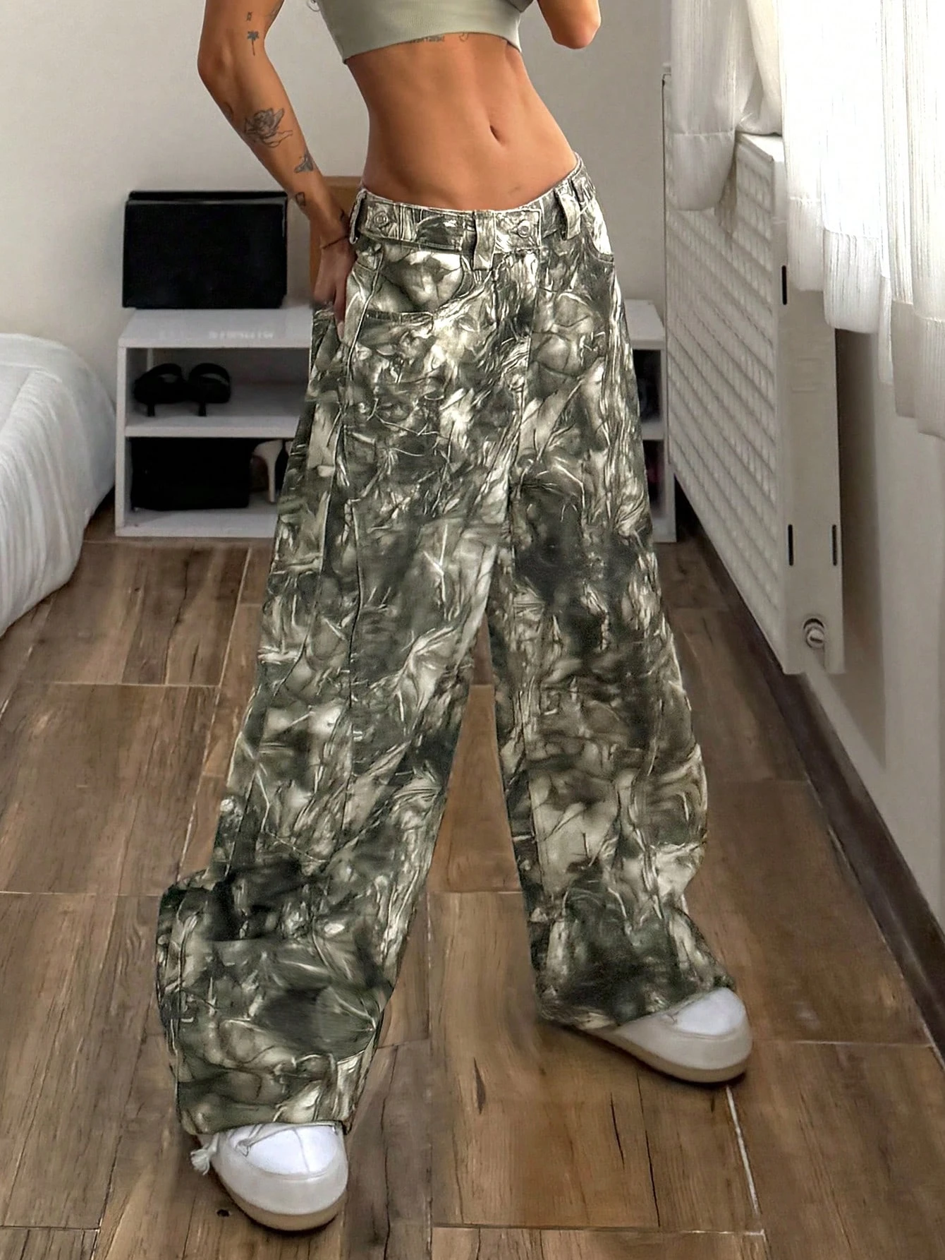 StreetHx Women's Fashion Casual Street Full Print Loose Denim Wide Leg Pants