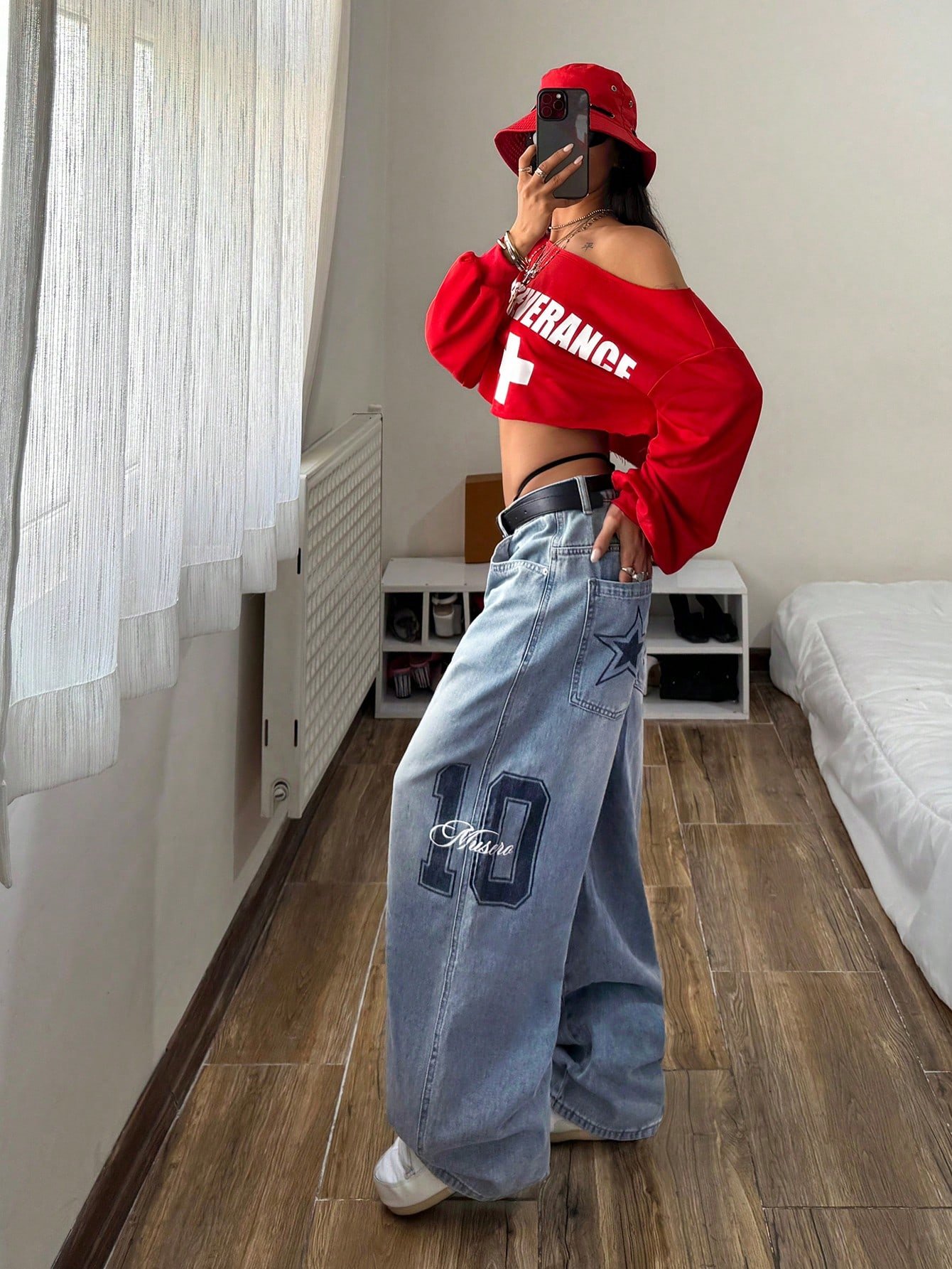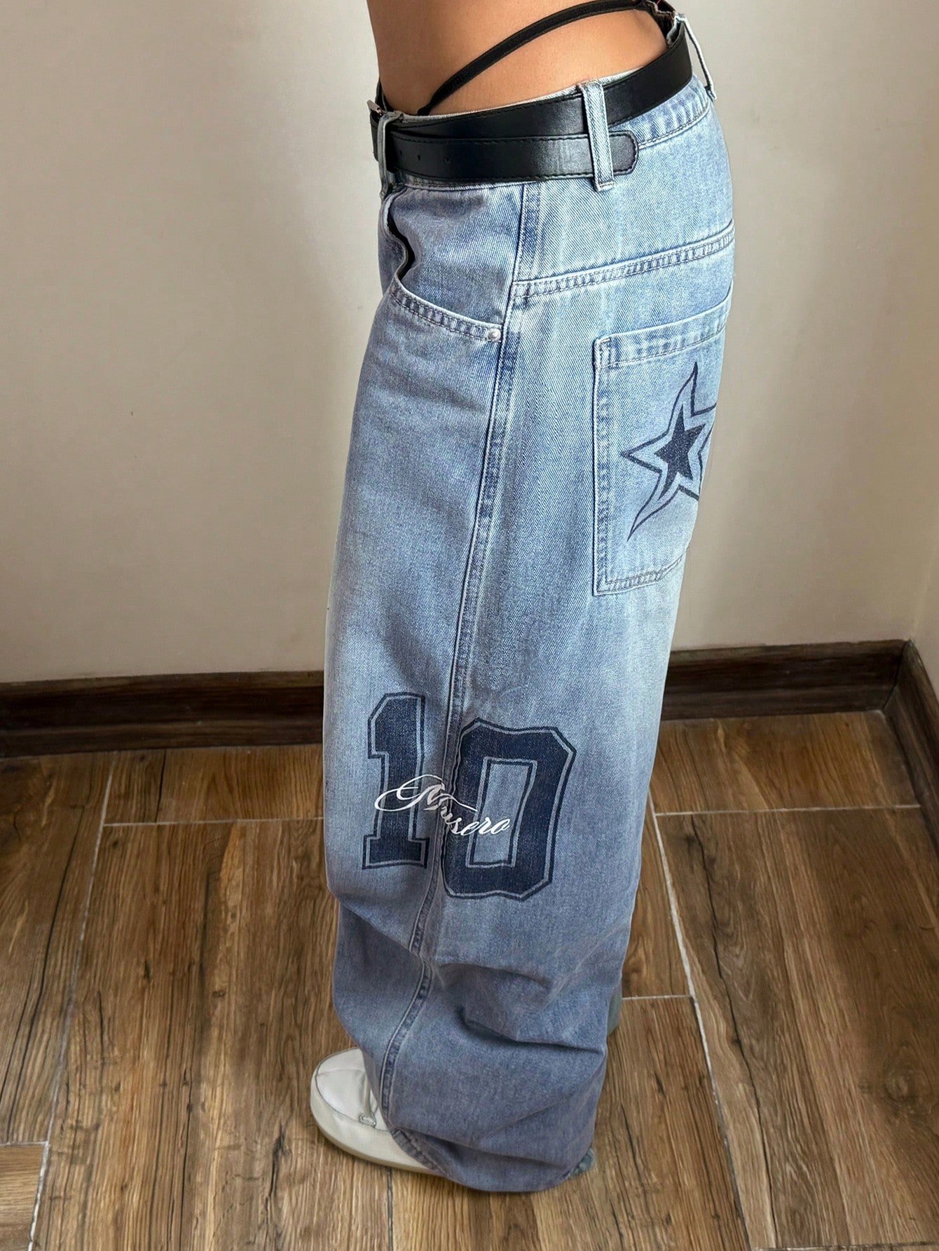 StreetHx Women's Fashionable Casual Street Style Star Print Wide Leg Jeans